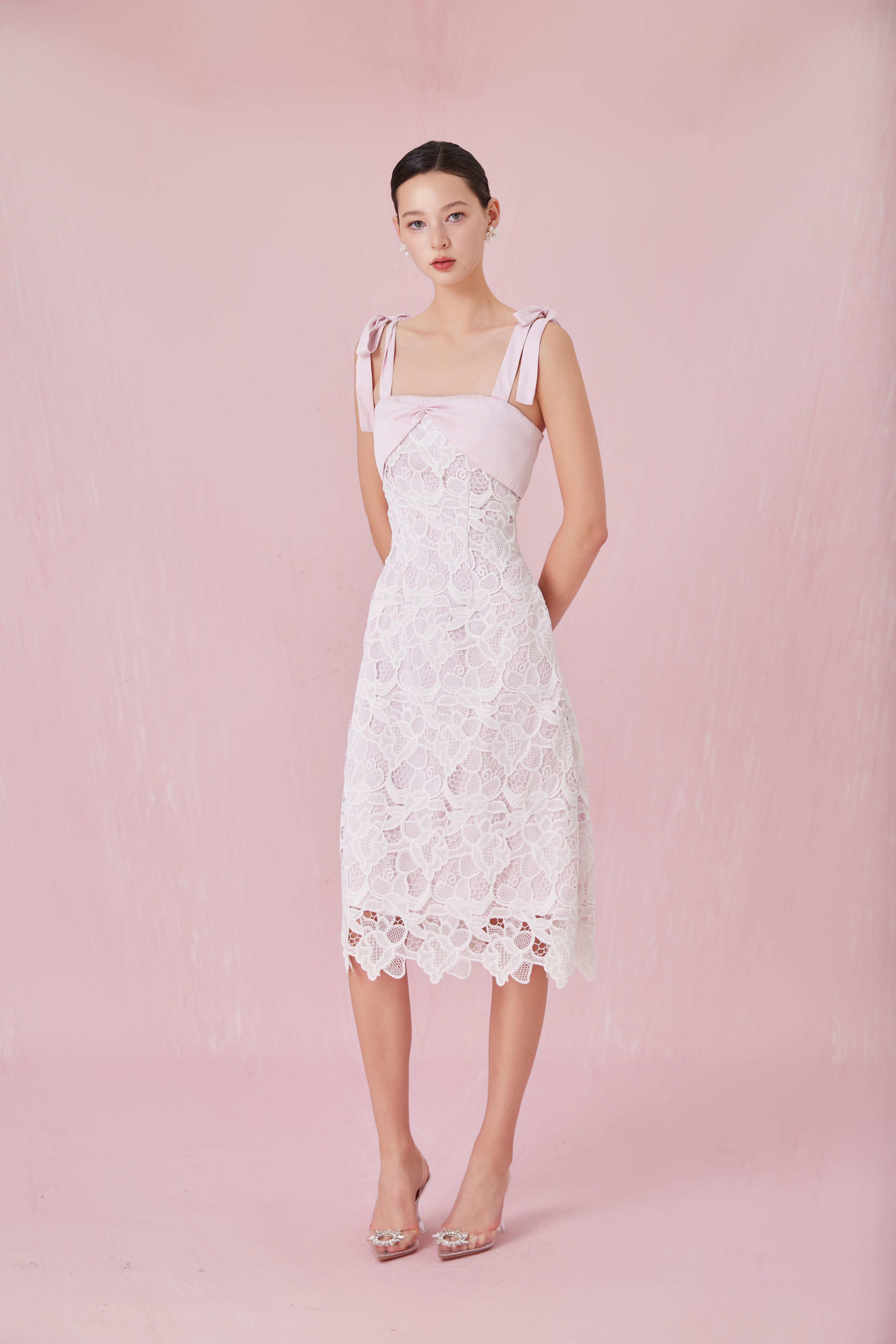 Cerice White Lace Pink Dress showcases a unique mix of media, combining luxurious sateen fabric with delicate crochet for a striking contrast. The functional strap, adorned with a ribbon, adds a playful touch, while the front gather creates a beautiful bow detail that enhances the dress's femininity.