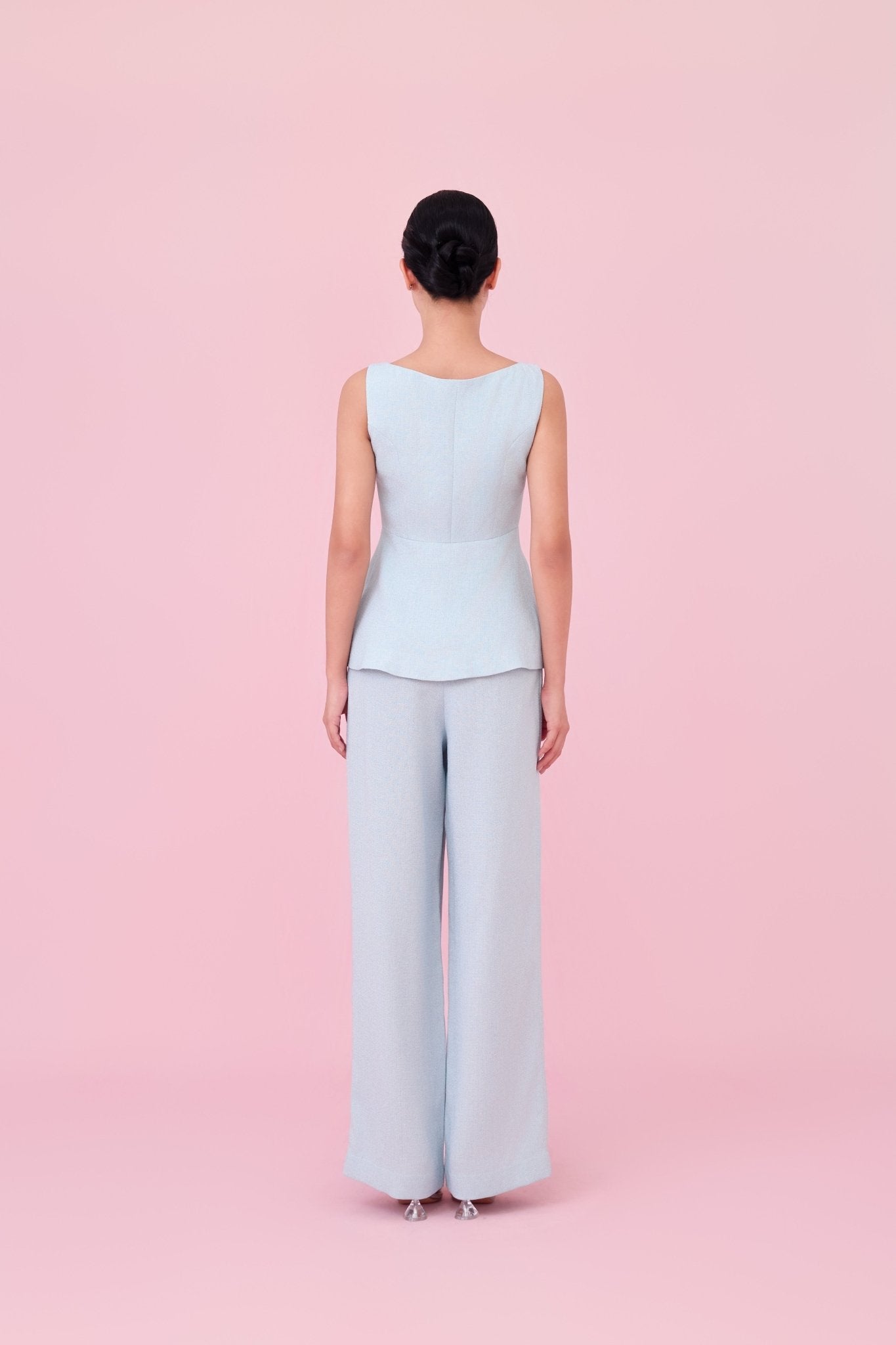 Cherilyn Light Blue Tweed Sleeveless Top with a structured, tailored silhouette. Crafted from high quality tweed fabric, it features a classic front button closure and two functional front pockets for both style and practicality. The sleeveless design and refined detailing give it a polished, timeless look, perfect for smart-casual or elevated everyday wear.