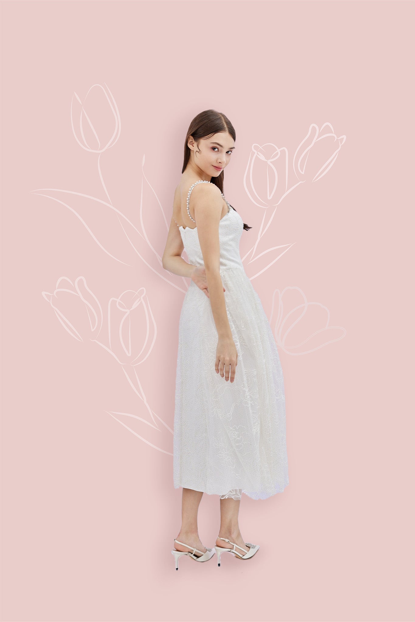 Introducing our Danielle White Long Dress featuring a scallop neckline and embellishment straps adorned with delicate embroidery mesh. This dress is a perfect blend of elegance and charm, designed to make you stand out at any event. The scallop neckline adds a feminine touch, while the embroidery mesh straps add a touch of sophistication.