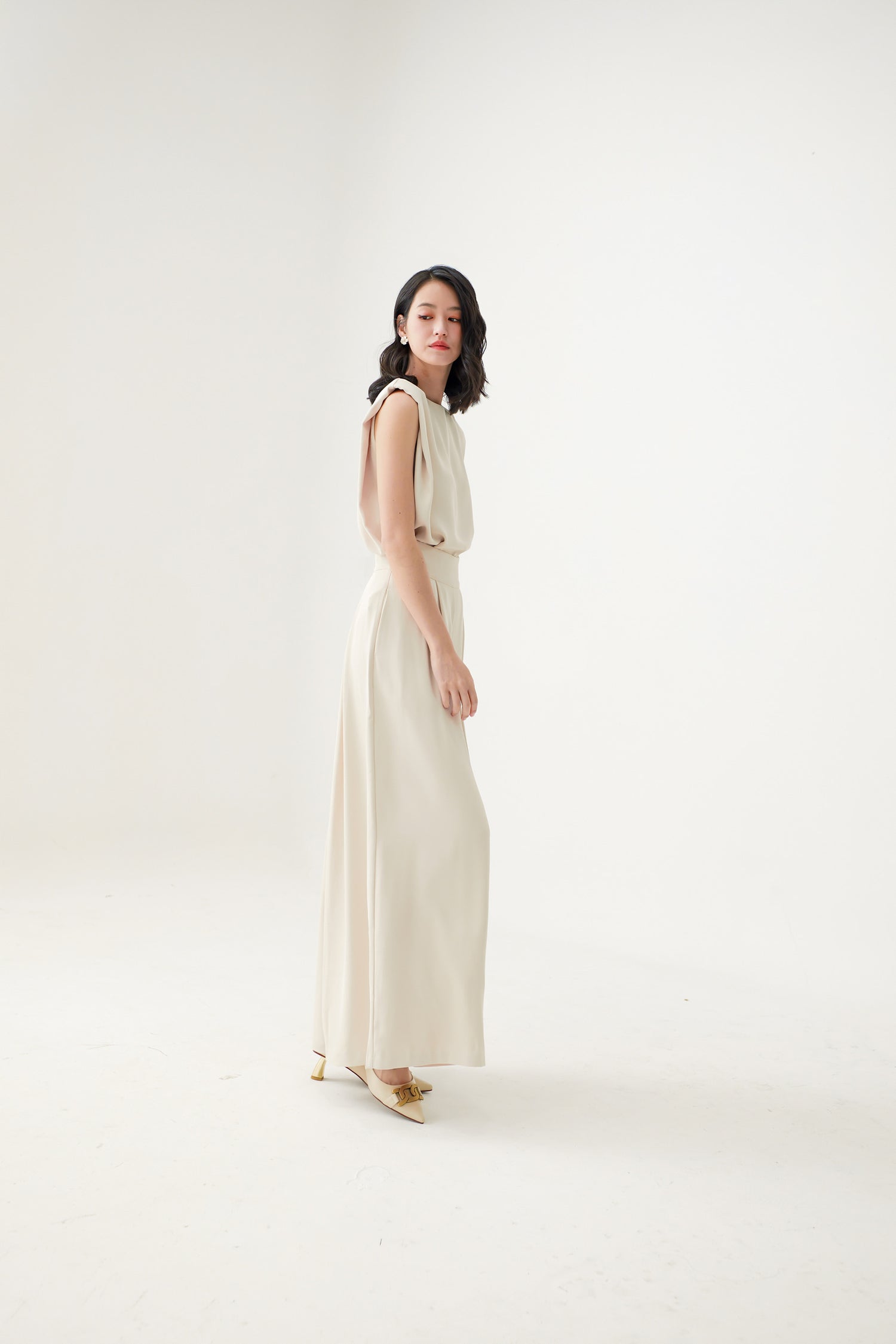 Elyssa round neck and shoulder padded top matches perfectly well with our Elyssa pants that features a classic straight leg silhouette and a thick waistband. Round it off with clean tailored edges. Comes with functional side pockets.