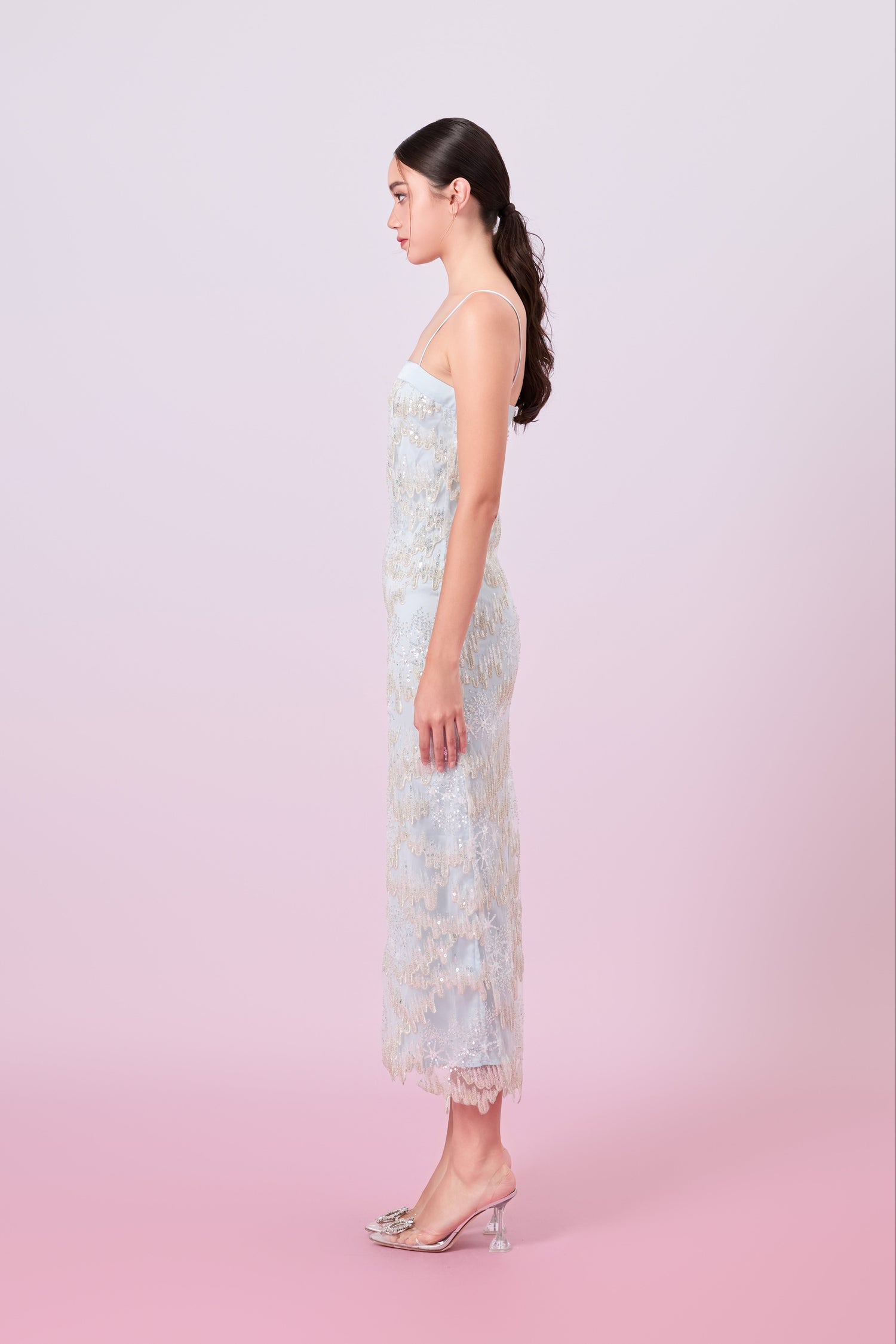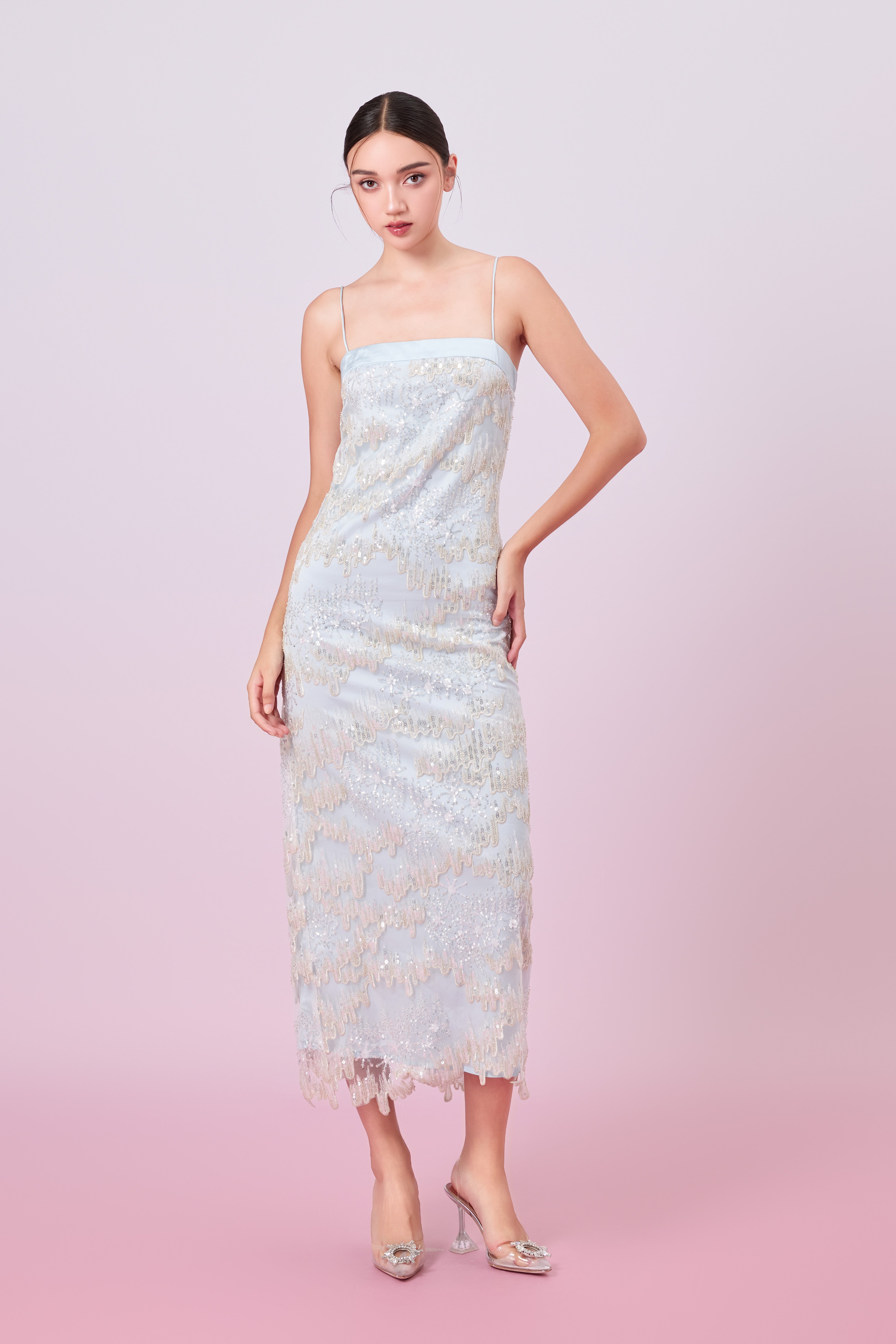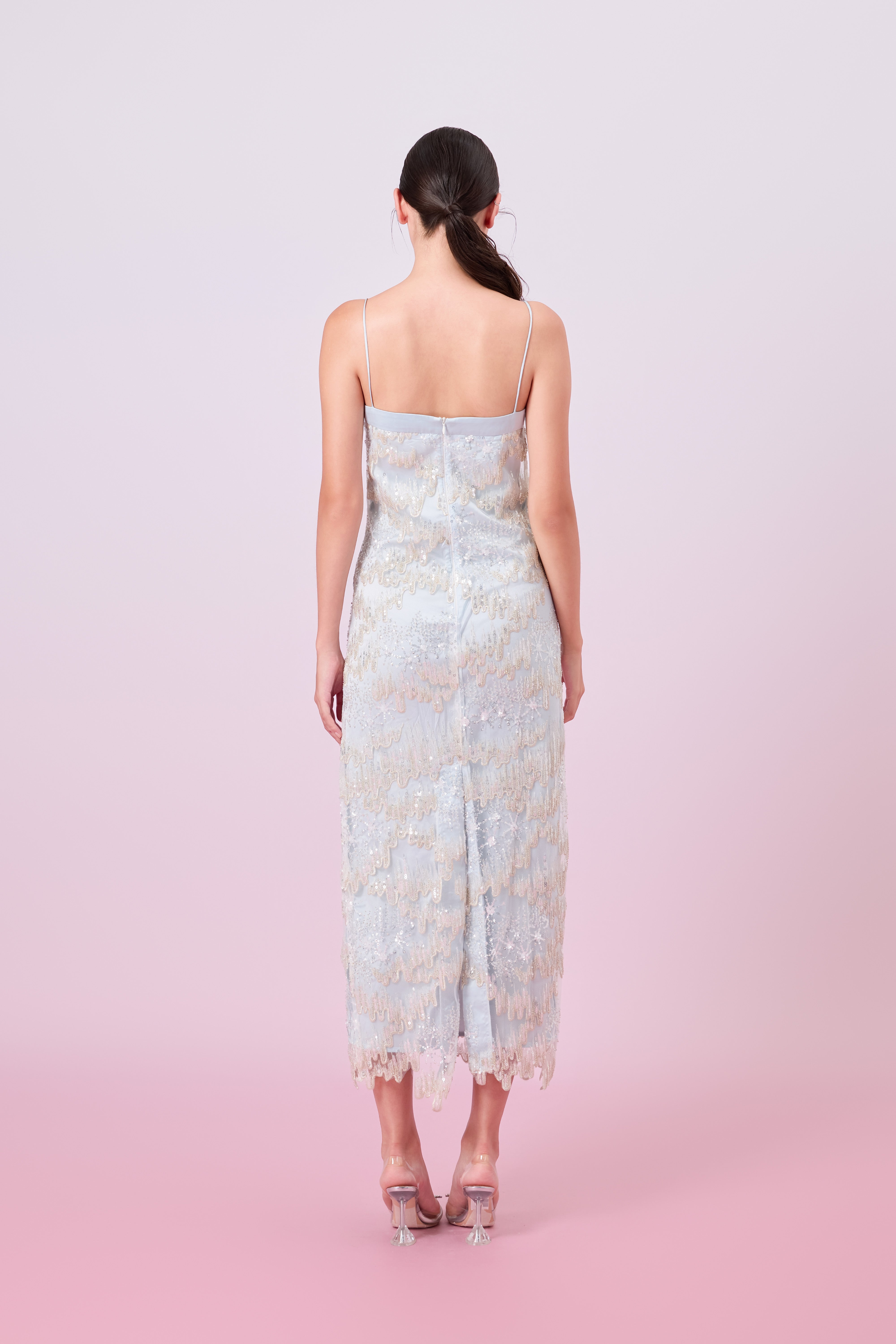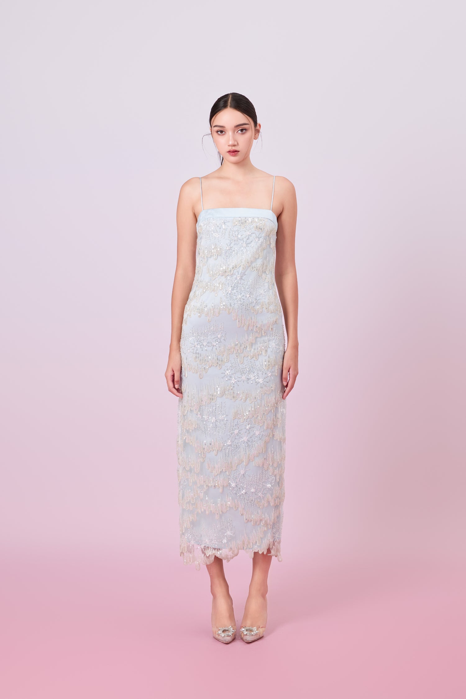 The Gabriellen Green with Sequins Column Dress is a simple yet glamorous piece, featuring a straight-cut silhouette and delicate spaghetti straps. Crafted from sequin fabric, this dress catches the light beautifully, making it perfect for evening events or special occasions.