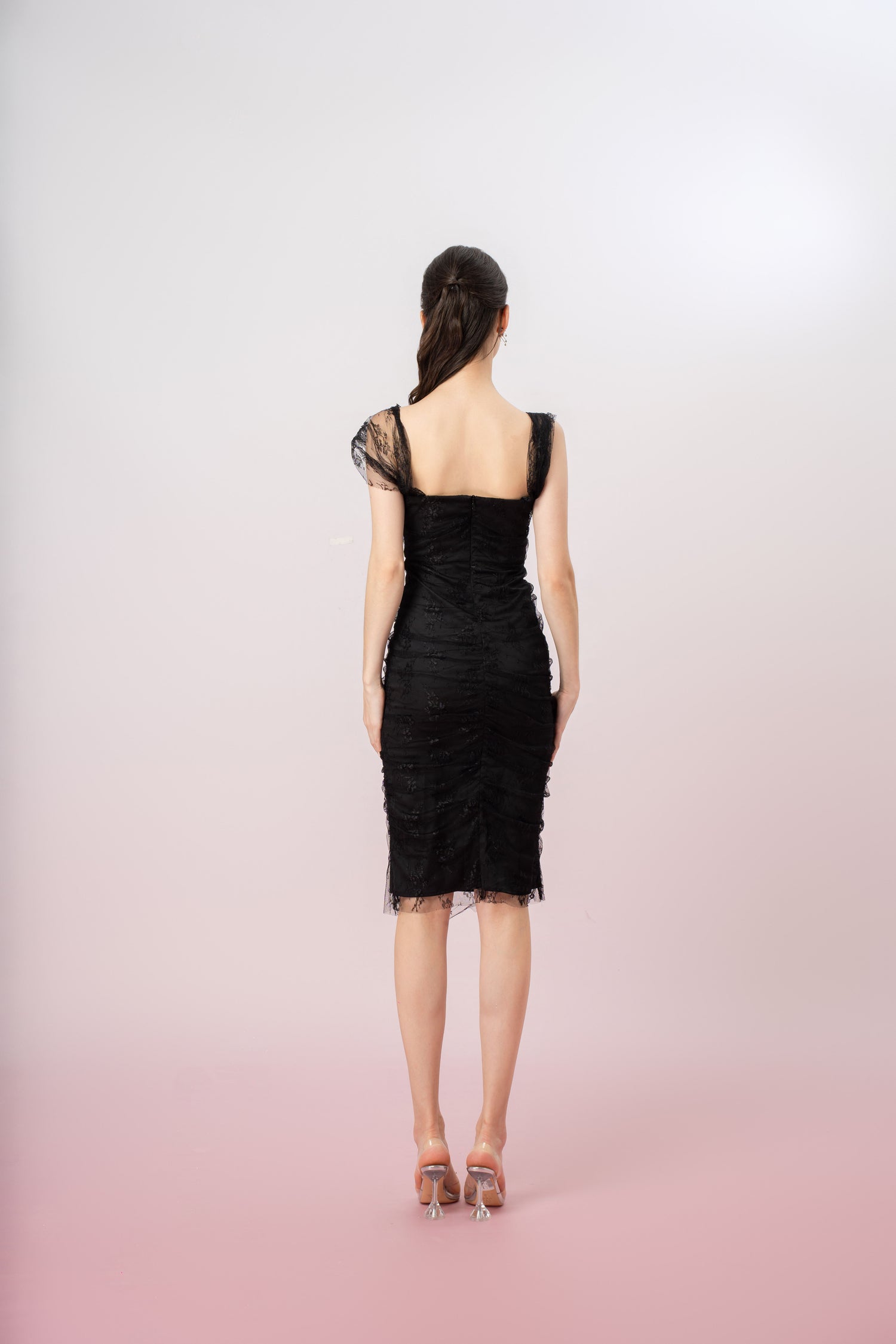 The Gabysia Black Lace Dress is a striking blend of elegance and allure, perfect for those seeking a sophisticated yet sultry look. Features a bodycon fit that hugs the figure in all the right places, while the ruched detailing on both the front and back creates a flattering and smooth silhouette. The knee-length cut adds a timeless, versatile element, making it ideal for formal events, cocktail parties, or romantic evenings.