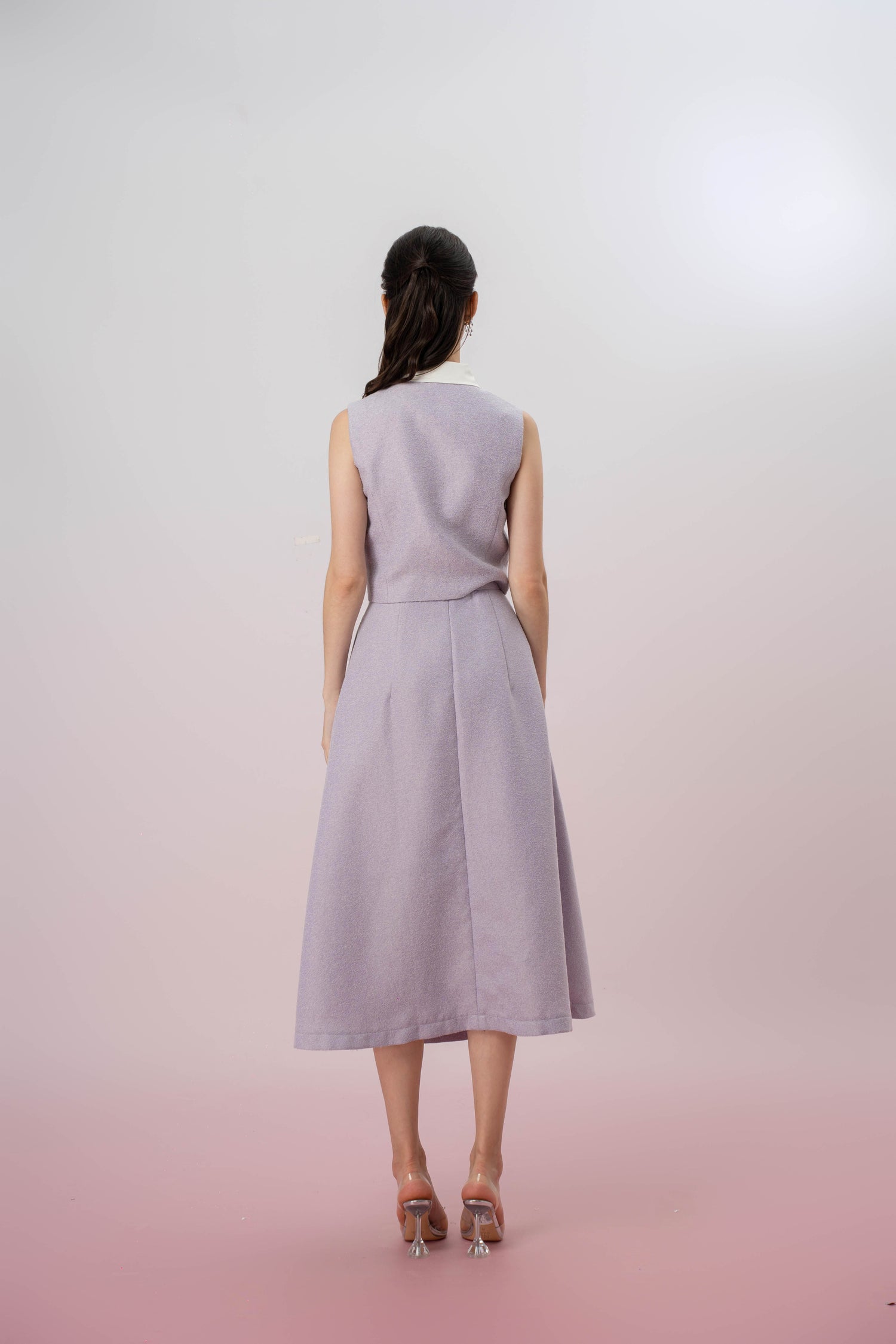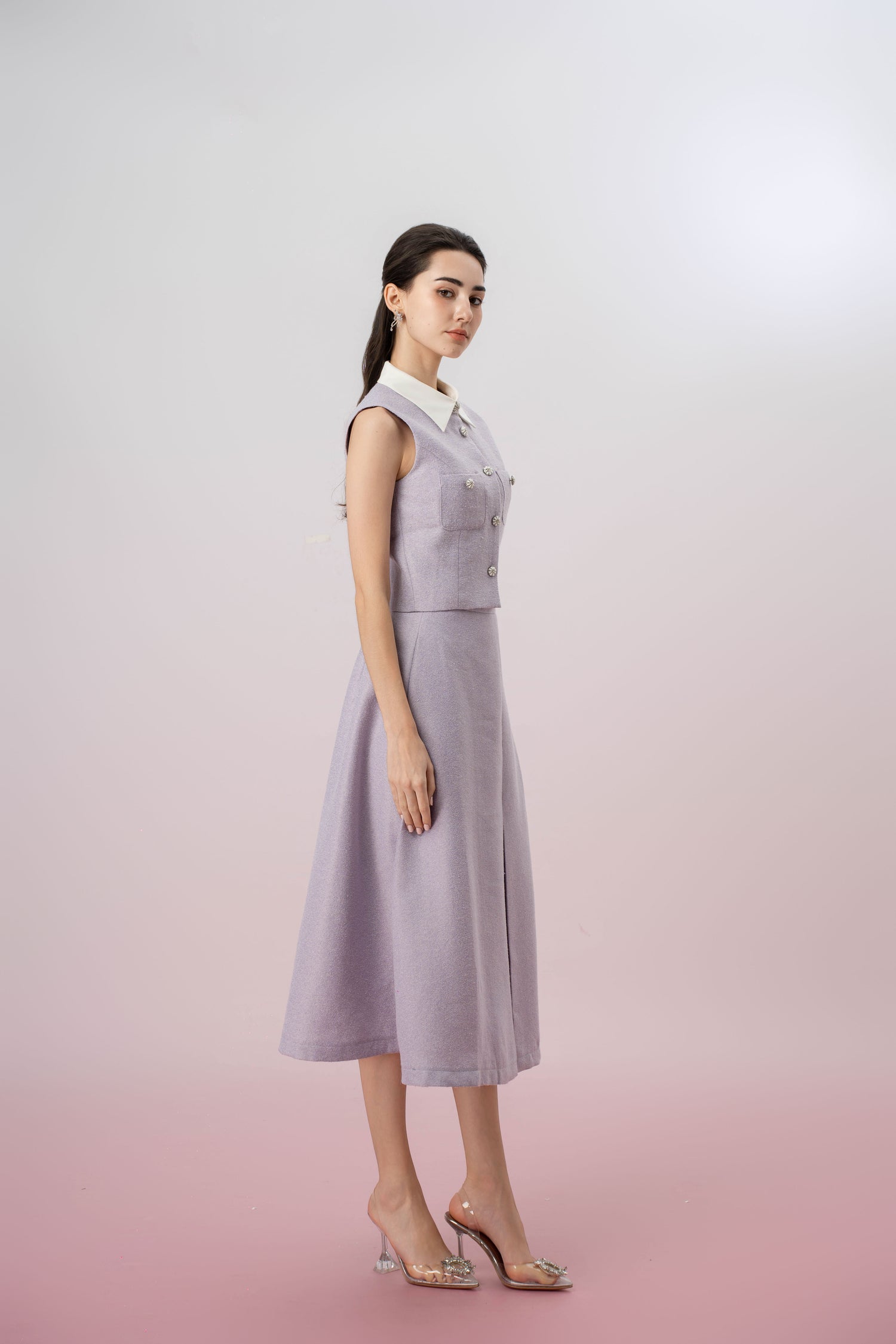 Material: Soft, subtly textured tweed fabric in a soft lilac shade