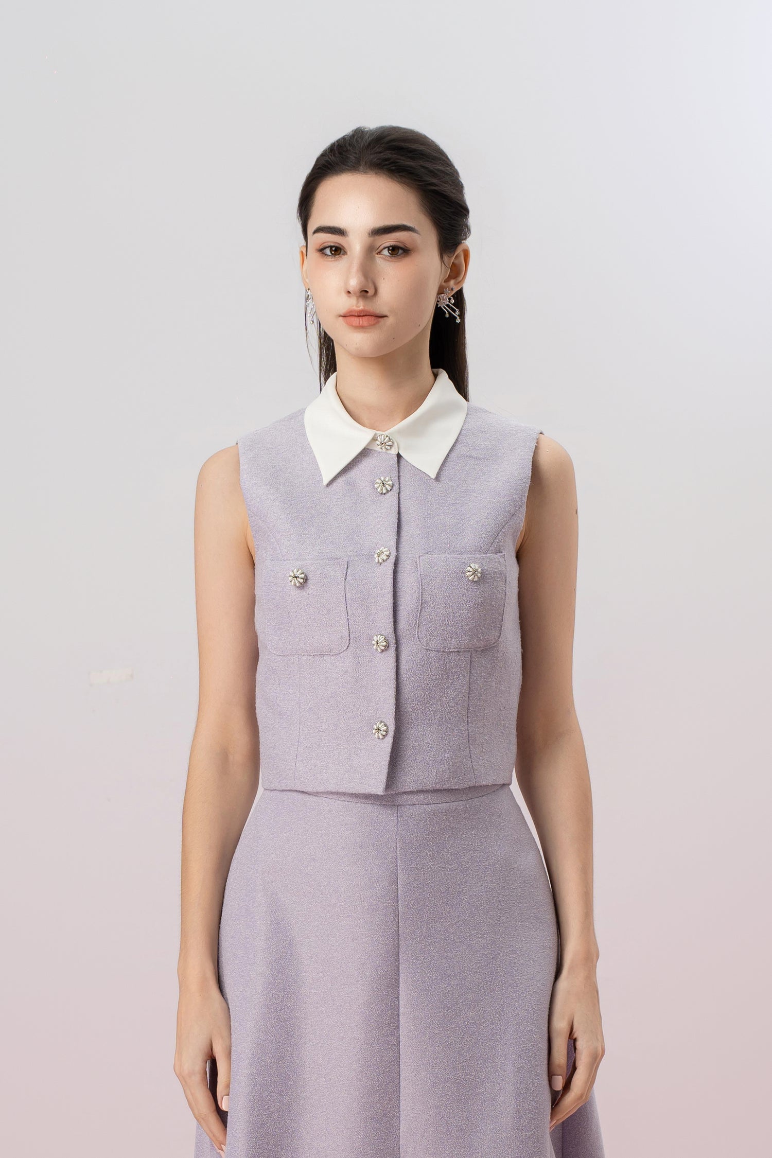 The Gahl Lilac Tweed Collar Sleeveless Top is a beautifully crafted piece that combines timeless elegance with modern functionality. Made from subtly textured tweed fabric in a soft lilac hue, this top exudes sophistication while offering comfort and versatility. Featuring a structured stand collar and a button-down front, this top can be styled both open and closed, offering various ways to wear it.