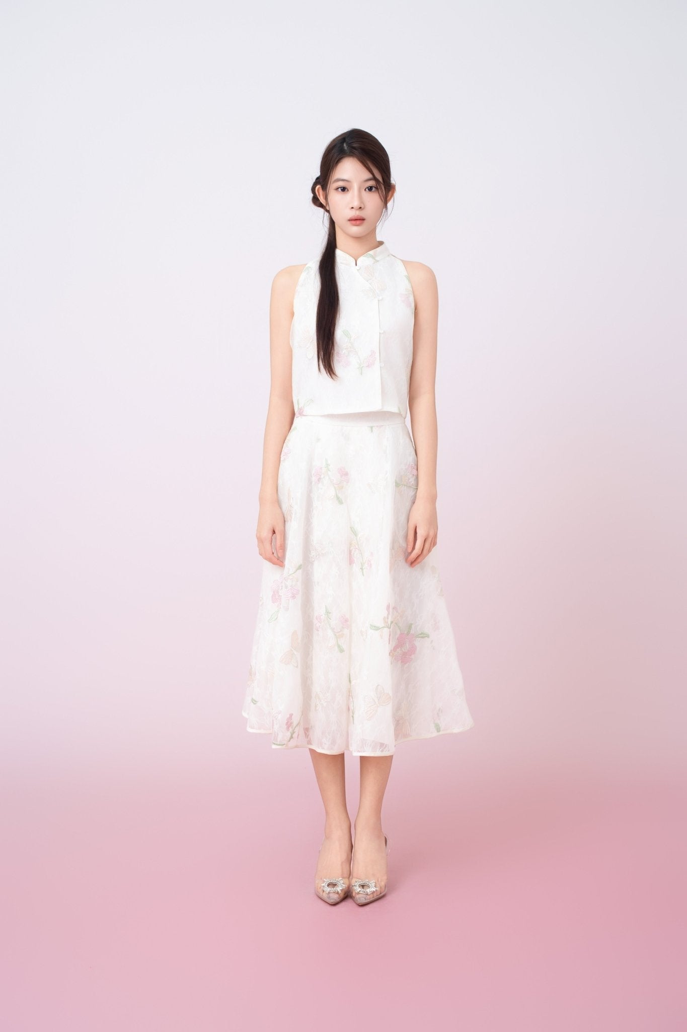 The Galiena Ivory Floral Embroidery Cheongsam crop top beautifully blends traditional elegance with a modern twist. It features a high neckline and a halter design that accentuates the shoulders. The fitted bodice highlights the waist, while the cropped length adds a contemporary flair.