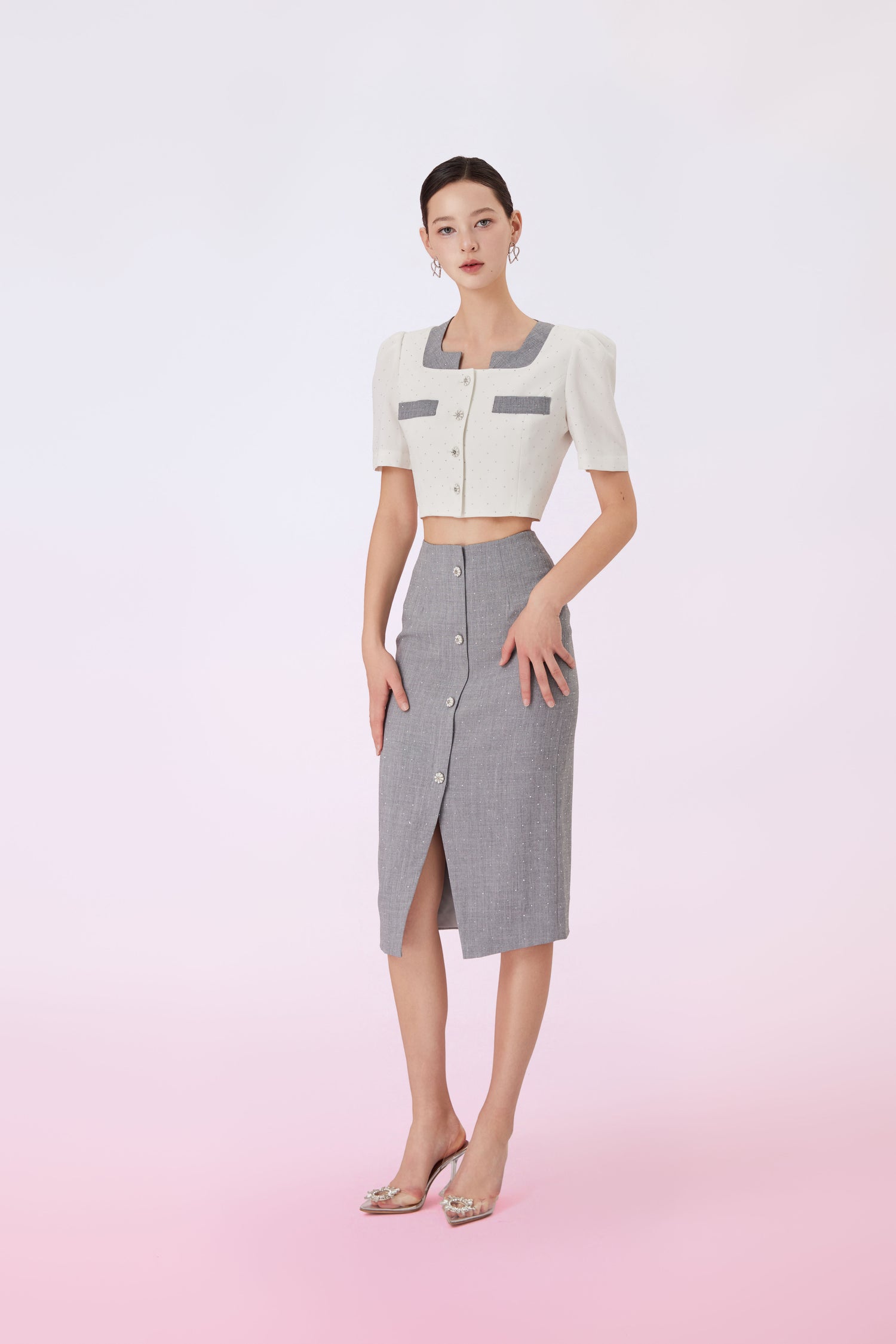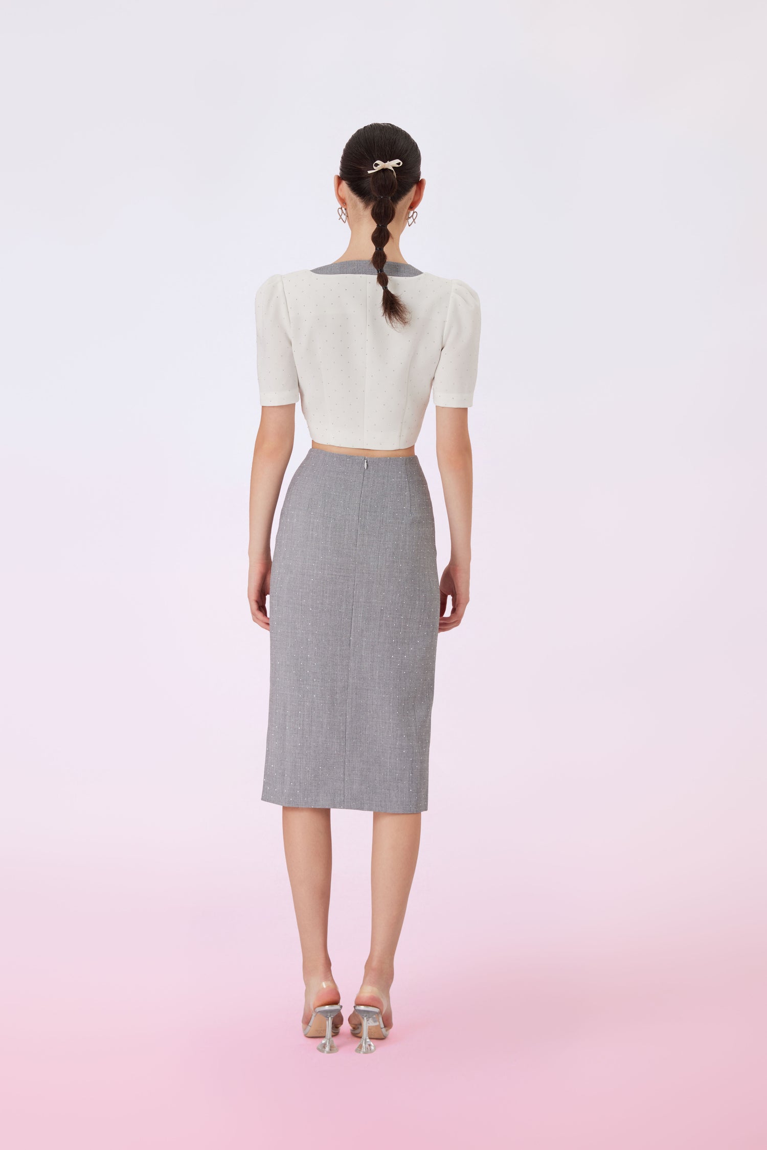 A midi pencil skirt made from rhinestone fabric is a striking and elegant piece that adds a touch of glamour to any outfit.