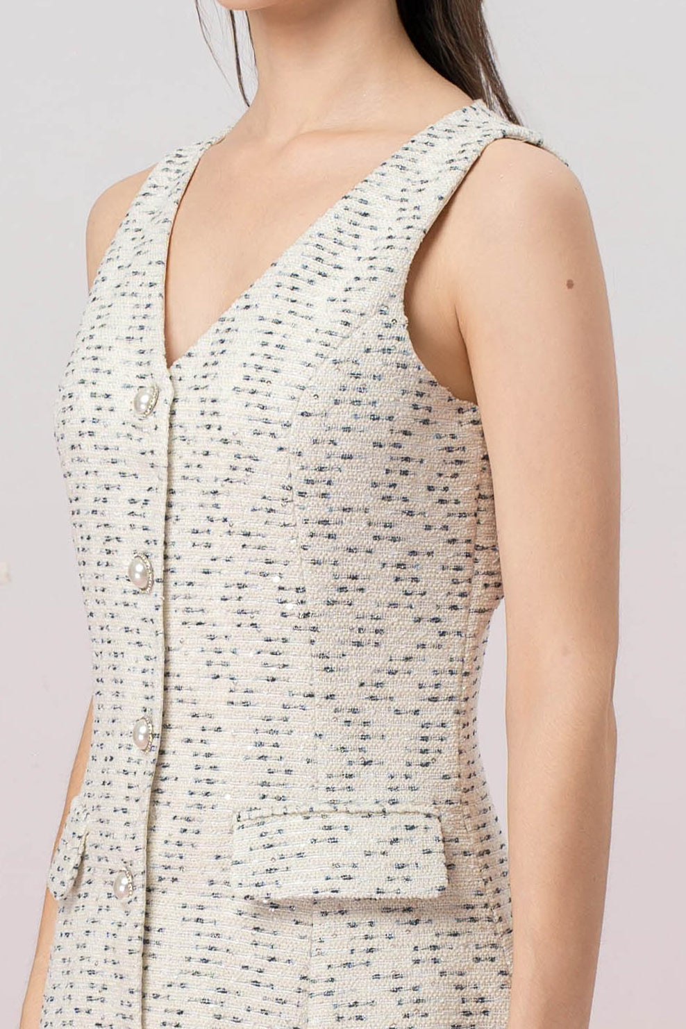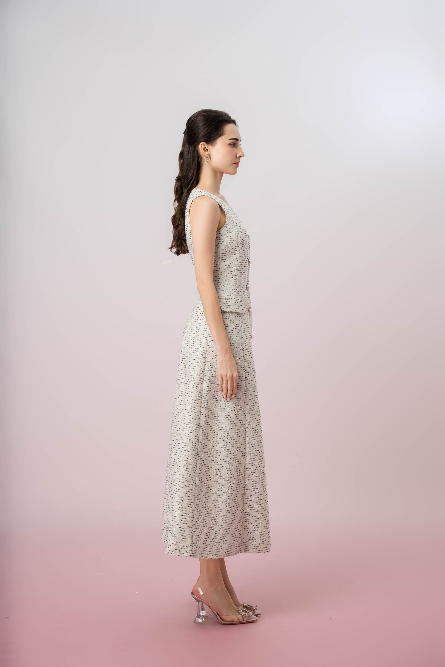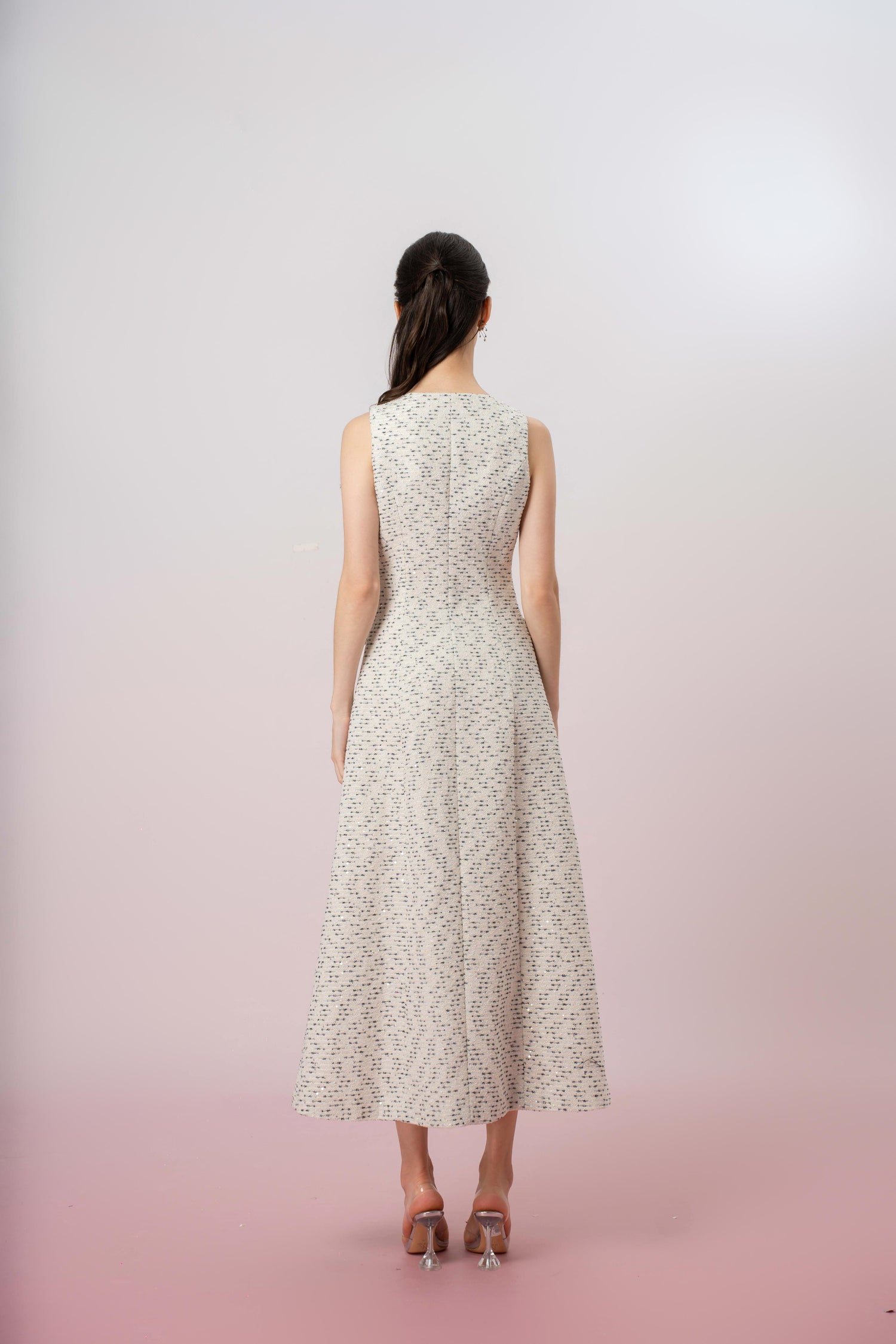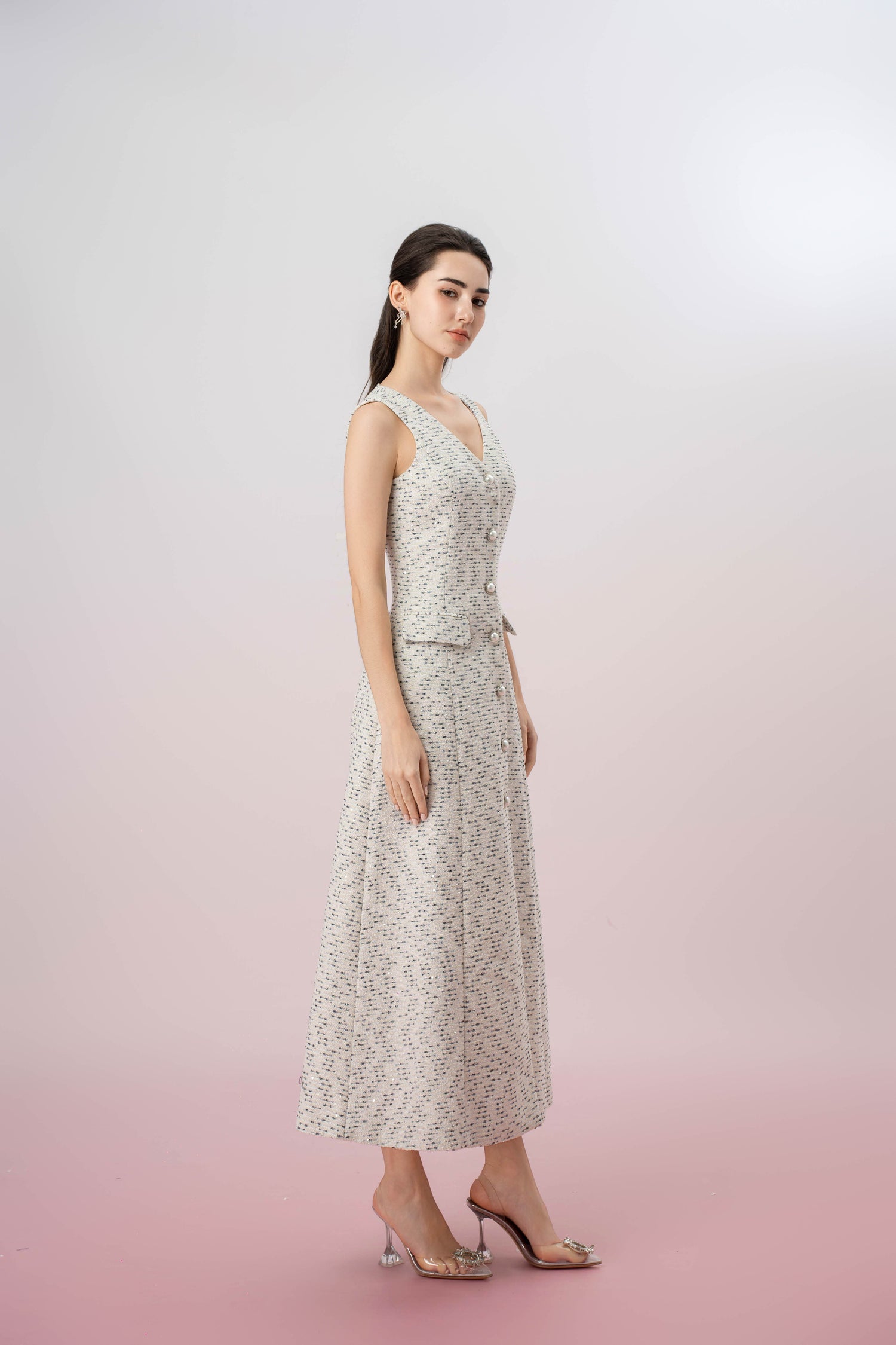 The Geertje White Tweed Button Down Dress is the perfect blend of classic sophistication and modern elegance.Features a flattering V-neckline and a button-down front. The A-line fit adds a graceful, feminine touch, providing a flowy silhouette that’s both comfortable and stylish. Whether for a formal event or a chic daytime look, this dress is sure to make a statement.