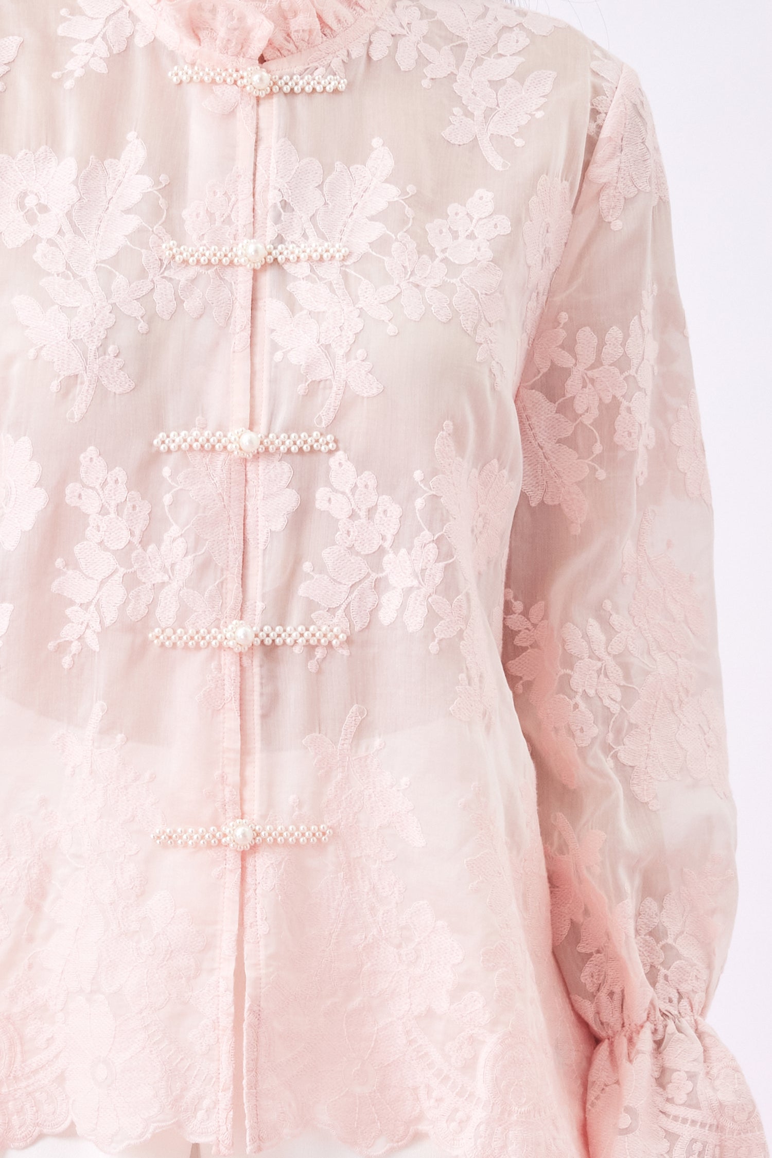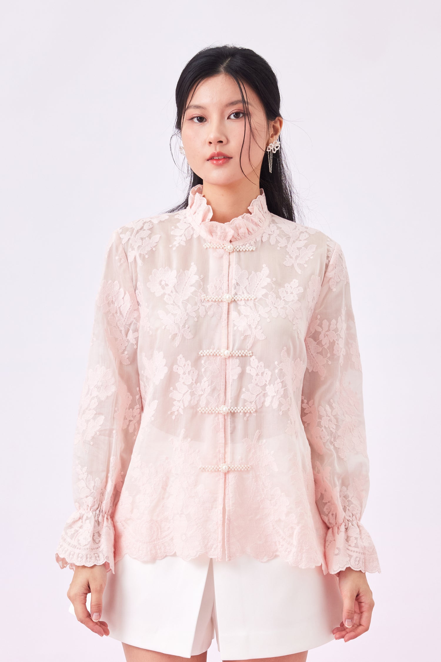 A modern take on a chinese classic, the Pink Lace Mandarin Collar Top is an elegant and feminine piece feautiring delicate lace detailing that adds a touch of sophistication, while the mandarin collar gives it a unique and stylish flair. This top is perfect for both festive occasions and formal events, adding a pop of color and texture to any outfit.
