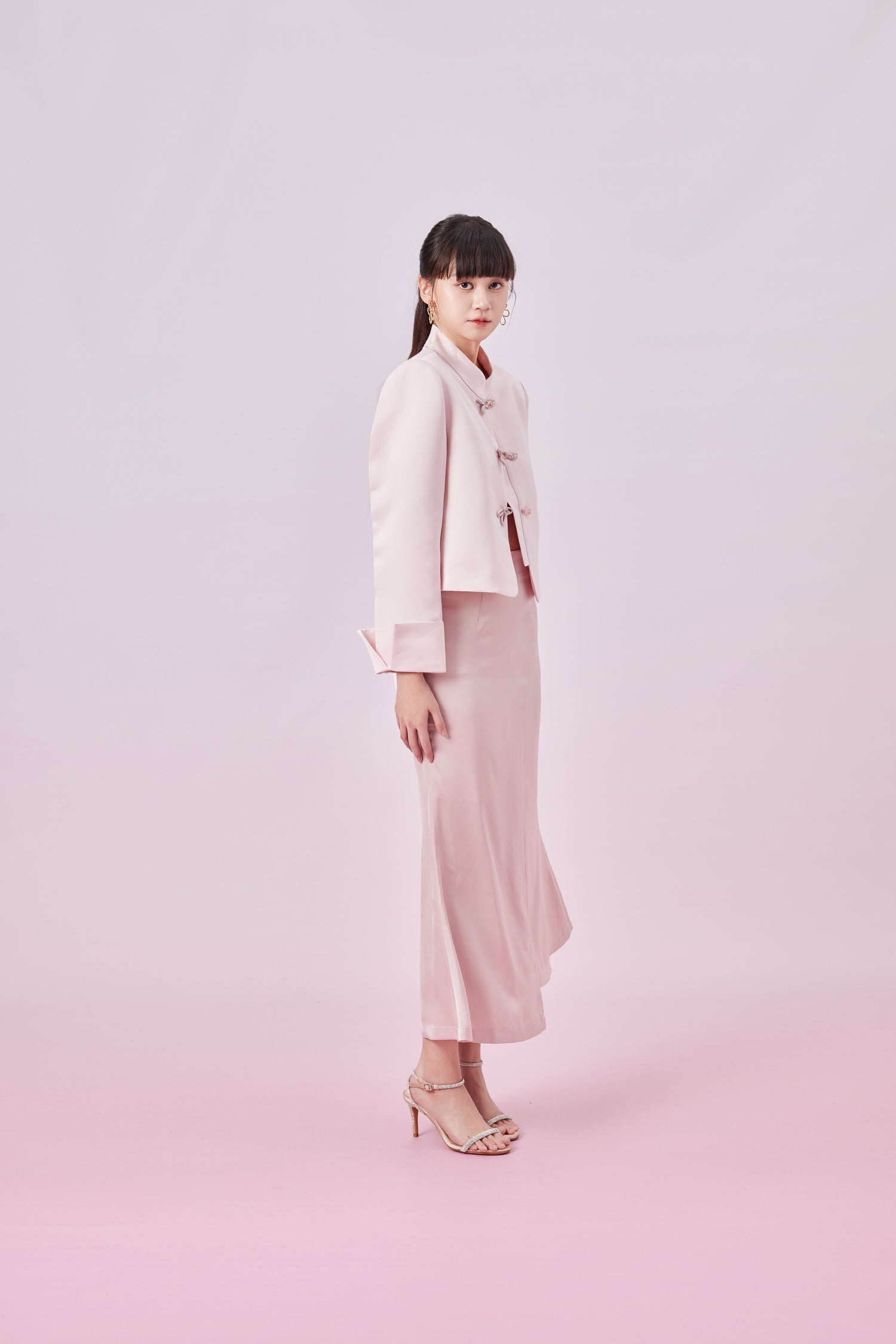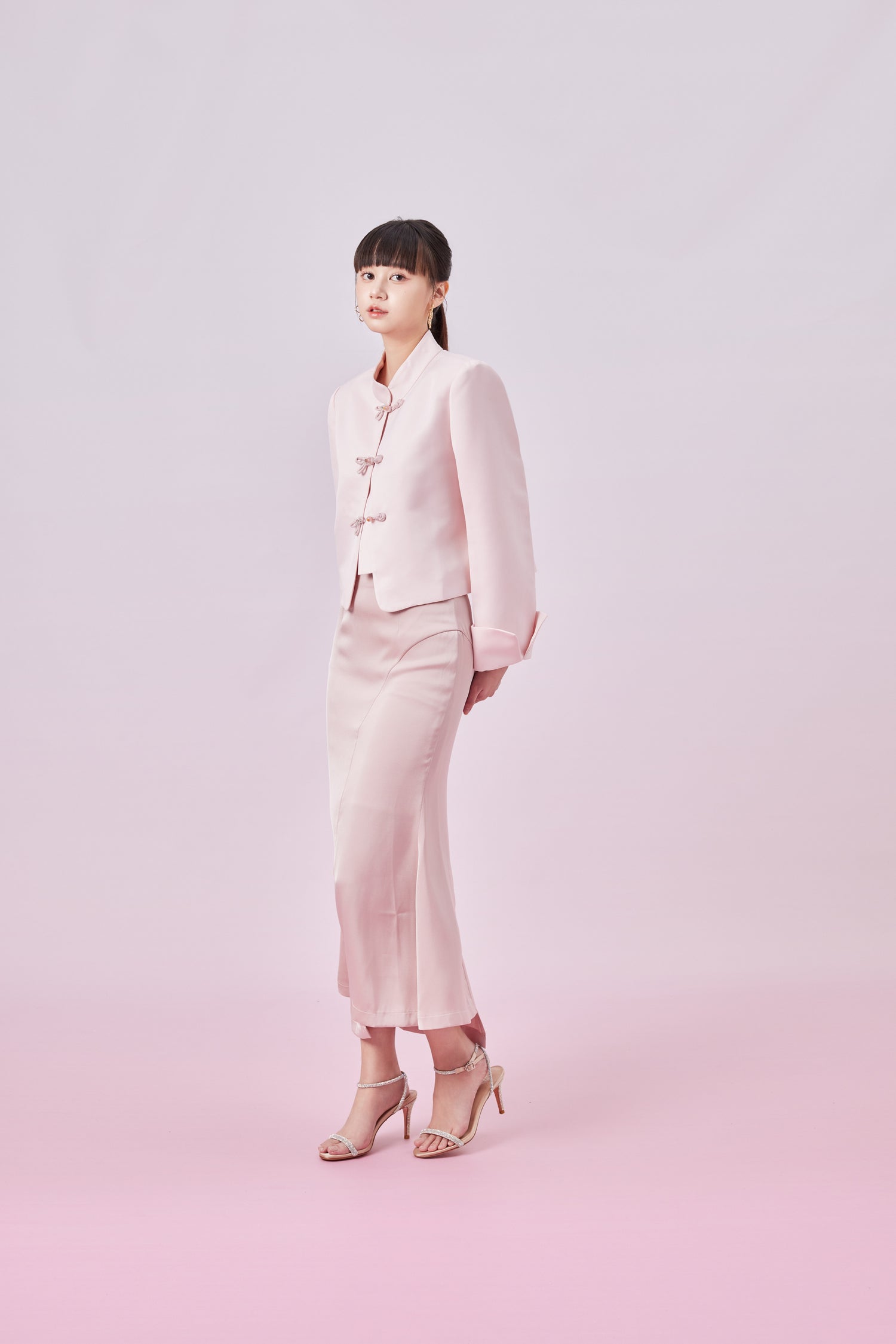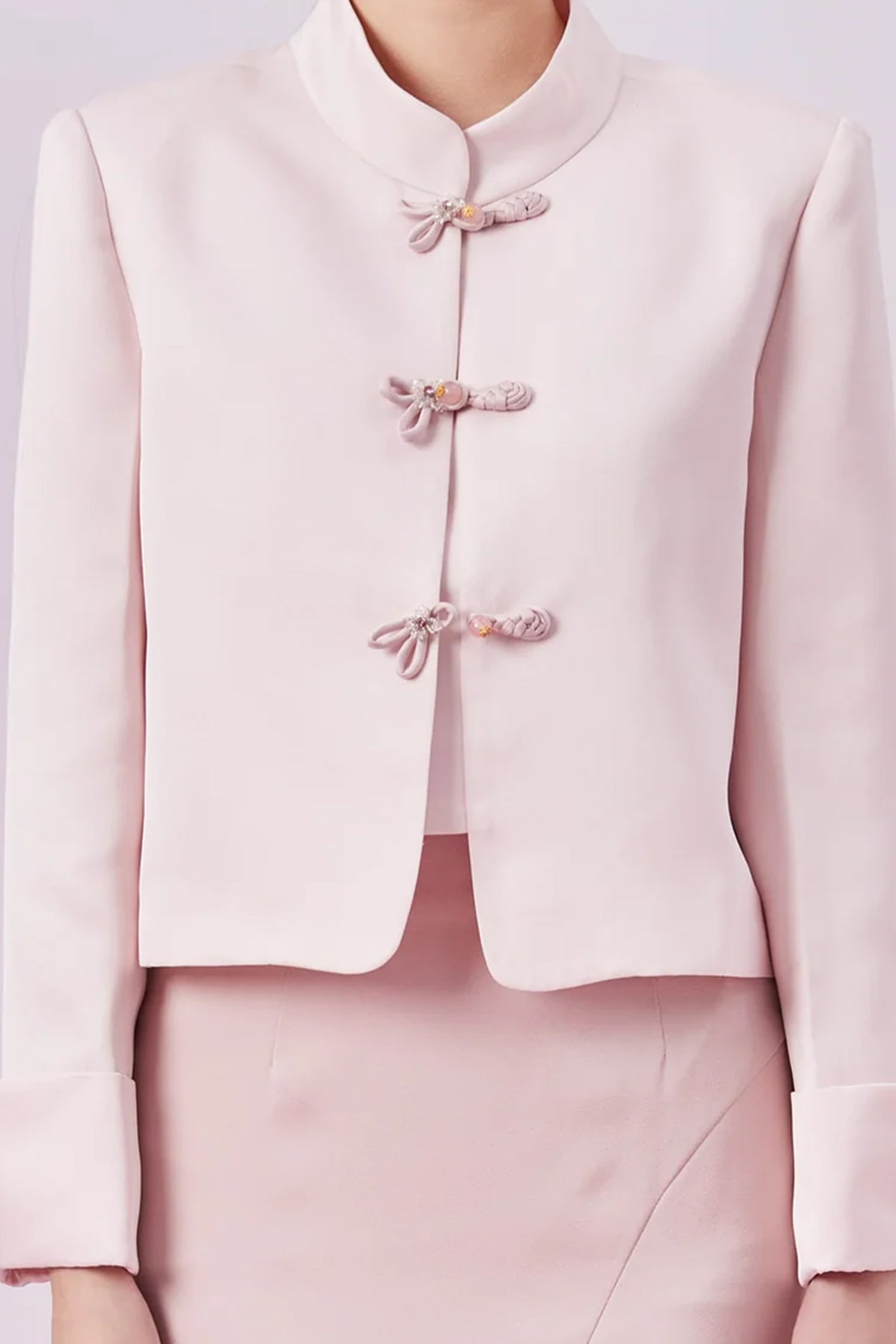 A fusion of contemporary style and traditional elements, celebrating the richness of twill fabric and the elegance of Chinese buttons.