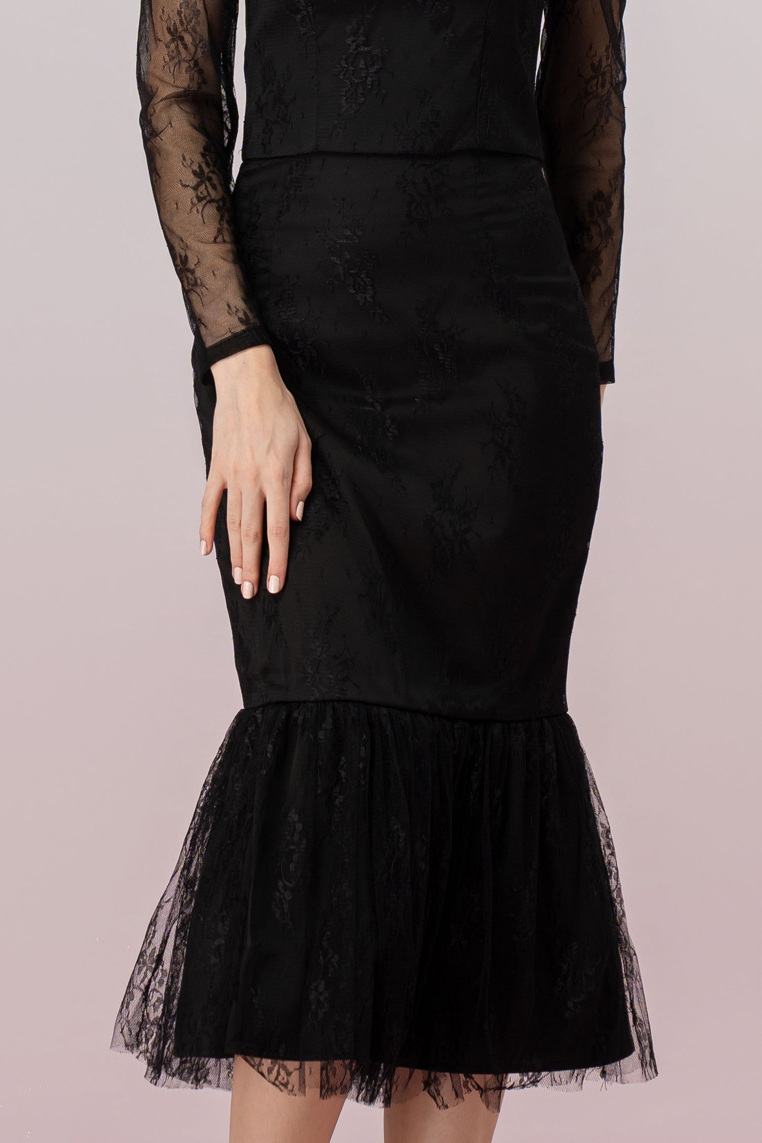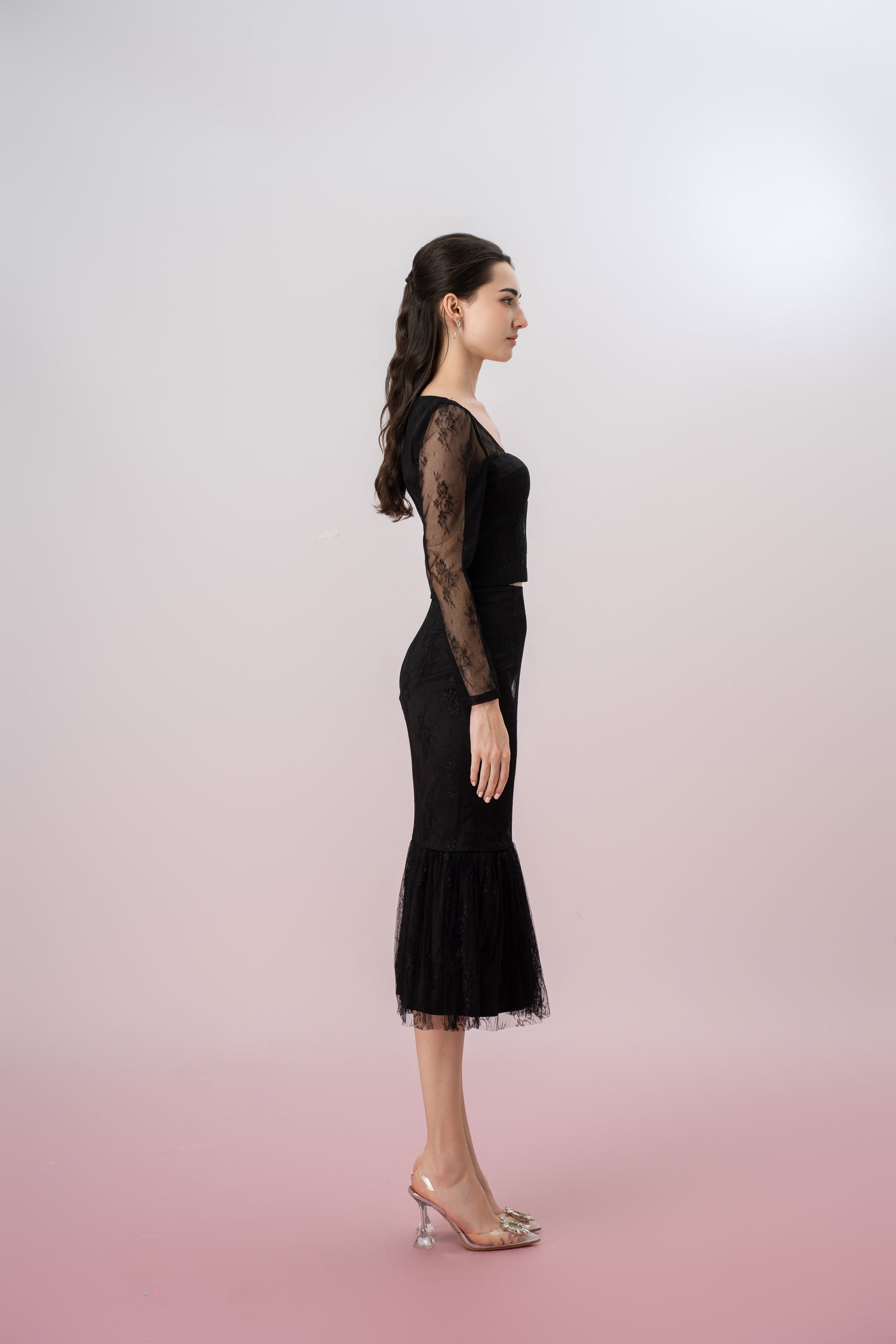 Elevate your wardrobe with the Genette Black Flower Lace Mermaid Skirt, a perfect blend of timeless elegance and modern sophistication. Designed to sit just below the knee, this skirt features a flattering mermaid silhouette that contours to the body and gradually flares out, offering a graceful and dramatic shape.