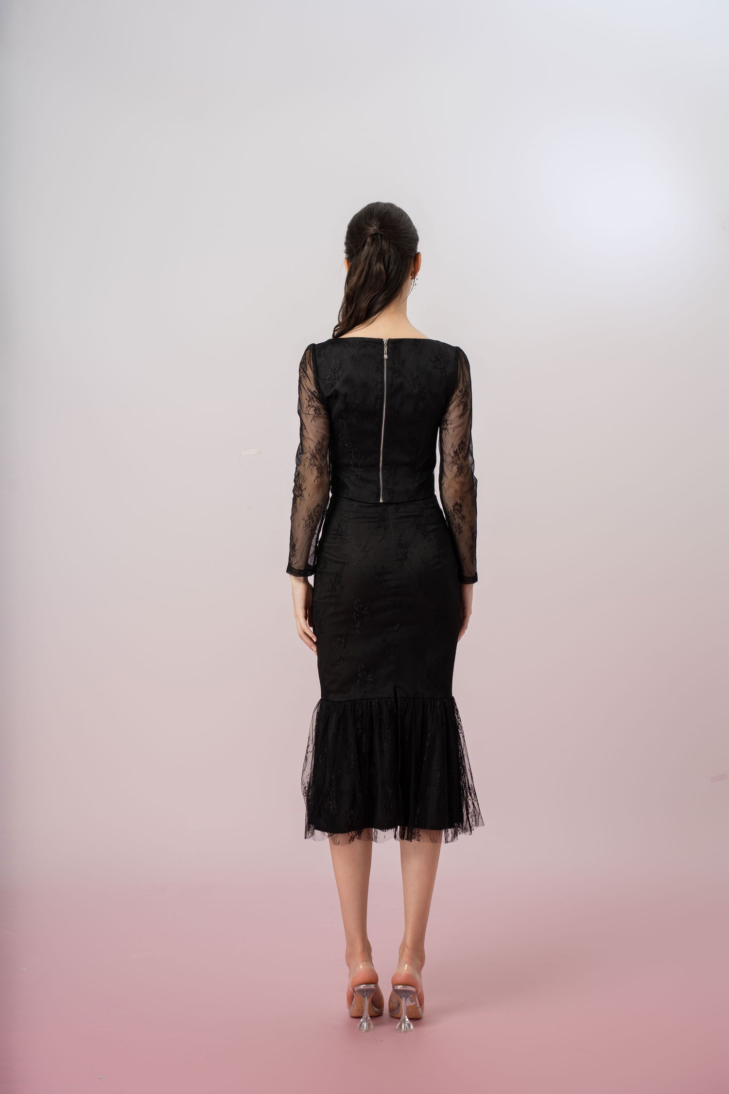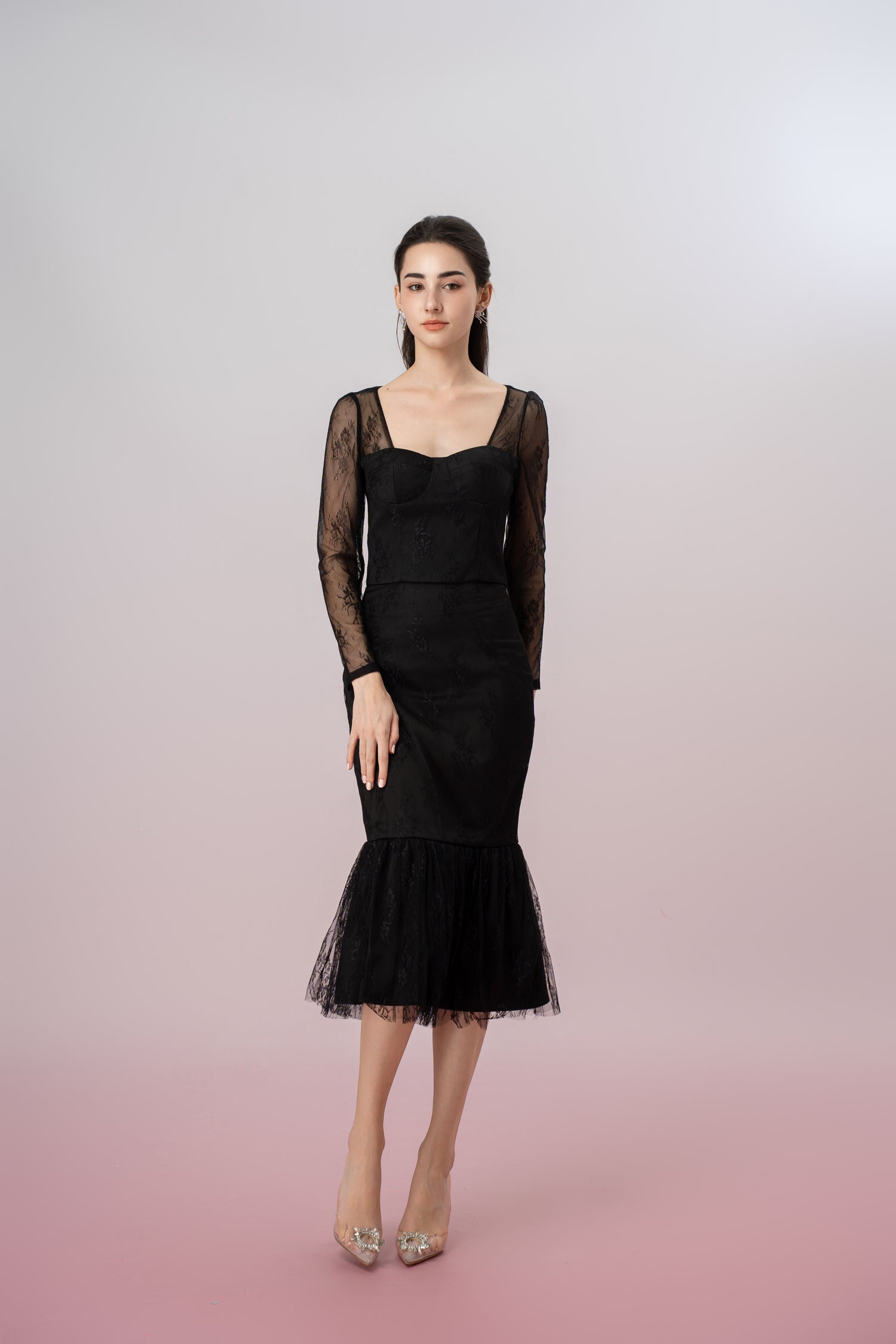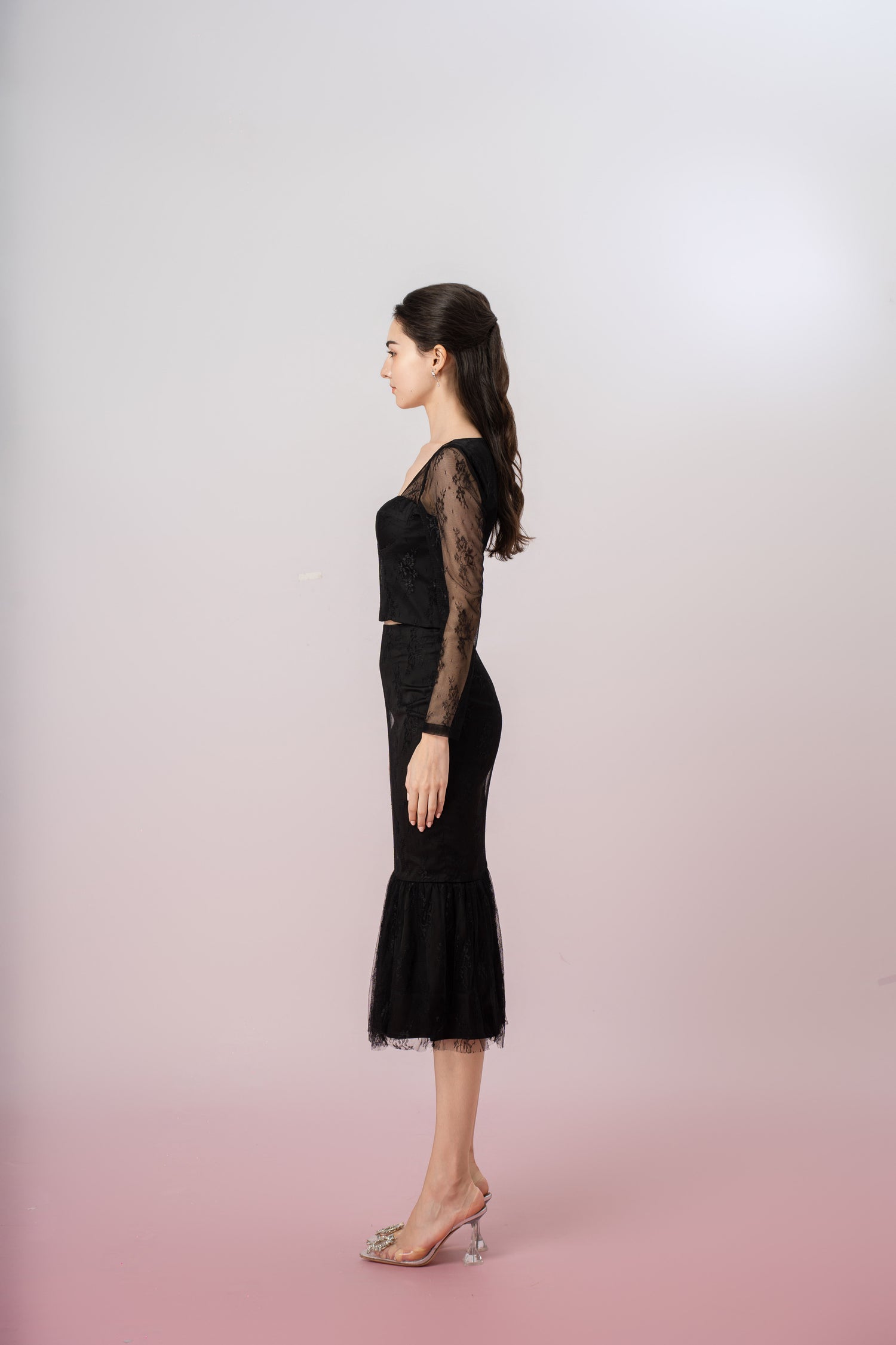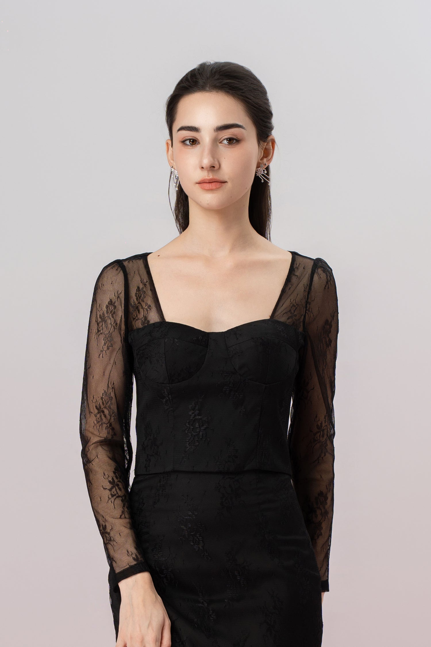 The Genette Black Lace Top is a sophisticated and chic piece, offering a modern twist on classic lace with its cropped bralet design and long sleeves. This top embodies femininity and elegance, designed to flatter the figure with its form-fitting structure and delicate lace detailing.