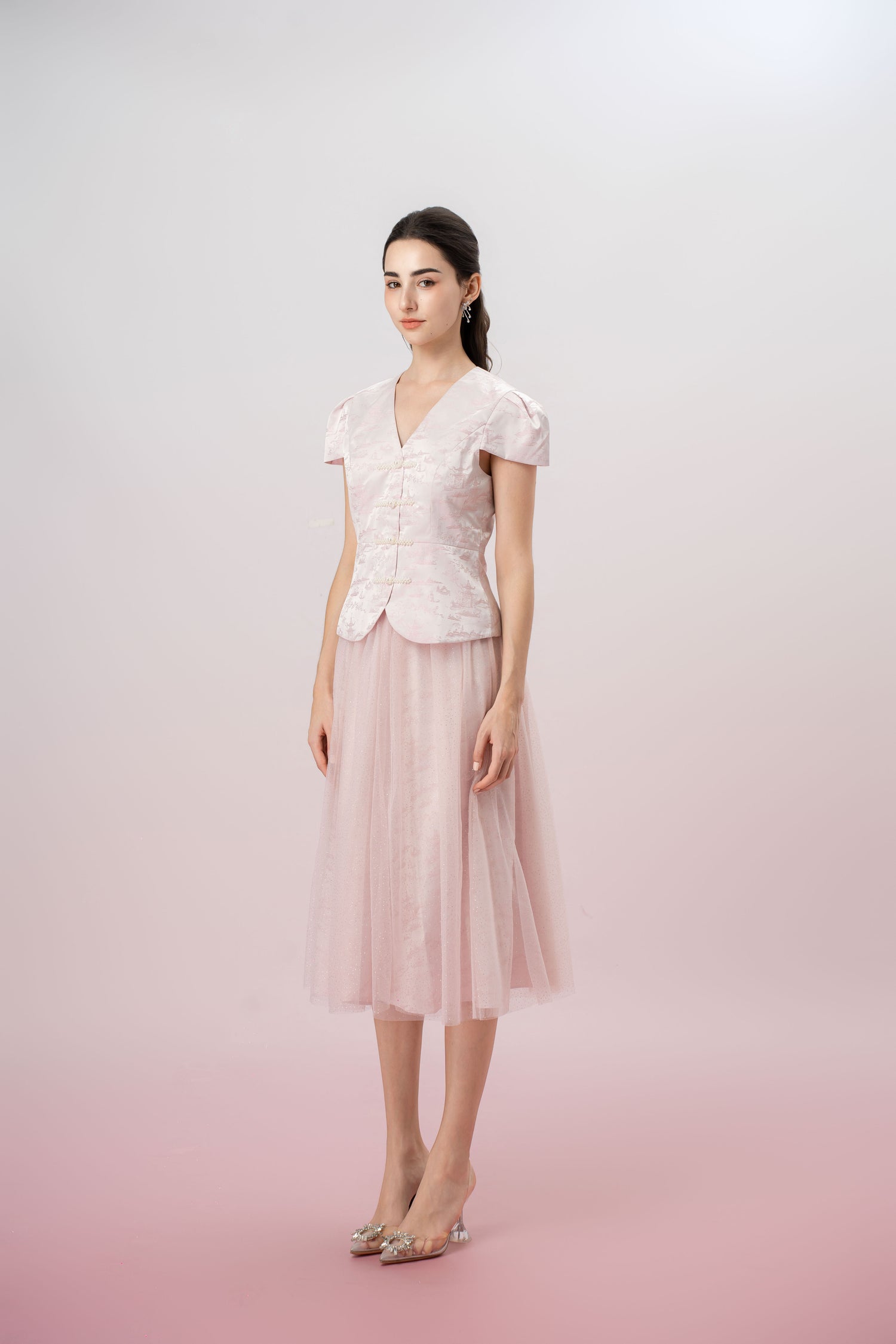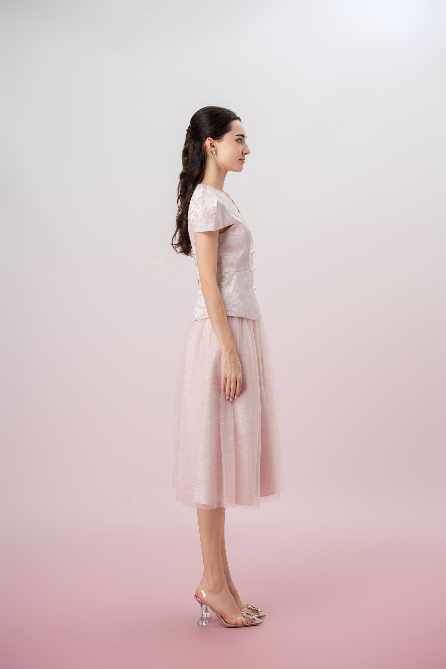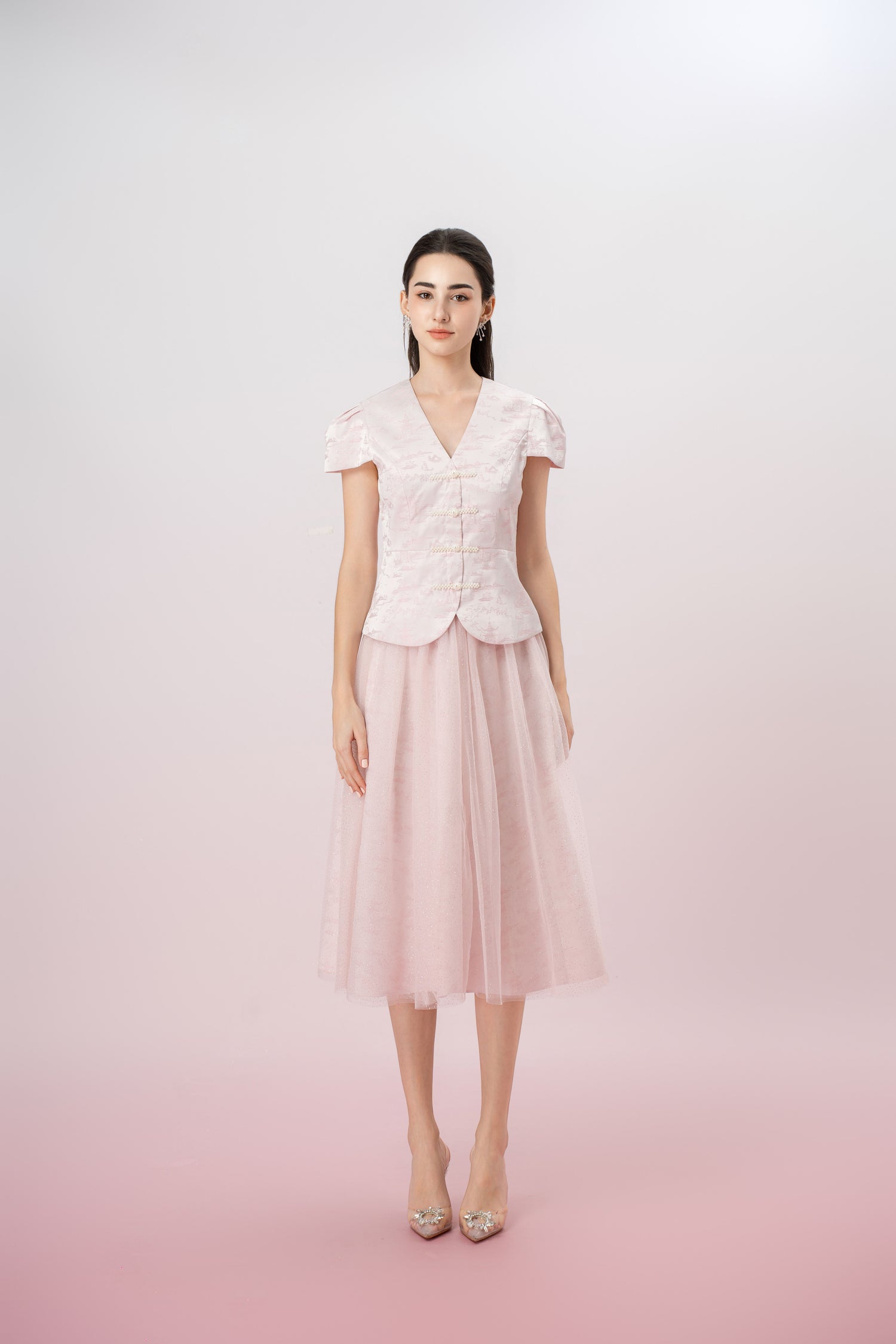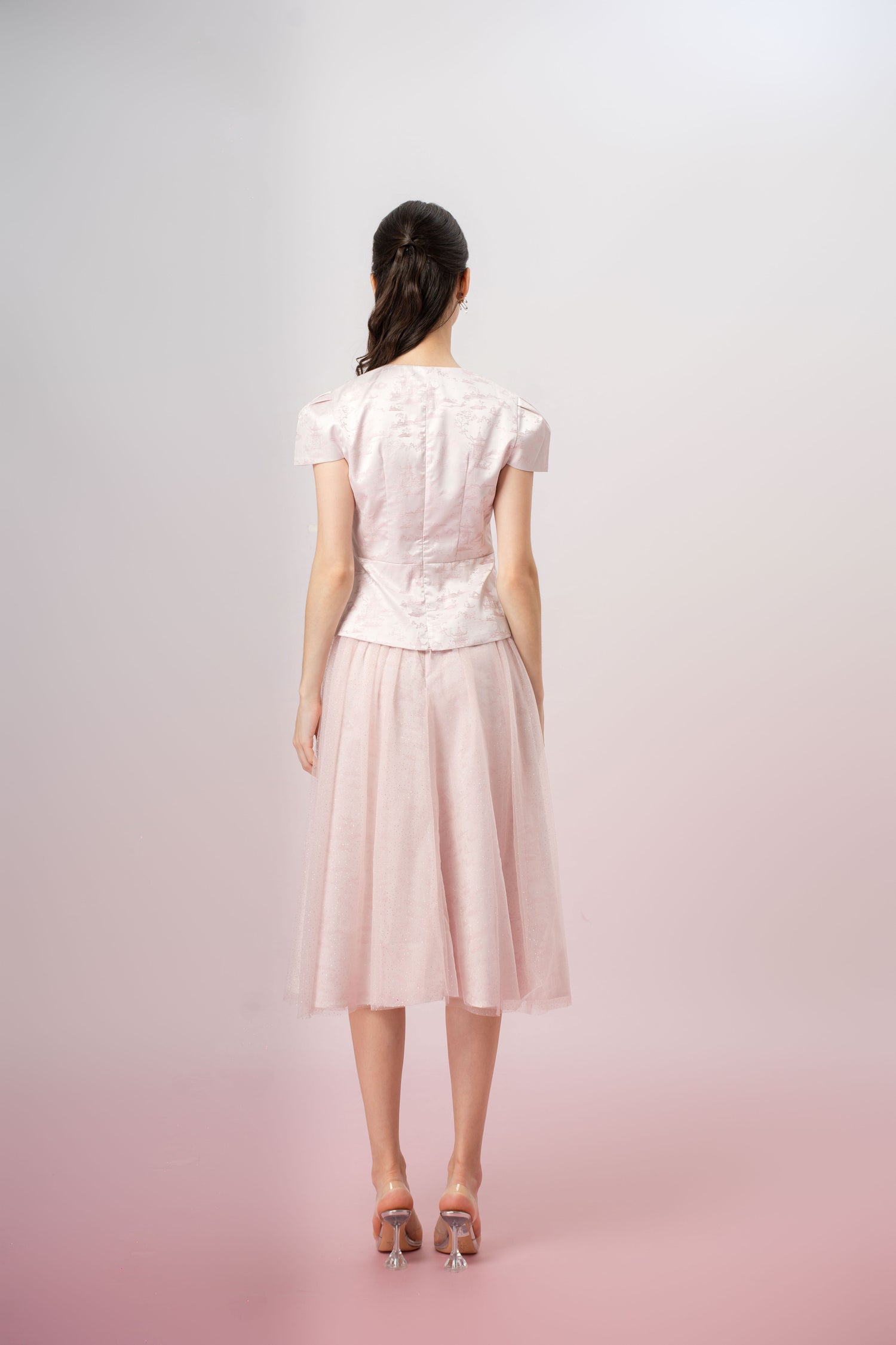 Material: Immerse yourself in the opulent world of jacquard detailing, adding a touch of texture and visual interest to the pink canvas of this top.
