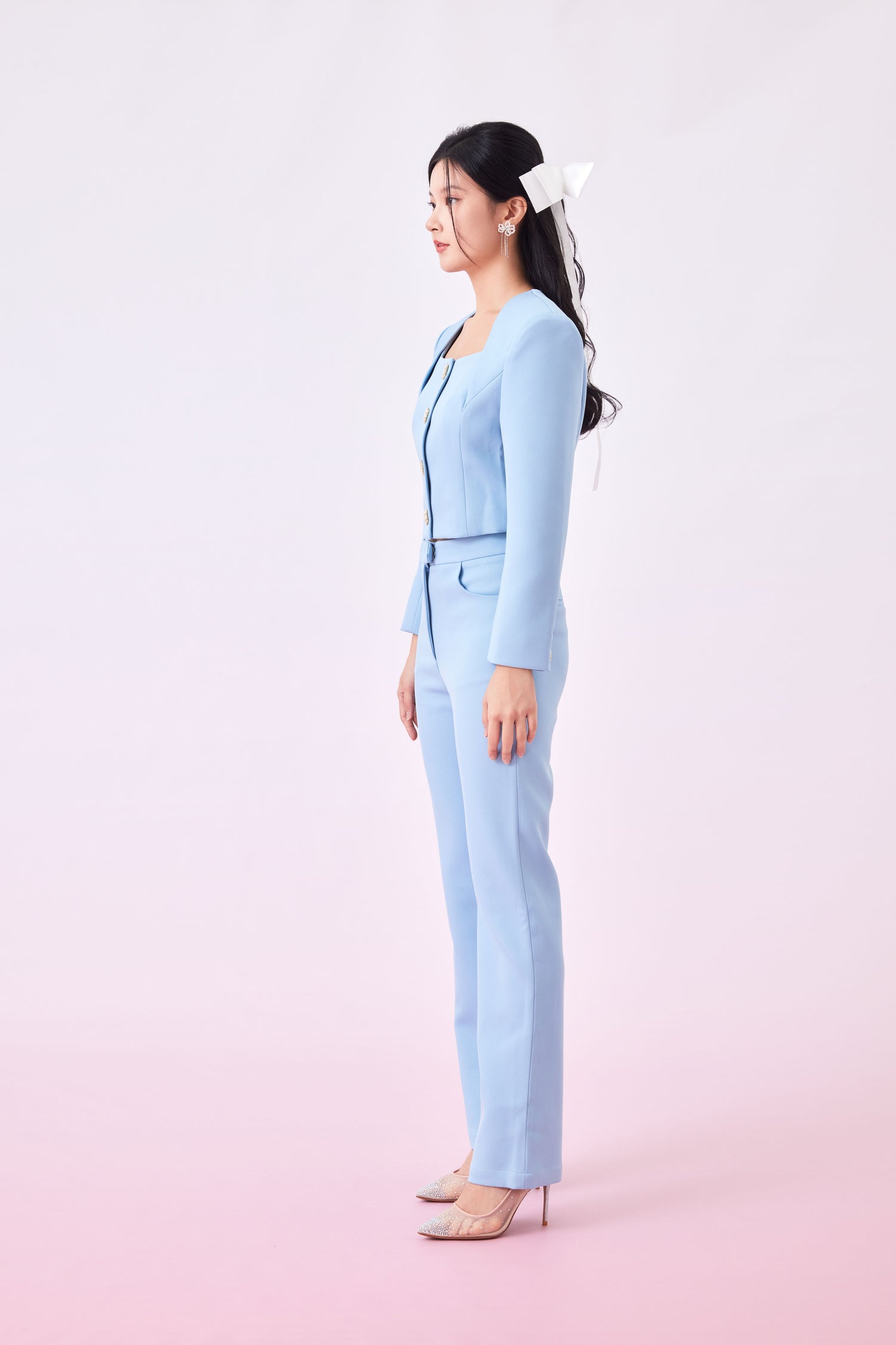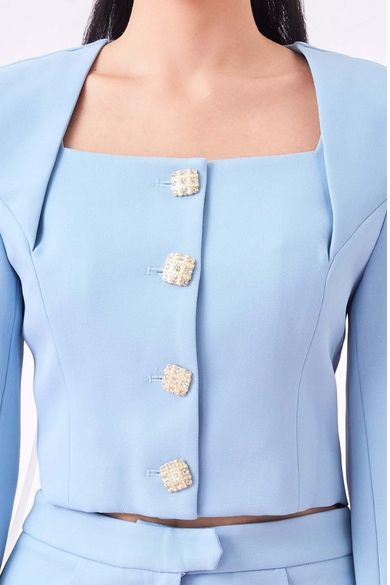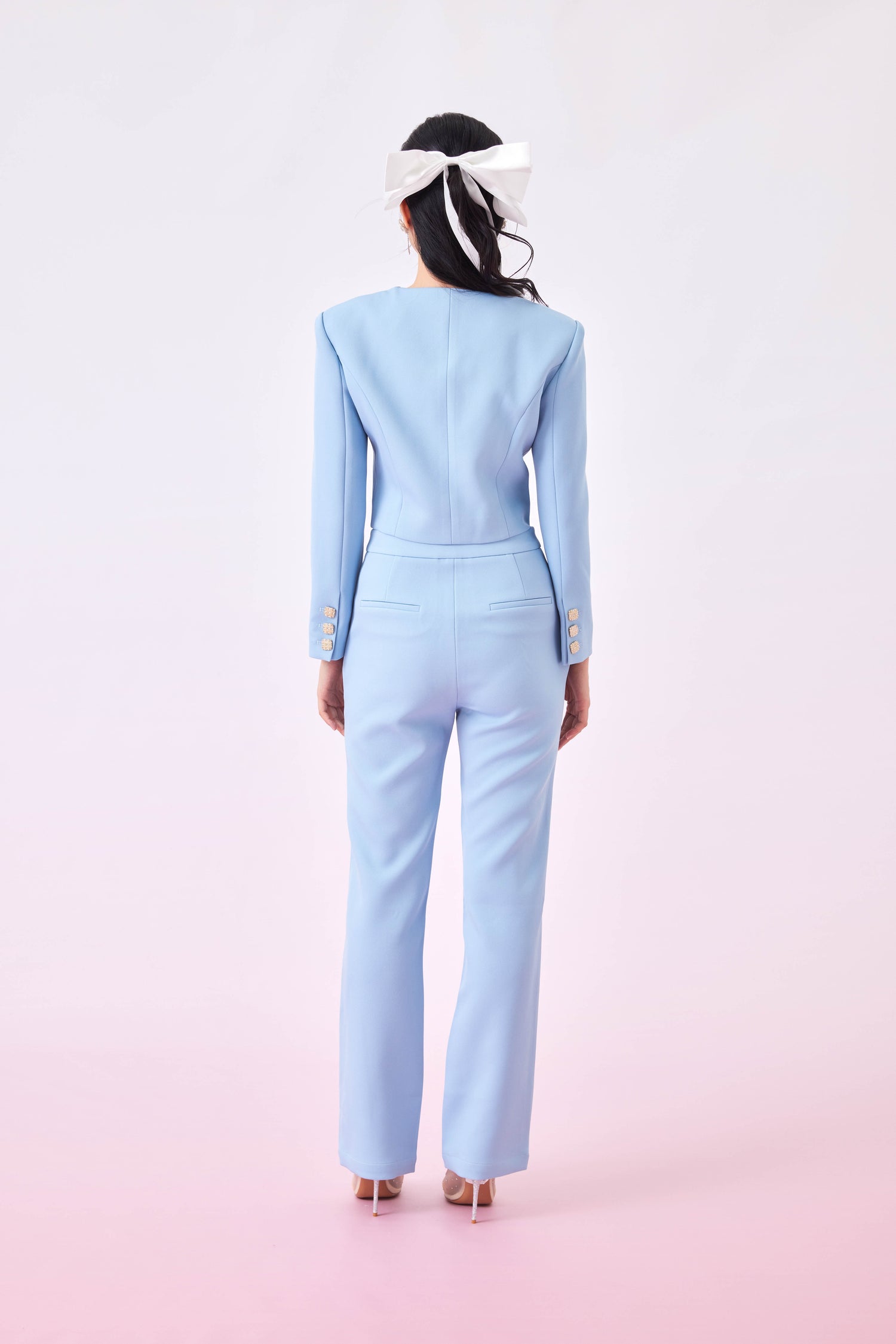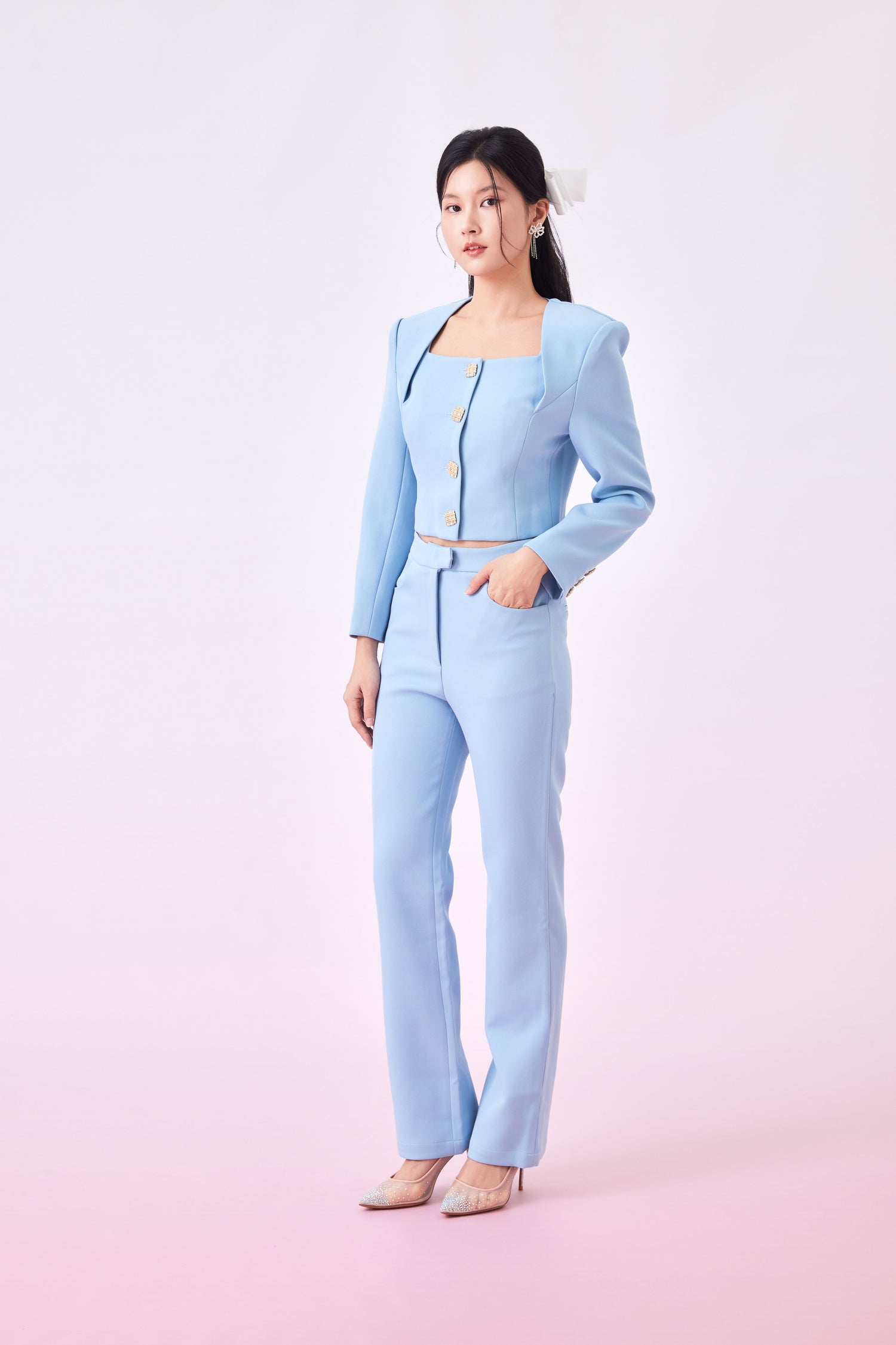 A fusion of classic sophistication and contemporary style that effortlessly elevates your wardrobe.Crafted with a structured twill fabric, this jacket top offers comfort and style in equal measure. Perfect as a top or layering piece. Matches well with Georganna Sky Blue Tube Top, Gaila Sky Blue Top, Gaila Sky Blue Pants and Gwenneth Blue Padded Jumpsuit.