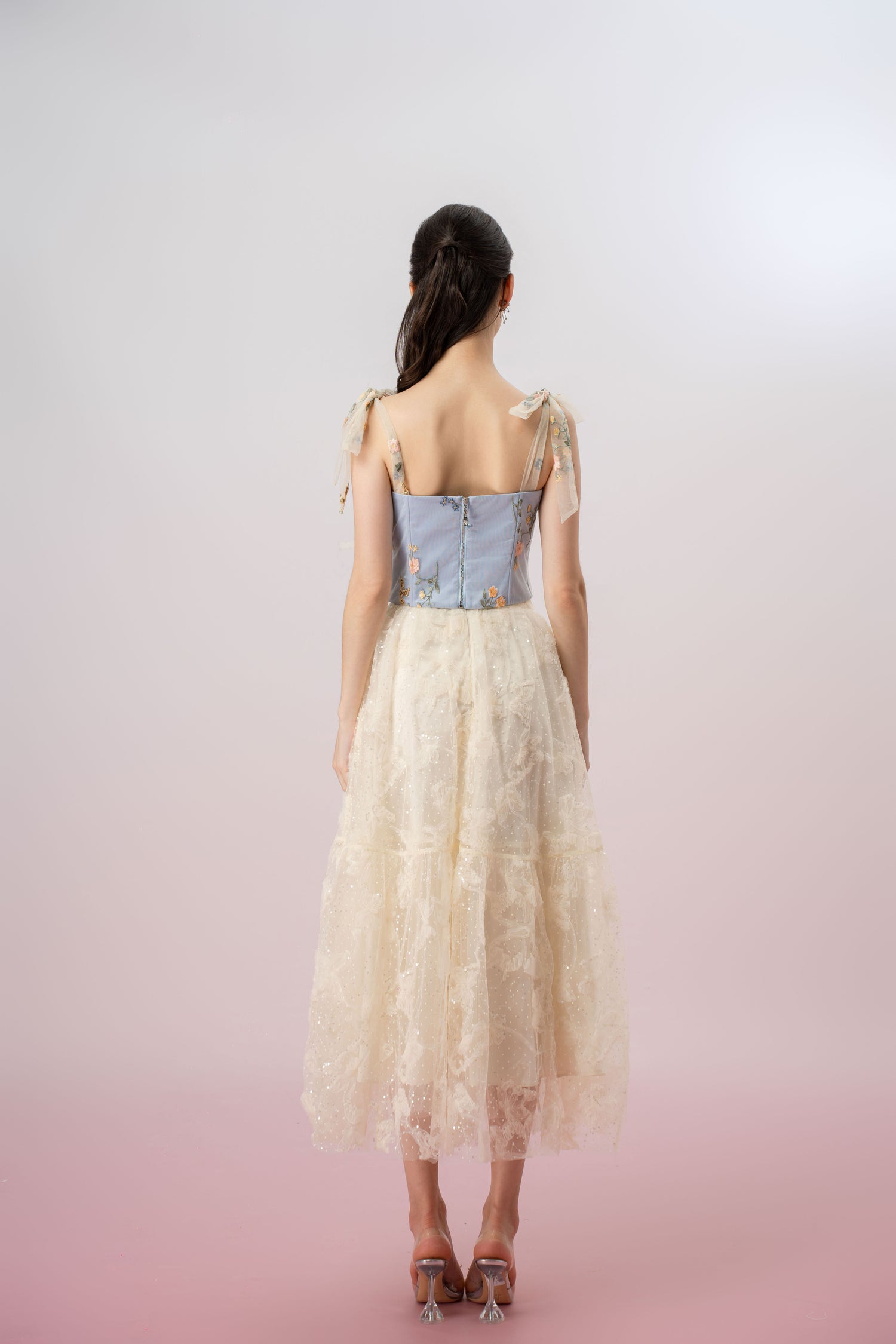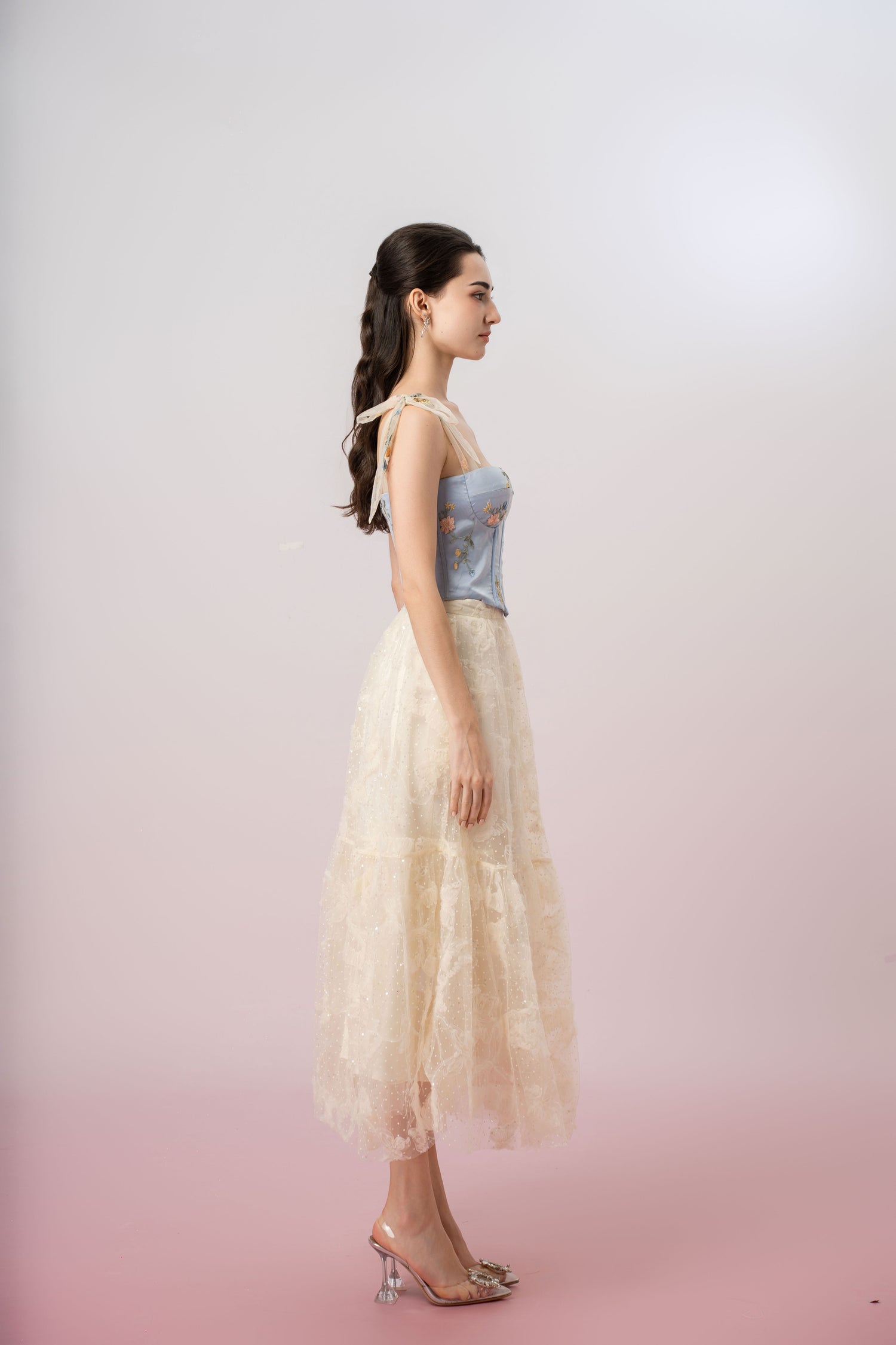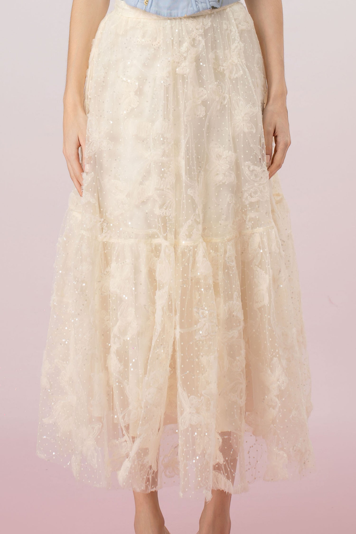 The Gertie Cream Emboss Mesh Long Skirt is a stunning fusion of ethereal charm and understated opulence. Crafted from soft, delicate mesh, this skirt features a captivating flocking print and intricate 3D applique detailing, offering a unique texture and dimension. Its midi length exudes elegance, while the gentle flow of the A-line silhouette enhances the graceful movement of the piece.