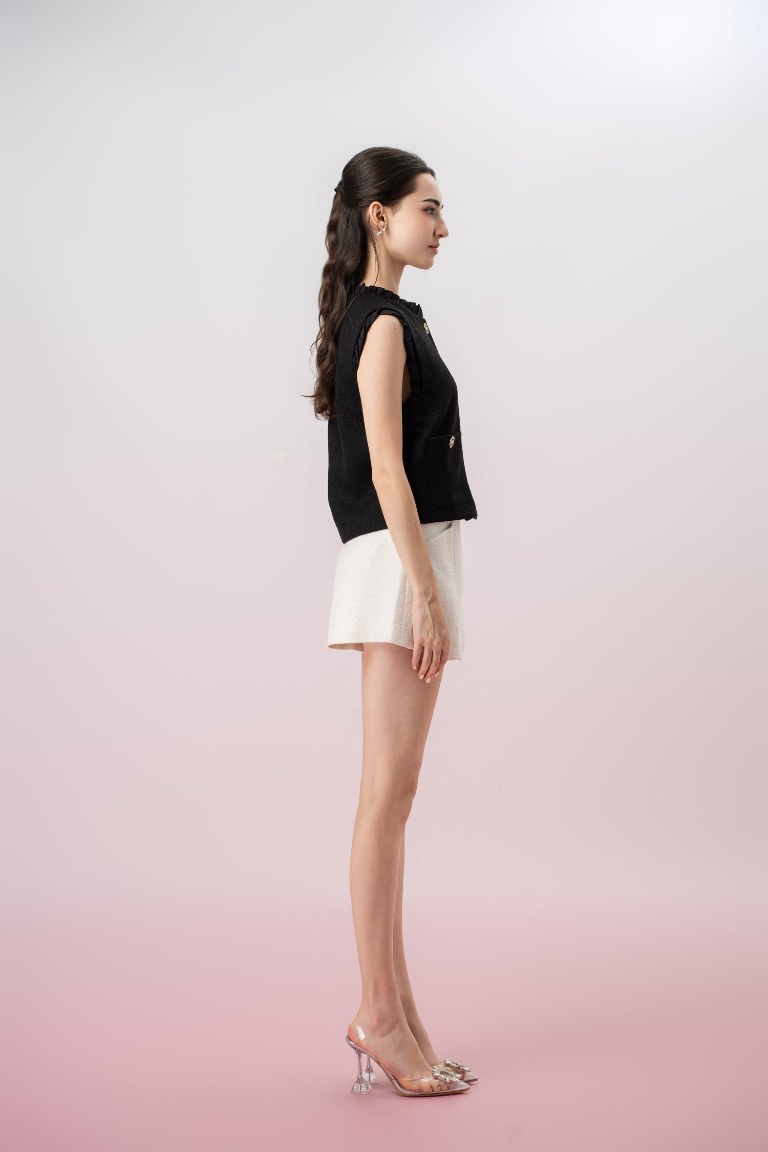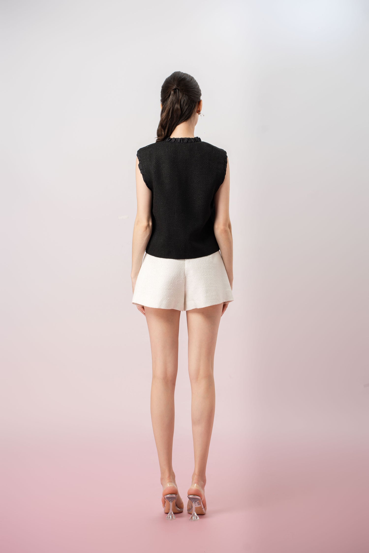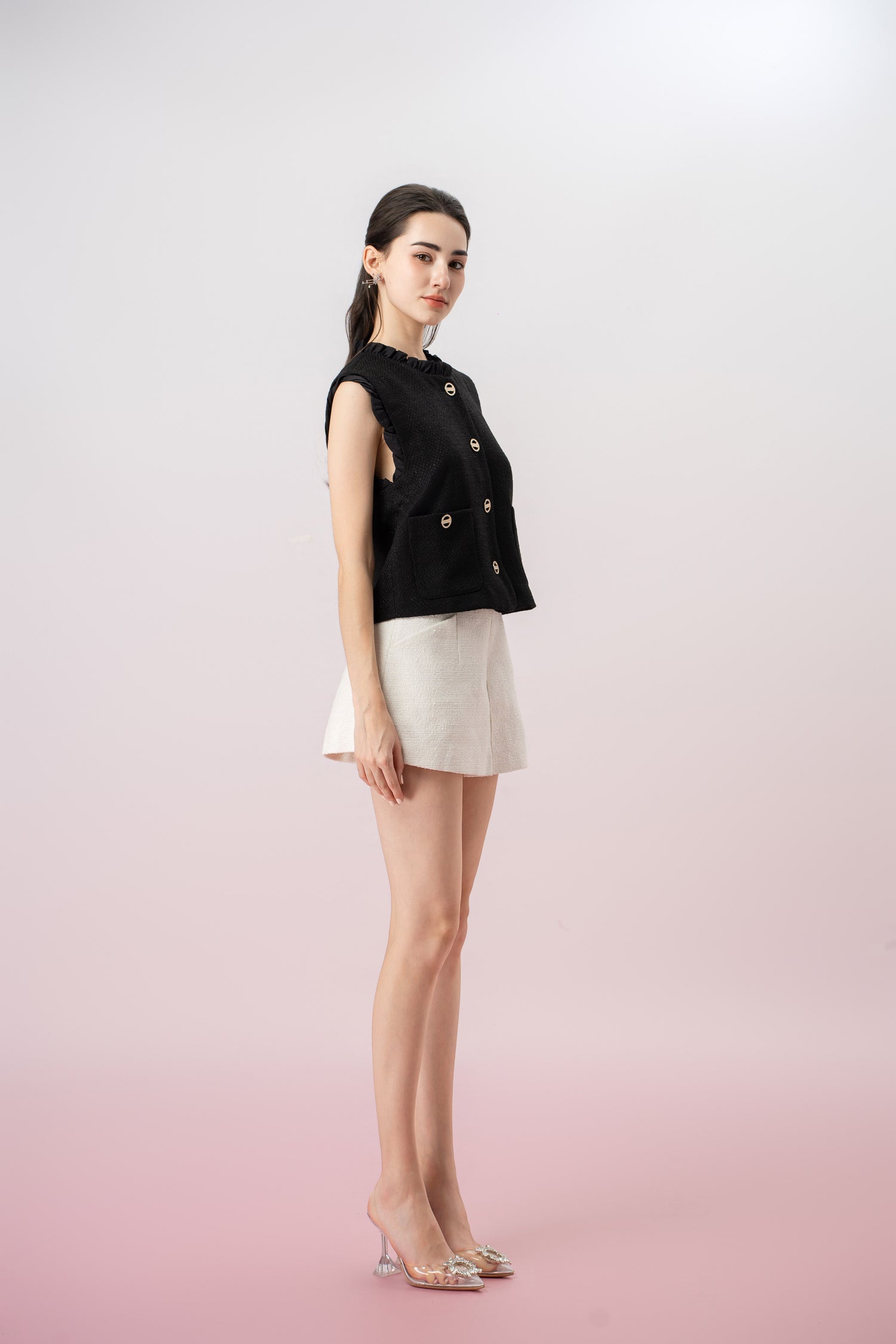 A ruffle tweed vest is a chic and versatile piece that combines the classic texture of tweed with playful ruffle details. This garment can be styled in various ways to fit different occasions, from casual outings to formal events.
