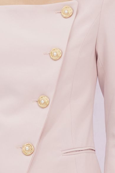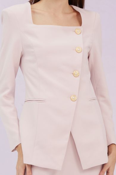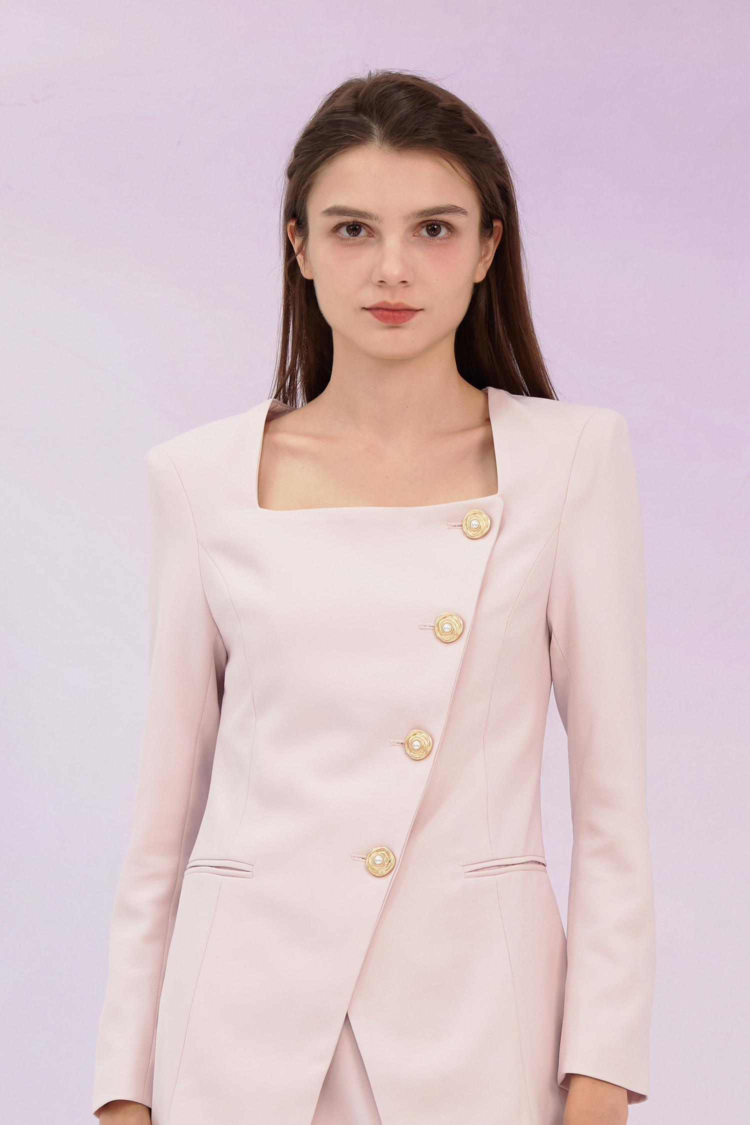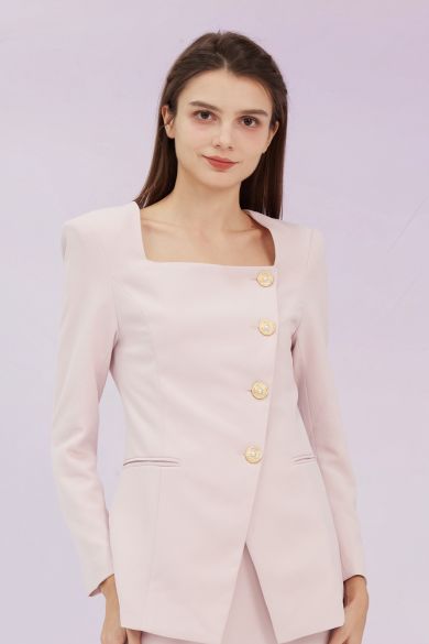 A modern and chic outerwear piece that combines the edginess of an asymmetrical cut with the sophistication of a square neck design.
