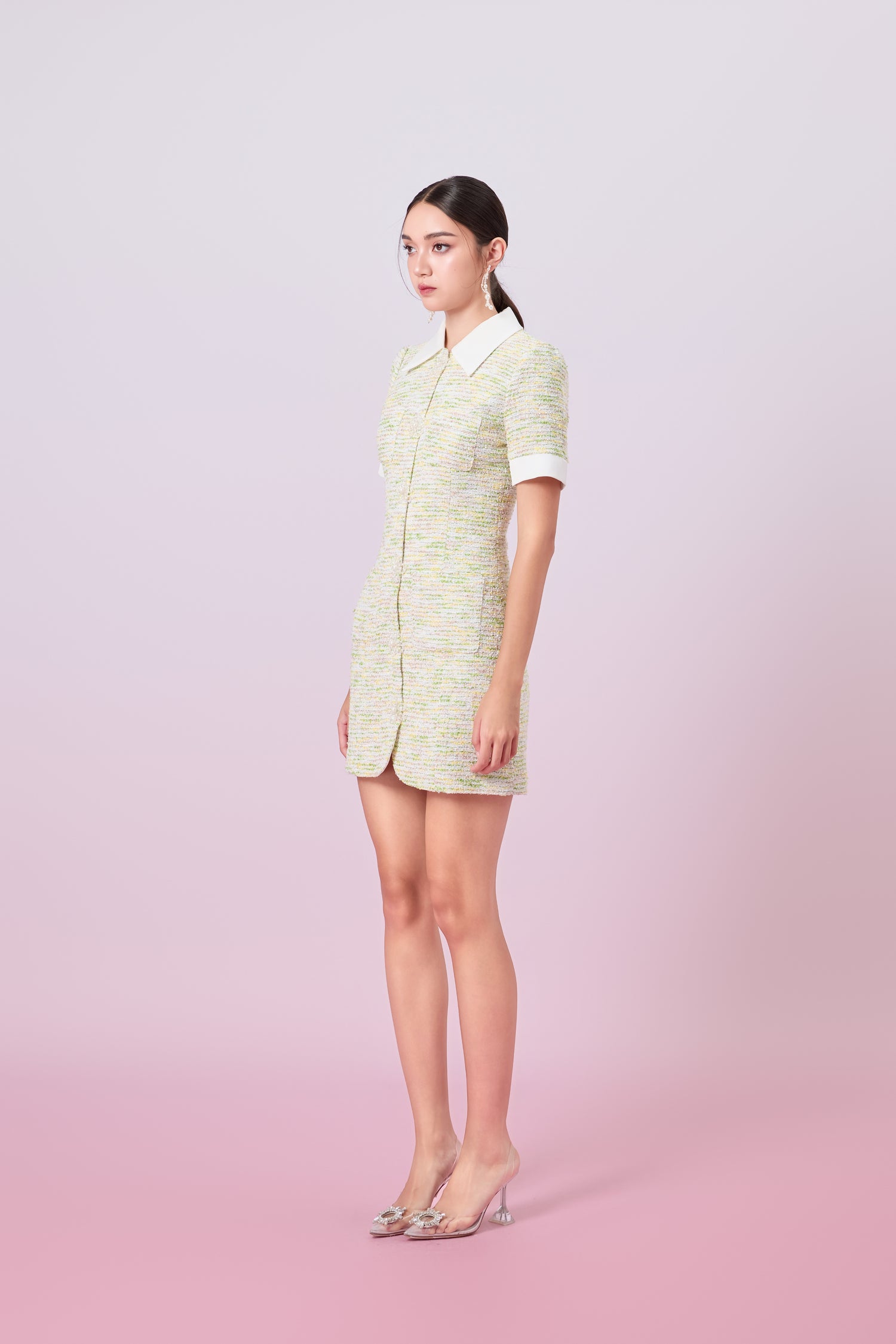Gitana Green Tweed Dress a classic and sophisticated piece that combines the timeless appeal of tweed with the polished detail of a white collar.