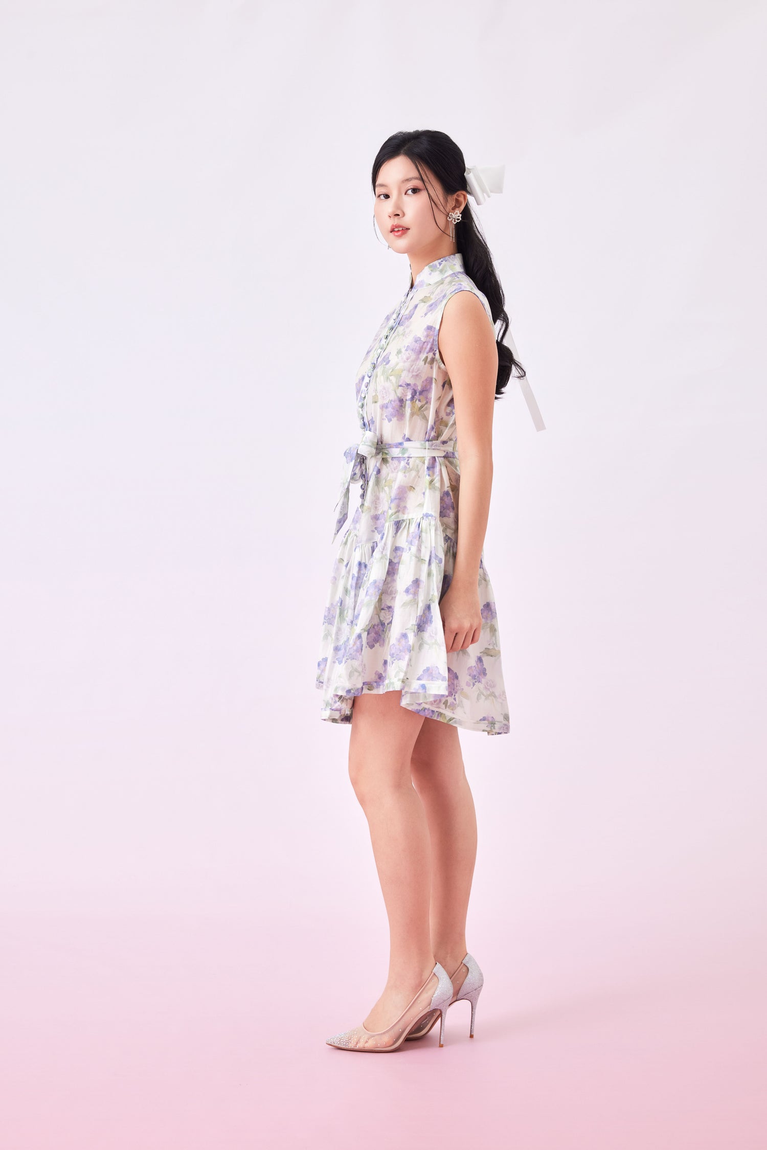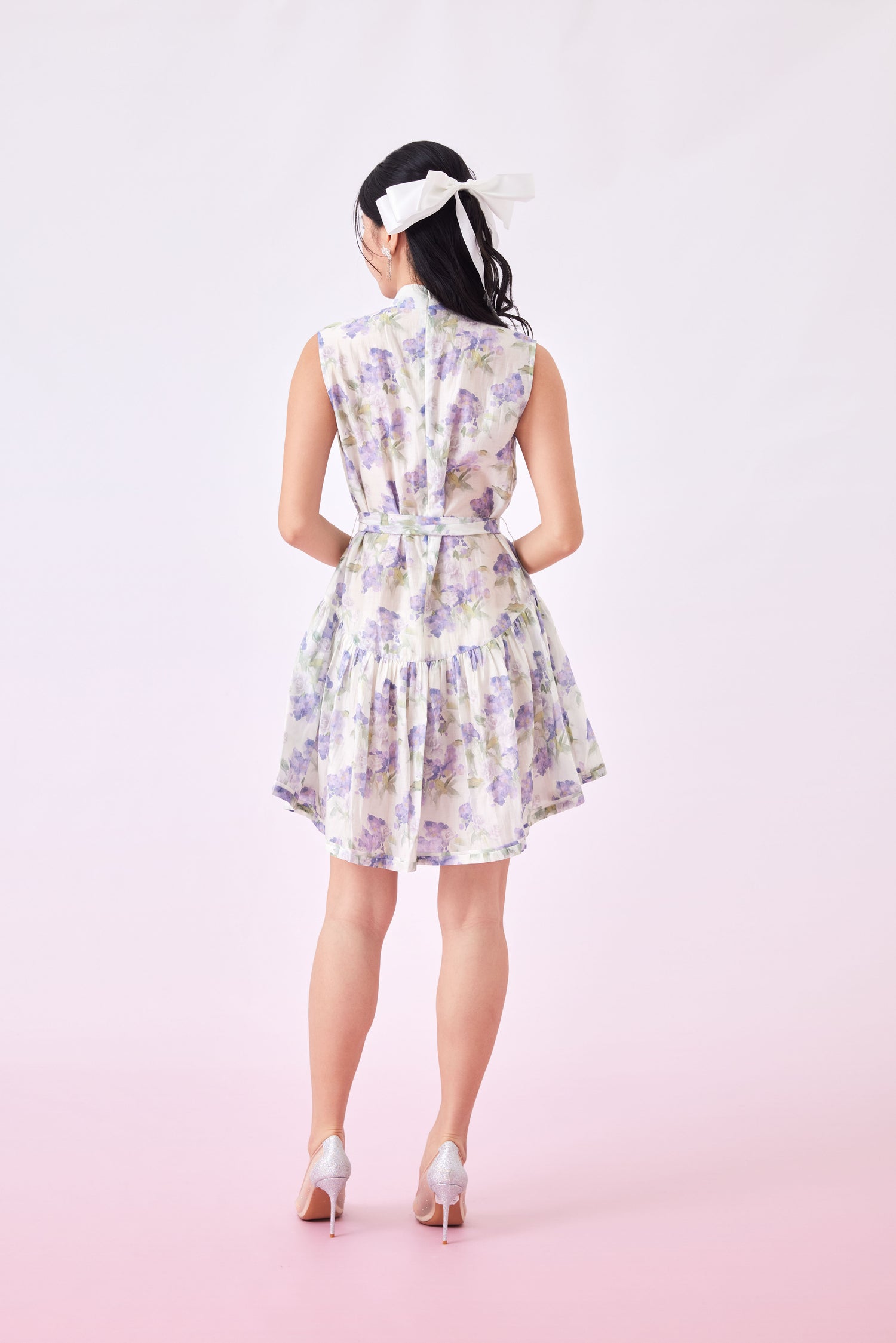 An elegant and charming mini dress cinched at the waist with a dainty self-tie ribbon belt to accentuate your feminine charm. This whimsical piece boasts a vibrant floral print, offering a playful yet sophisticated vibe. Perfect for twirling through sunny days or adding a pop of color to your evening ensemble.