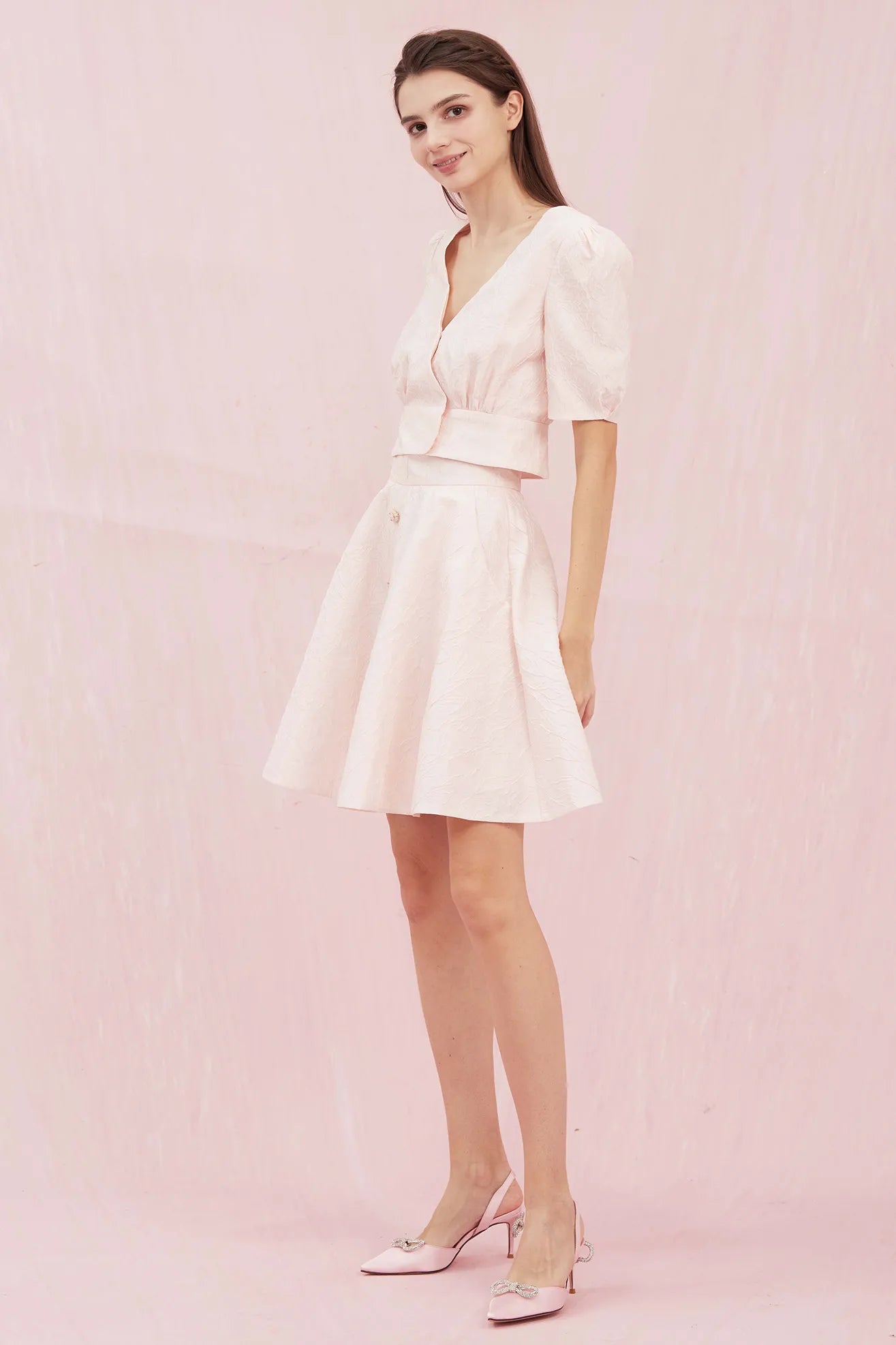 Elevate your wardrobe with our Gracella Pink Jacquard Top – a blend of luxurious jacquard fabric and contemporary design. This top features V neckline, short sleeves, and intricate jacquard detailing, creating a stylish and sophisticated garment that effortlessly transitions from day to night.