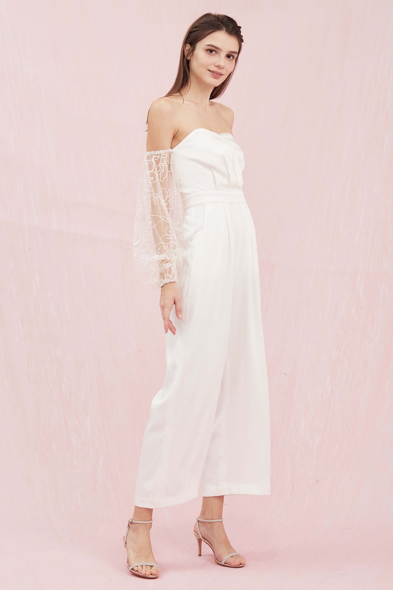 Indulge in the epitome of elegance with our Gwynith White Off Shoulder Jumpsuit – a mesmerizing ensemble that seamlessly blends a flattering sweetheart neckline with the versatility of detachable off-shoulder sleeves. This jumpsuit is designed to captivate, offering a perfect balance of sophistication and on-trend glamour.