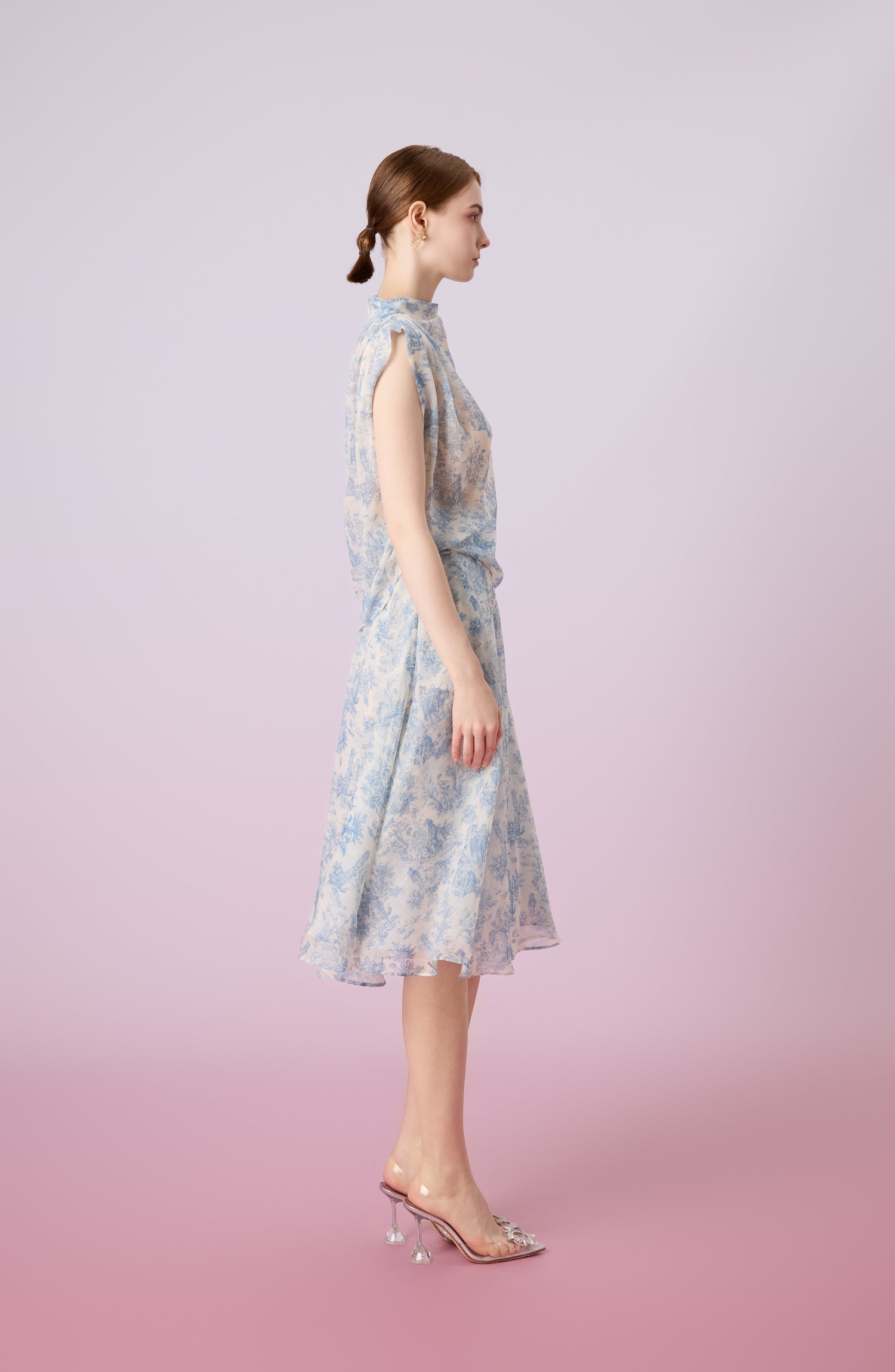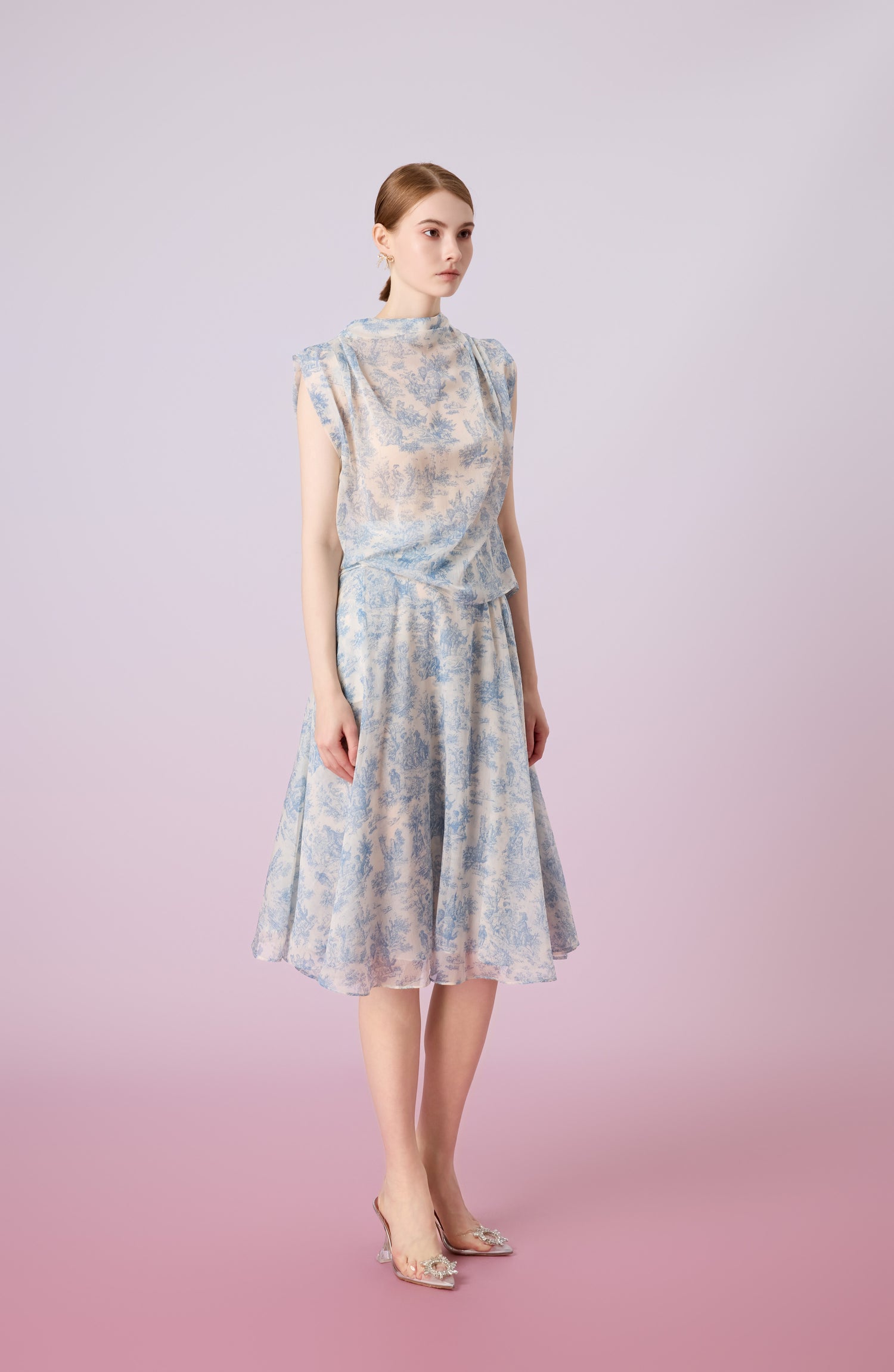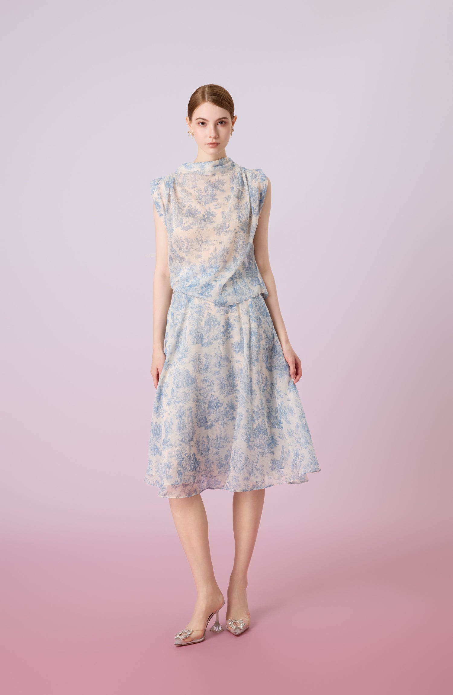 The Jacalin Blue Print in hite sleeveless top is light as air and effortlessly chic, this printed chiffon top is the perfect blend of comfort and sophistication. Its high neckline and flowy silhouette make it a versatile piece for both workdays and weekend outings. The delicate all-over print adds a touch of personality and visual interest.