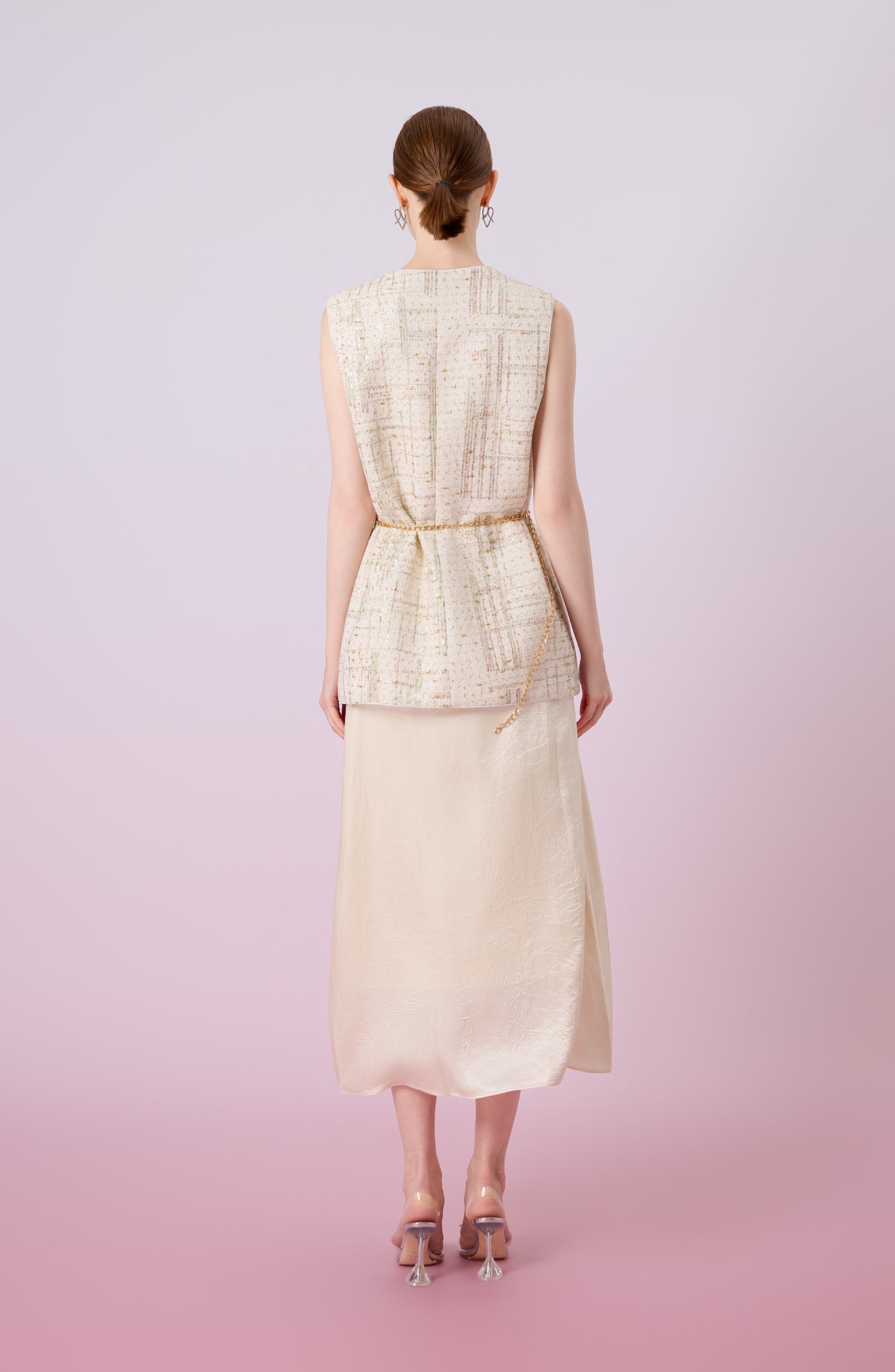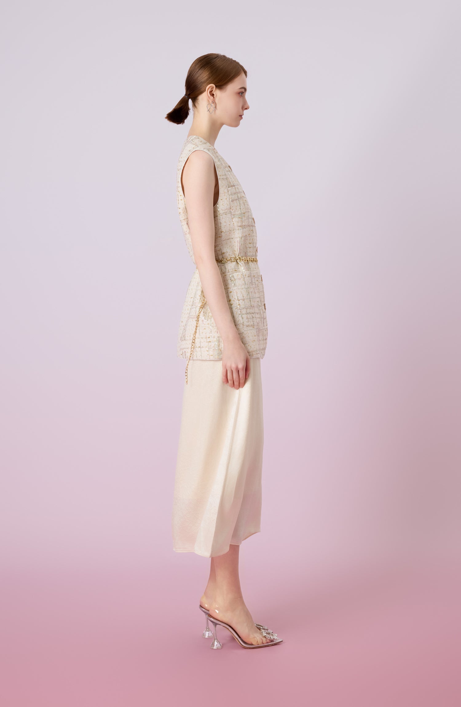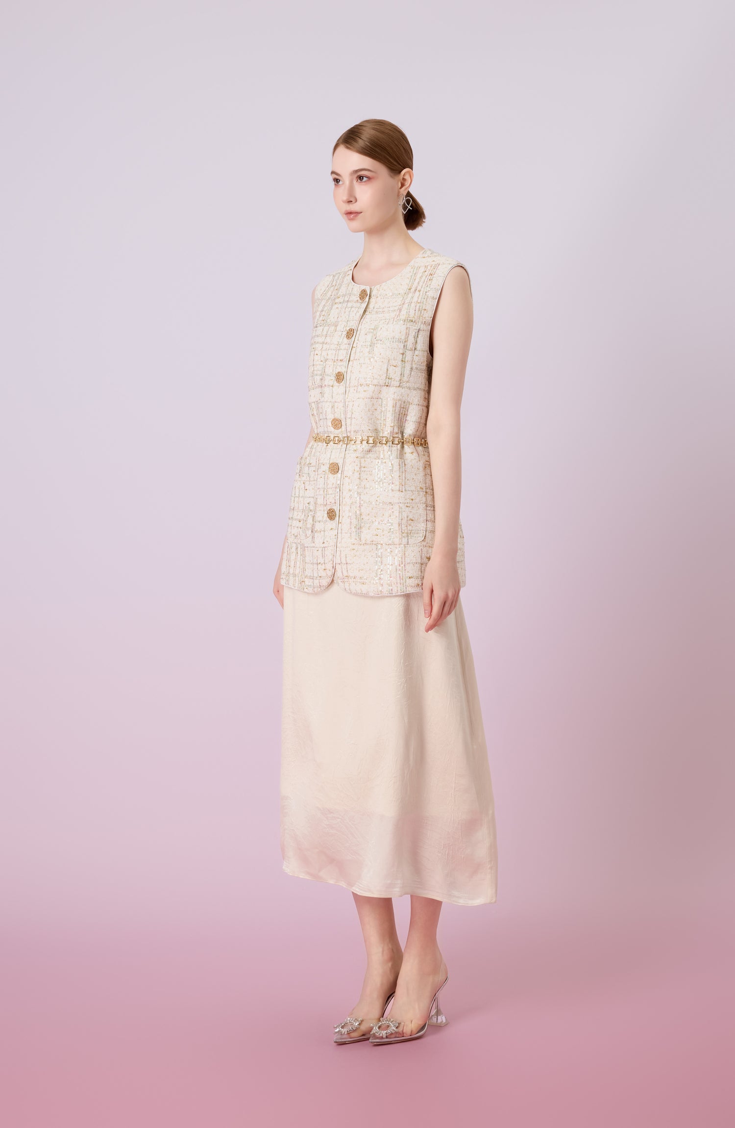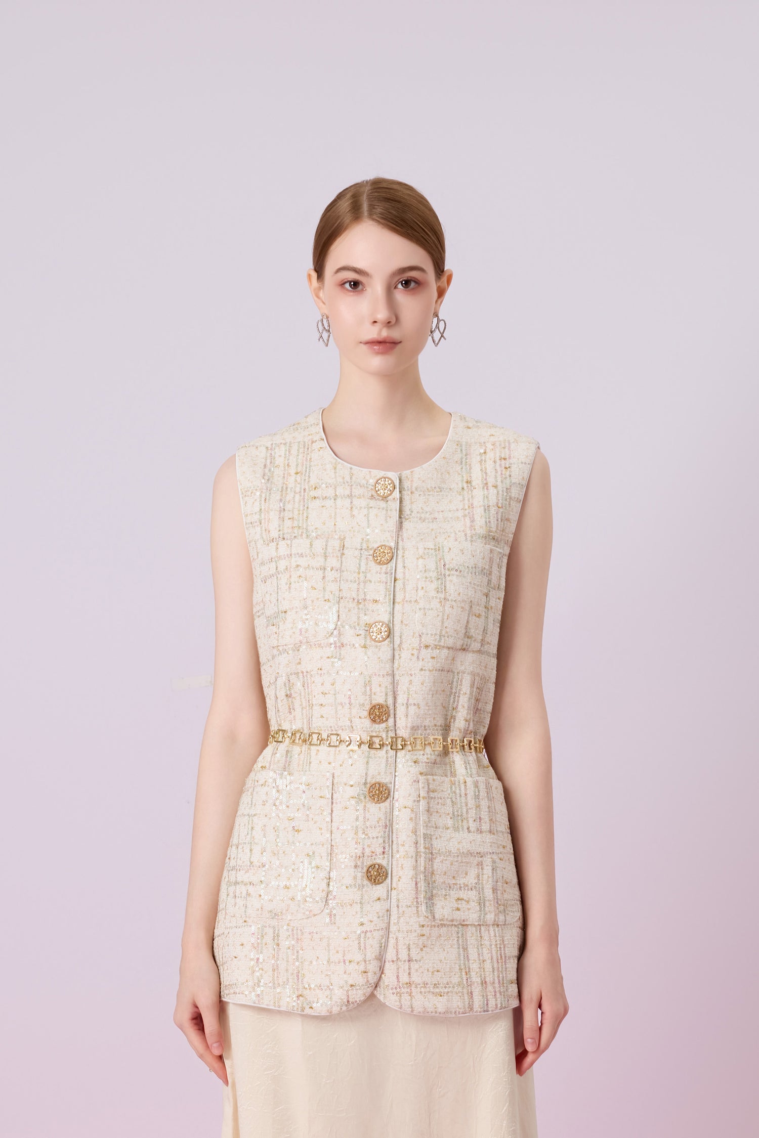 The Jacklynne Beige Sequin Tweed Vest Top blends classic tailoring with glam appeal. Crafted from textured tweed with subtle sequins, it adds a touch of sparkle to any look. The elongated silhouette offers a chic, modern edge, while a sleek metal chain belt cinches the waist for a bold, polished finish. Perfect for effortless layering with statement style.