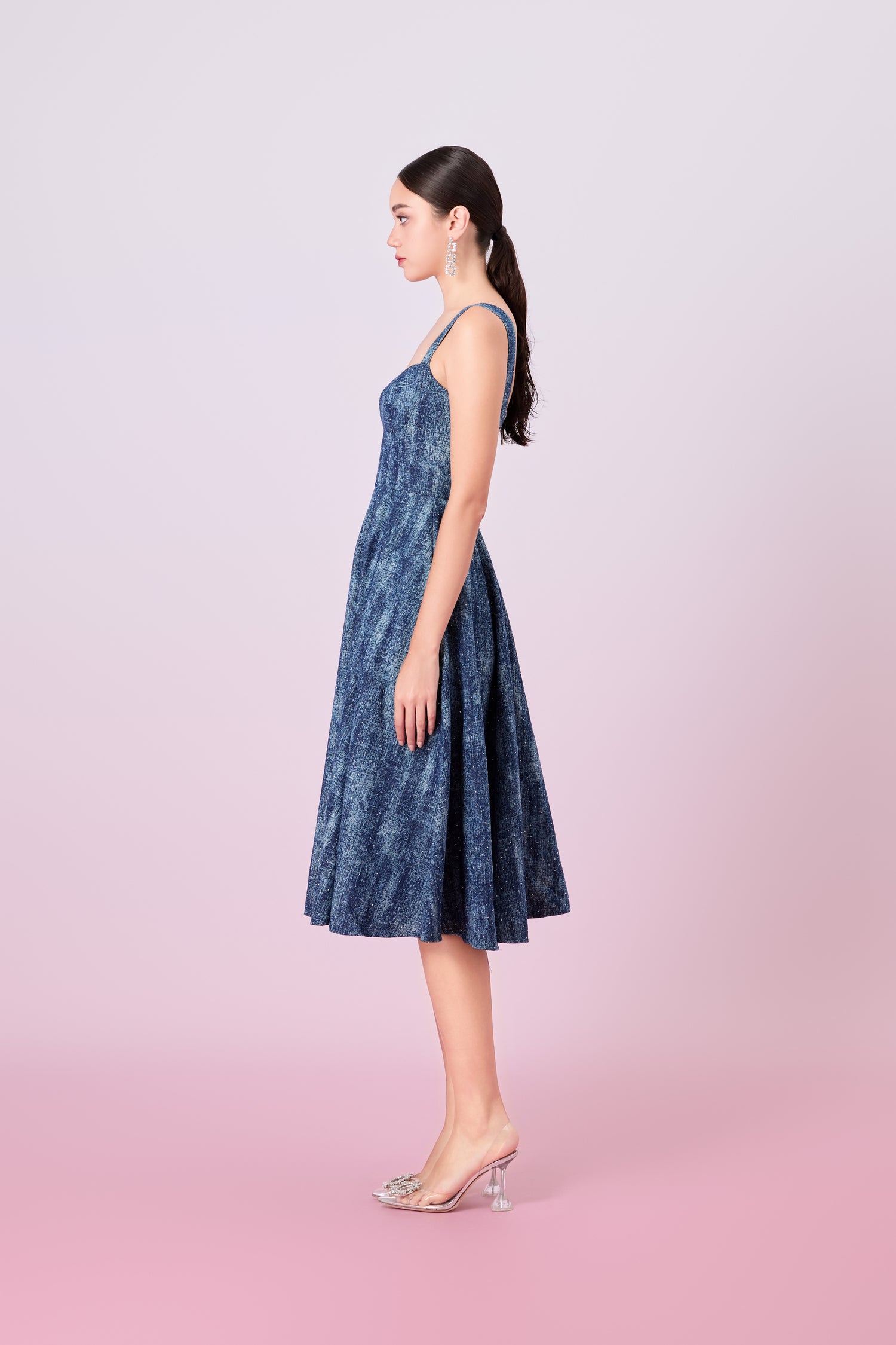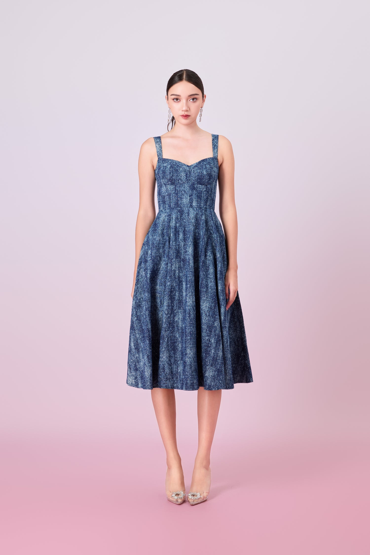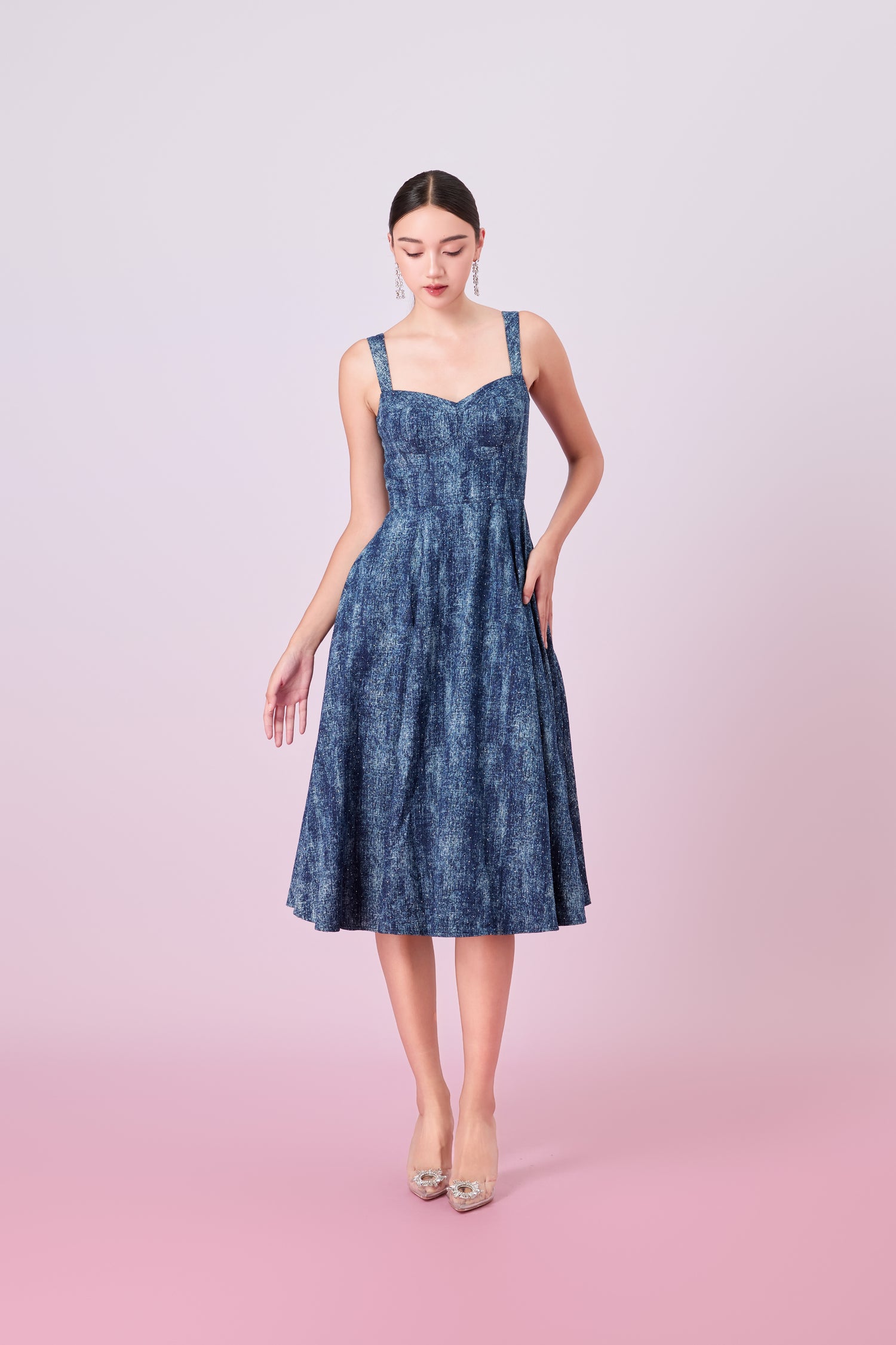 The Jacqueleen Twinkle Dark Blue Strap Long Dress offers a stylish blend of casual and glam, perfect for adding a bold statement to your wardrobe. Crafted from rich dark blue denim, this bralet-style dress features a padded structure that provides shape and support with a flattering midi-length A-line style dress ensuring both comfort and a flattering fit. The unique embellishments add a touch of sparkle and elevate the classic denim fabric, making it a standout piece.