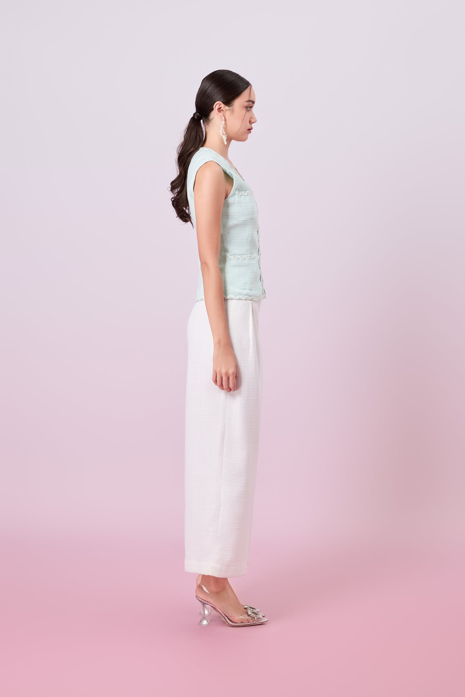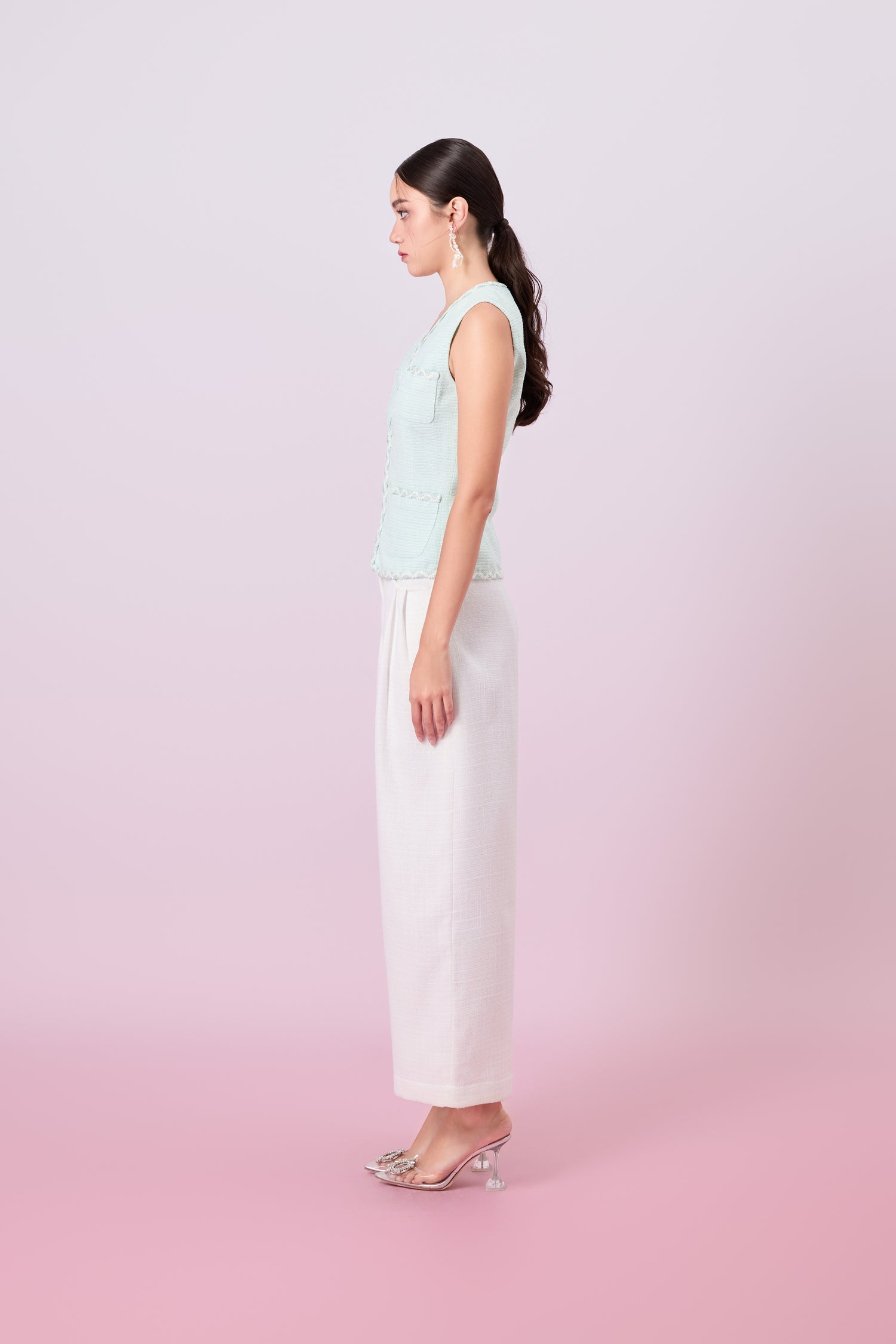 Add a pop of color and texture to your outfit with this Jacquelin Light Green Tweed V-neck Top, designed to combine classic sophistication with feminine charm. Crafted from soft, textured tweed fabric, the vest features a flattering tailored fit that accentuates the waist, Ideal for both casual and dressier occasions