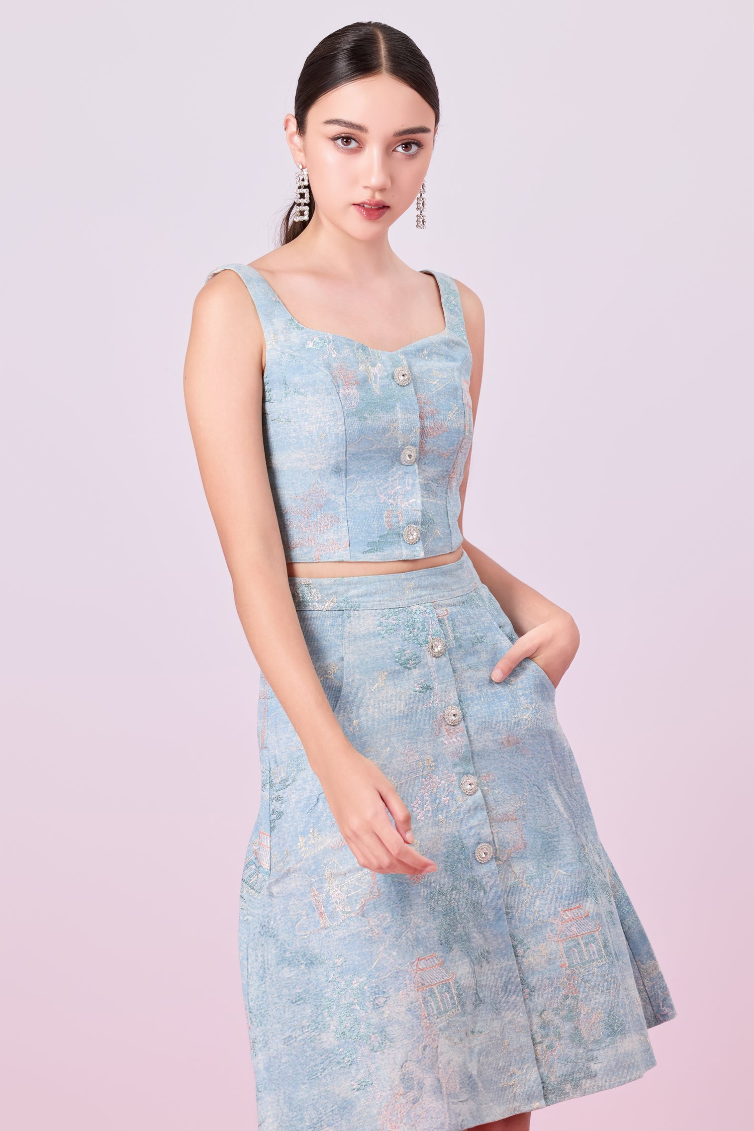 Playful yet polished, this Jacquette Blue Denim Front Button A-Line Skirt updates a timeless silhouette with artisanal charm. The A-line cut flatters the figure with ease, while decorative front buttons add a stylish accent to its casual-cool appeal. Perfect for everyday wear or weekend outings, it’s a versatile piece you’ll reach for again and again.
