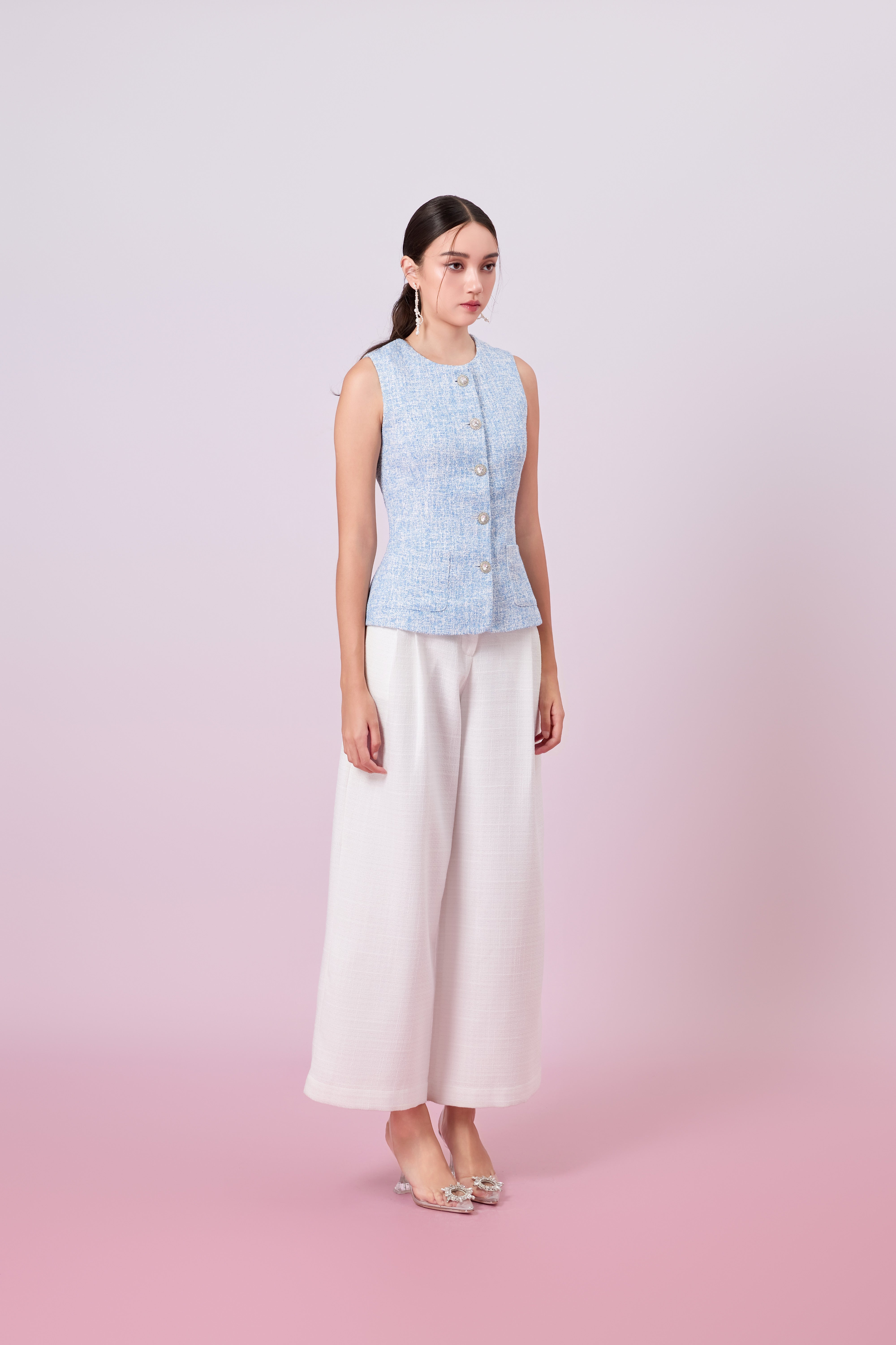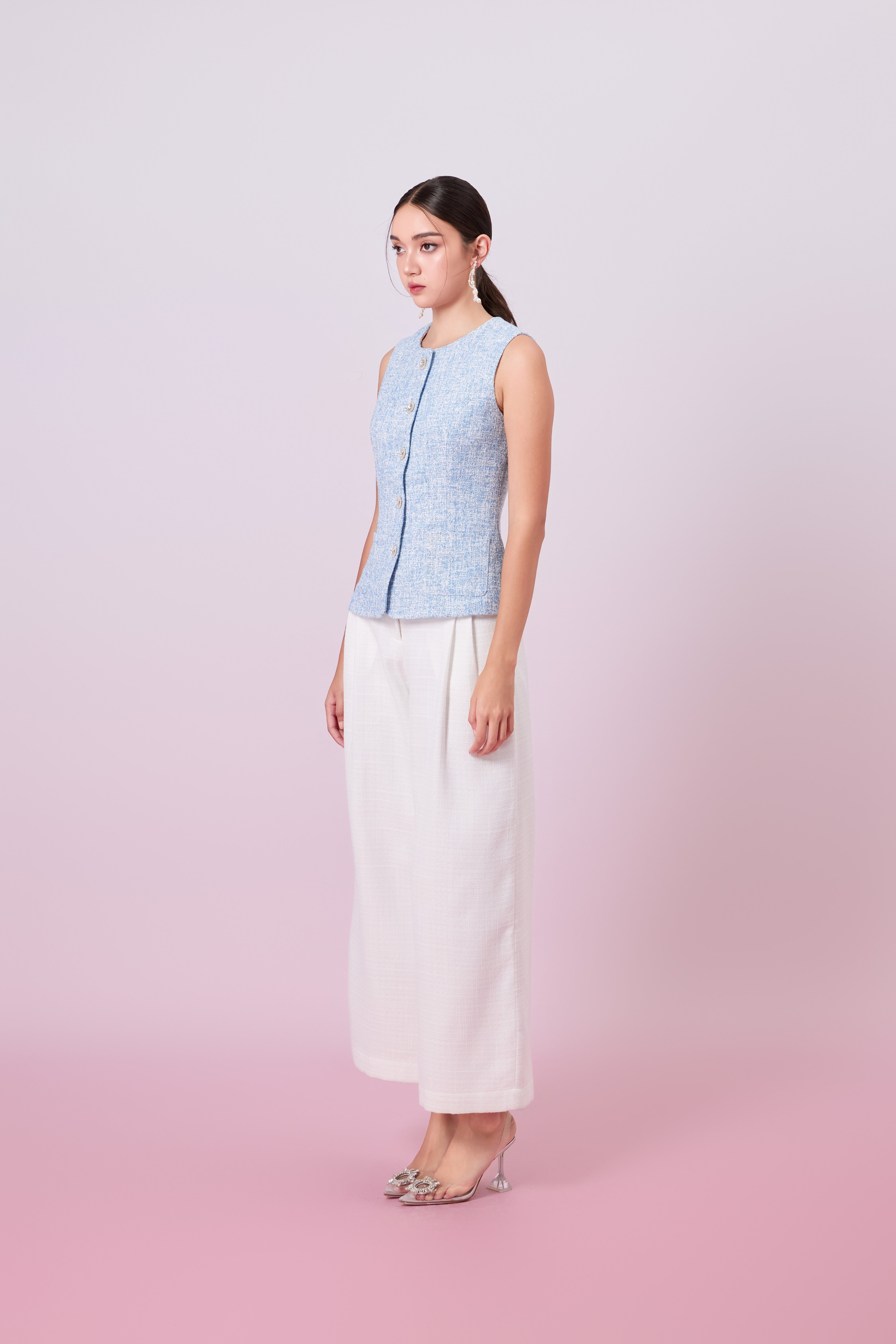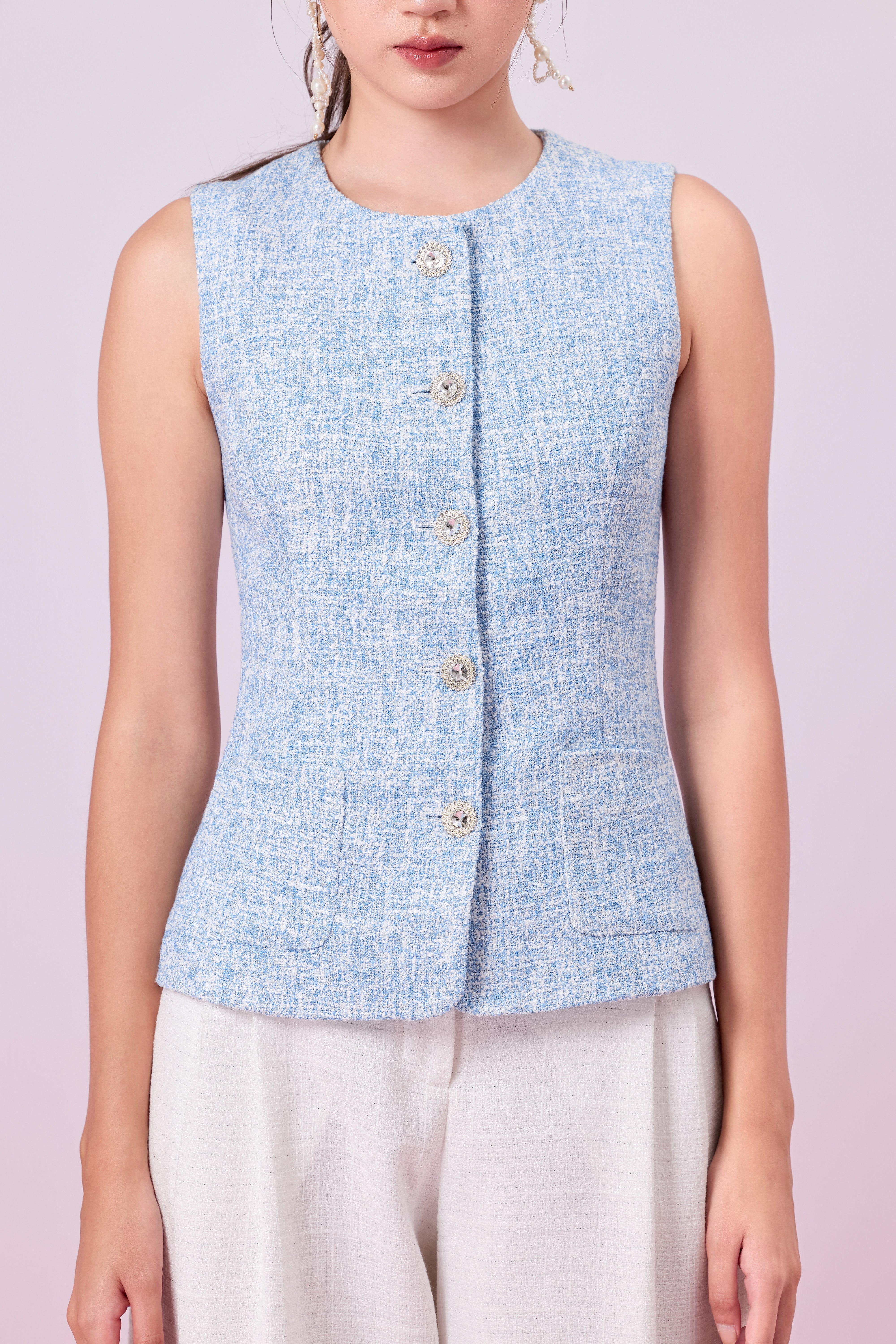 The Jaquelyn Blue Tweed Sleeveless Vest a refined tailoring meets modern edge, a versatile layering piece that brings sophistication to any outfit. Sleeveless vest silhouette with a tailored cut for a sharp, flattering fit. Detailed with front button closure for a polished, put-together finish.
