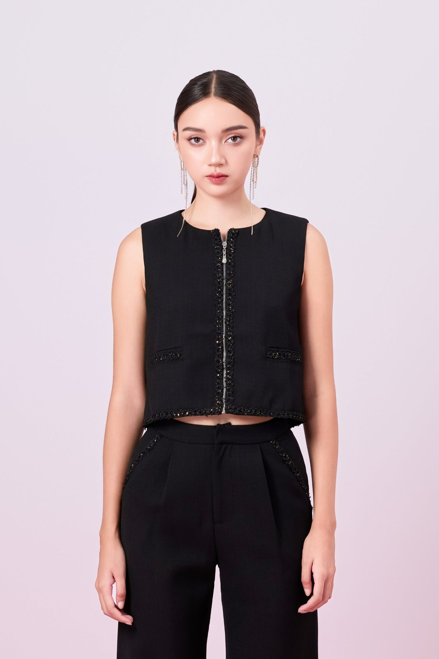 Jewelyn Black tweed front zipper vest, a mix of Parisian polish and modern tailoring, perfect for work-to-weekend dressing . Crafted from classic woven tweed, the vest features a sleek front zipper closure for a modern twist and is finished with intricate braided trims that add a touch of artisanal detail.