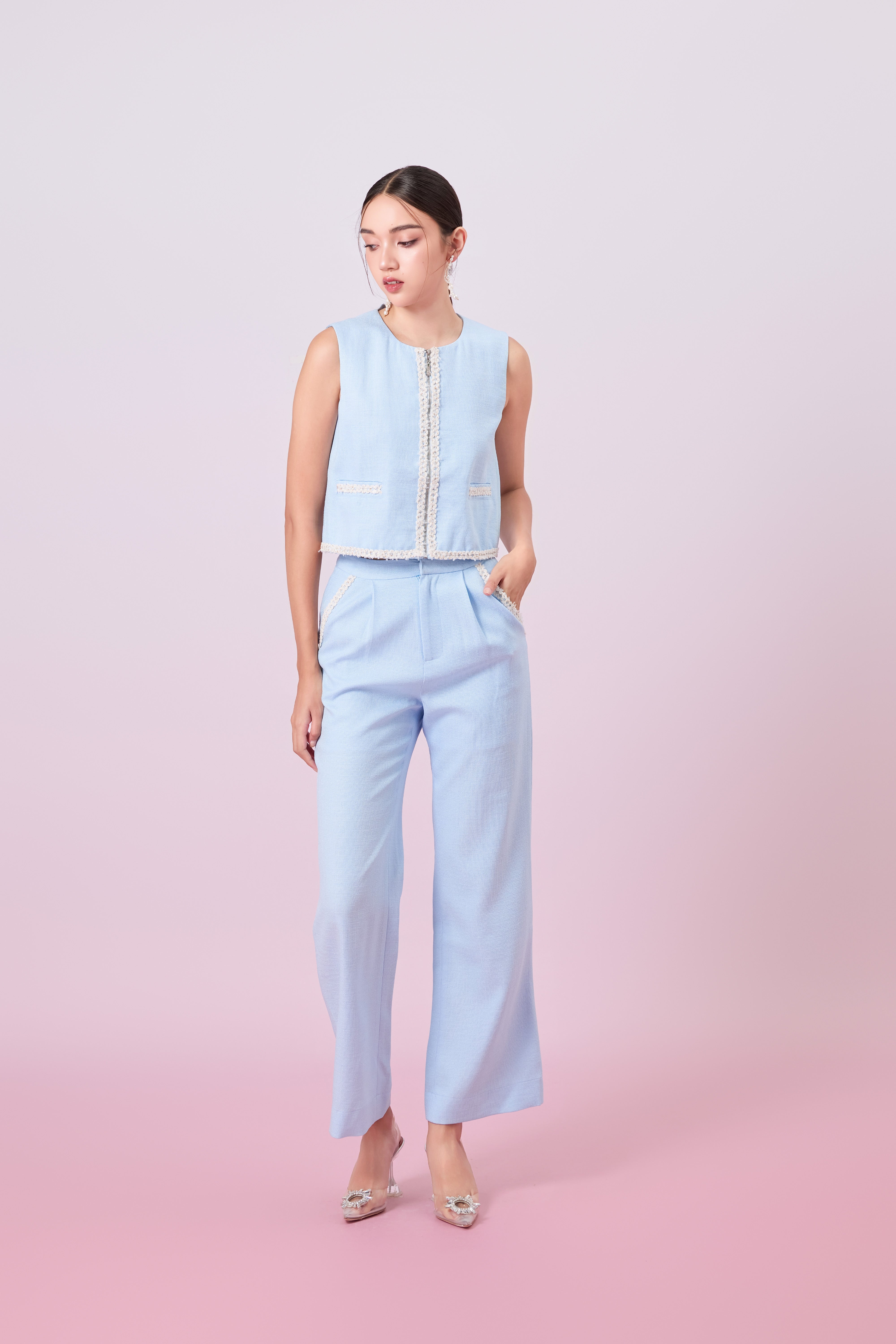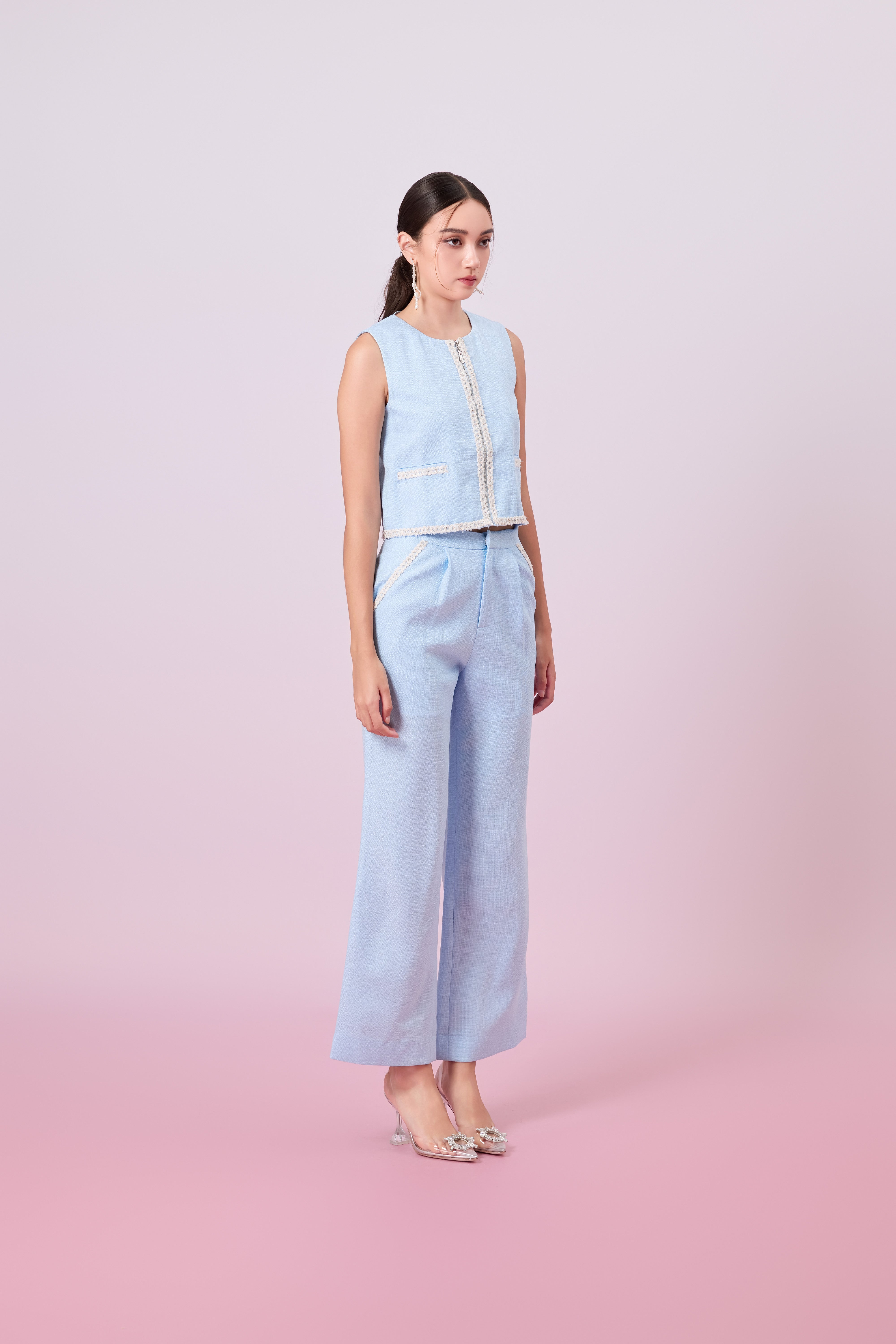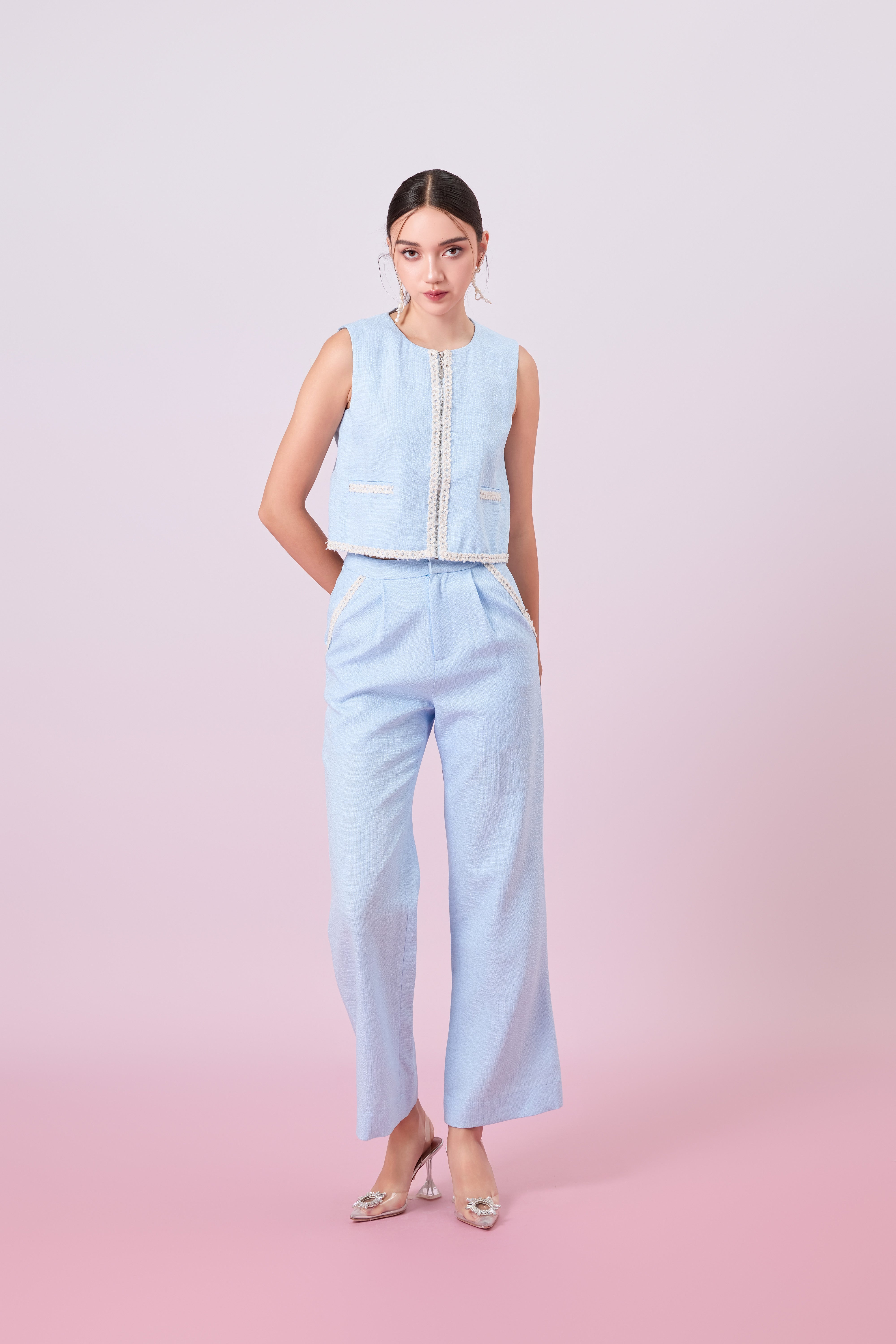 Add a soft touch of sophistication to your wardrobe with these Jewelyn Blue Tweed Straight Pants. Cut in a timeless straight-leg silhouette, these pants are crafted from textured pastel tweed that blends classic tailoring with a modern color palette. The high-waisted fit flatters the figure, while the structured yet comfortable fabric offers all-day polish.