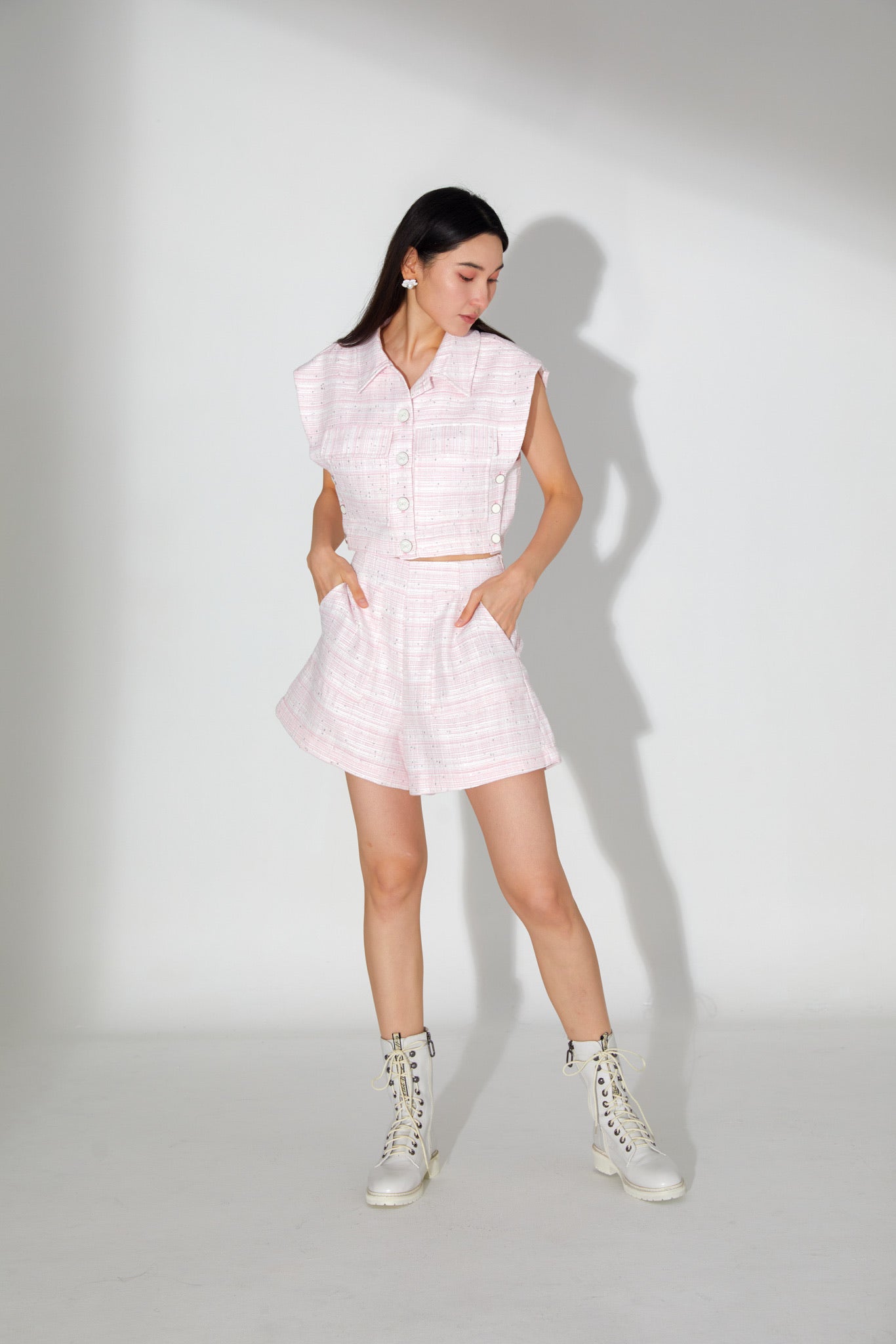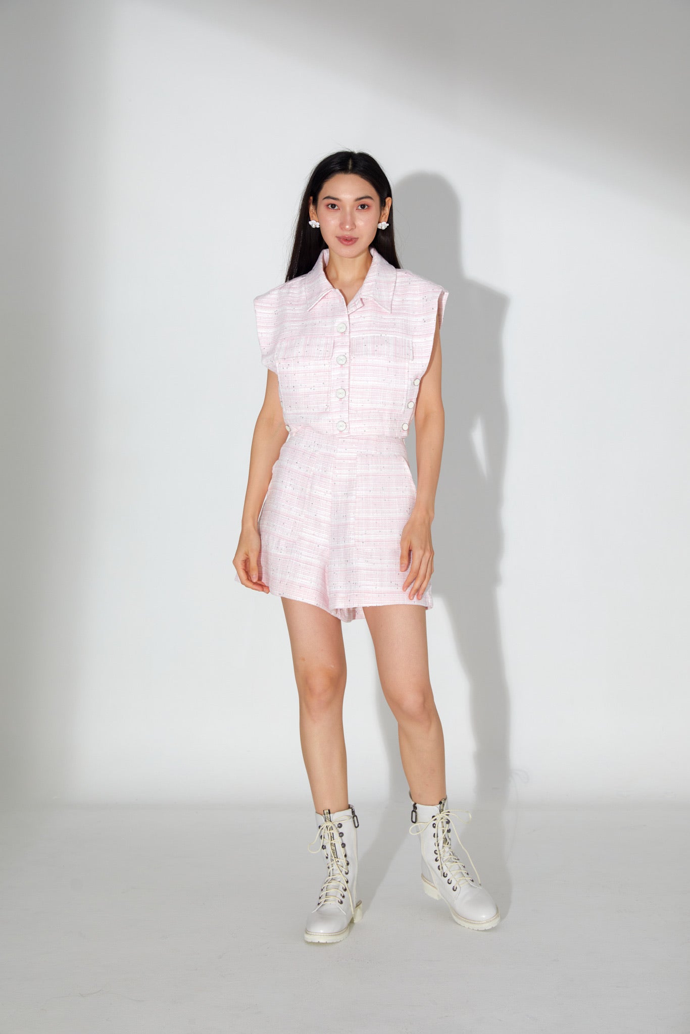 Match with Jolie White Sequin Tweed Shorts that features an A-line silhouette and high-rise fit. Comes with functional side pockets.