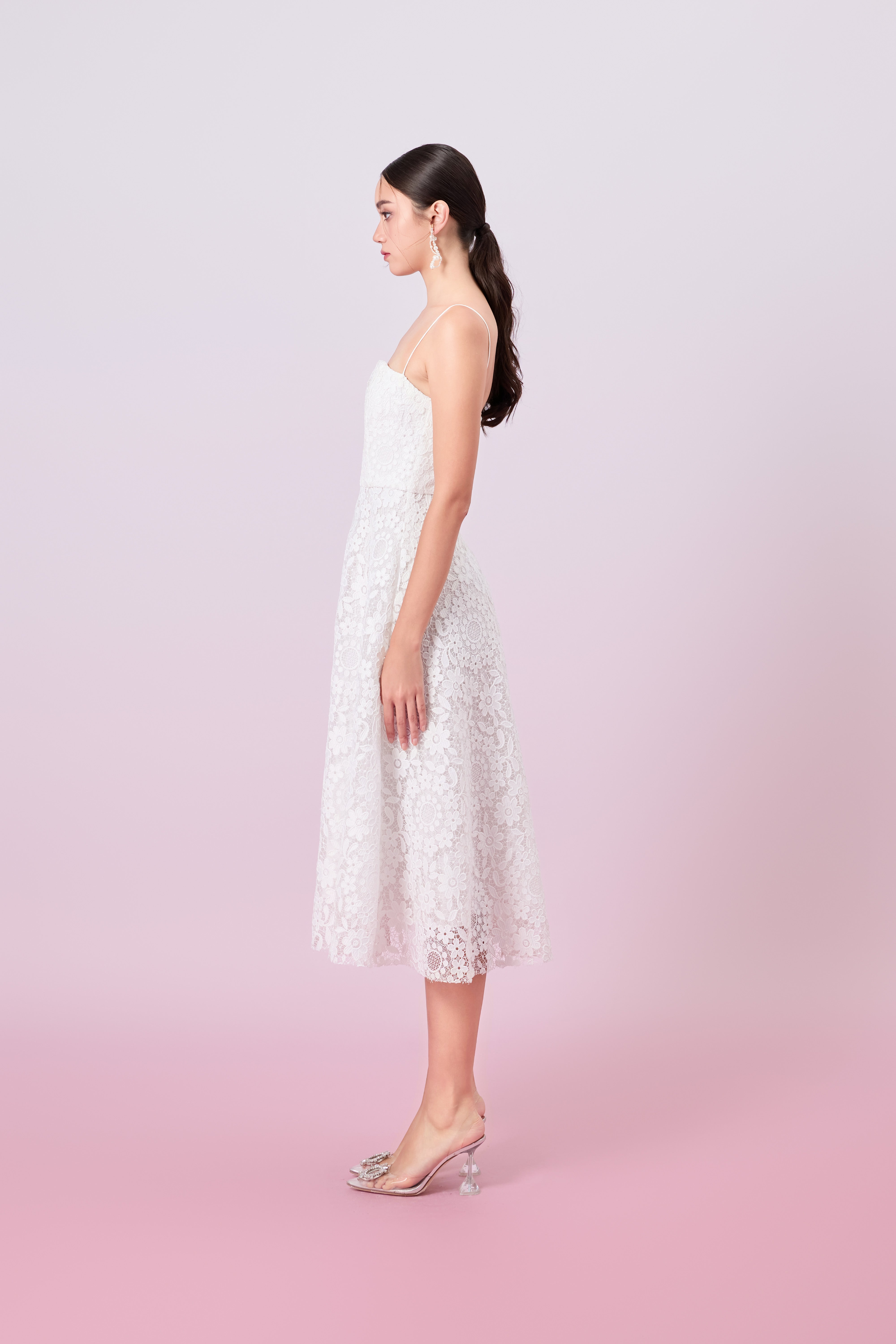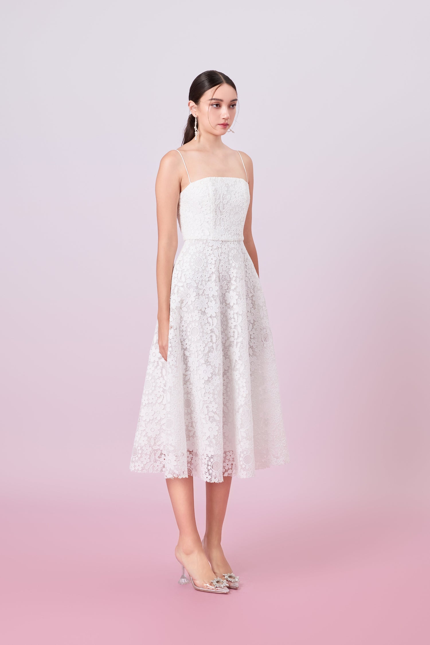The Juelline White Flower Lace Long Dress exudes timeless elegance with its delicate lace fabric Featuring a flattering flare-fitted silhouette and midi length, this dress offers both comfort and style. The side pockets add a practical yet chic touch, making it perfect for garden parties, weddings, or any special occasion.