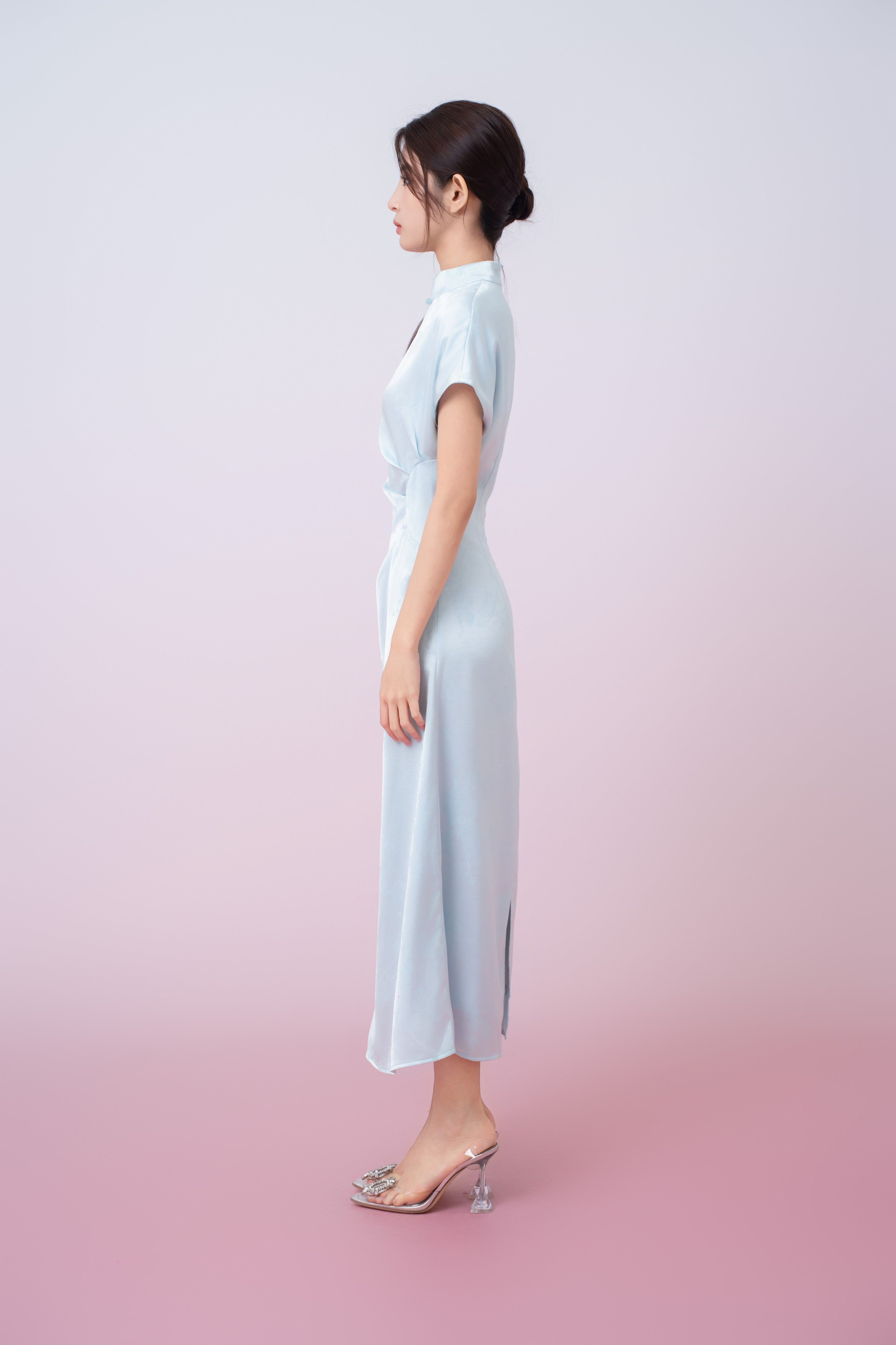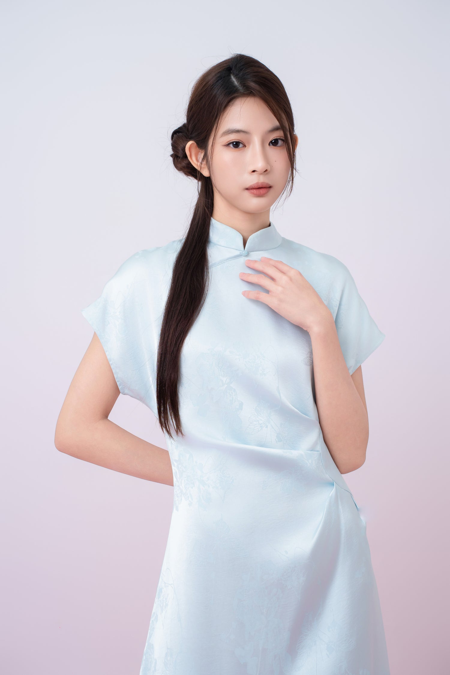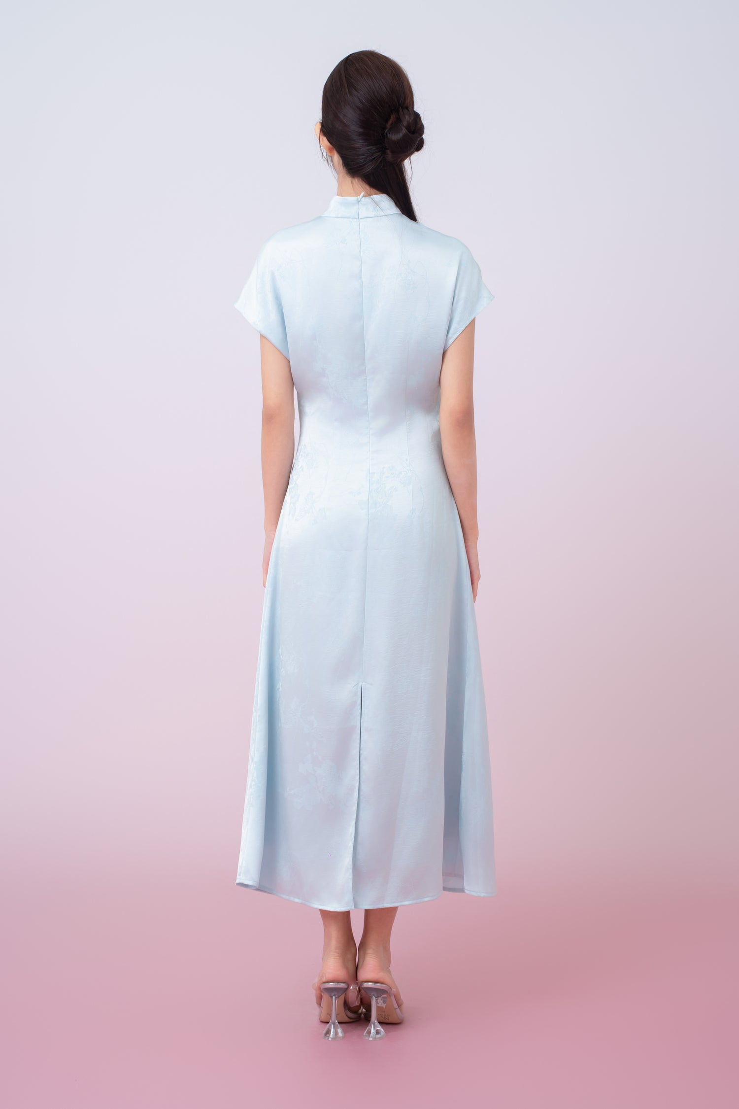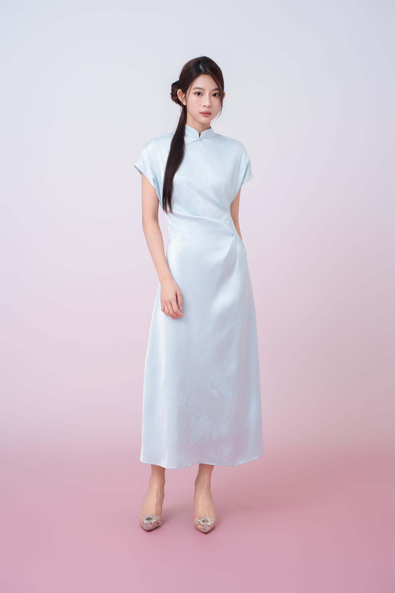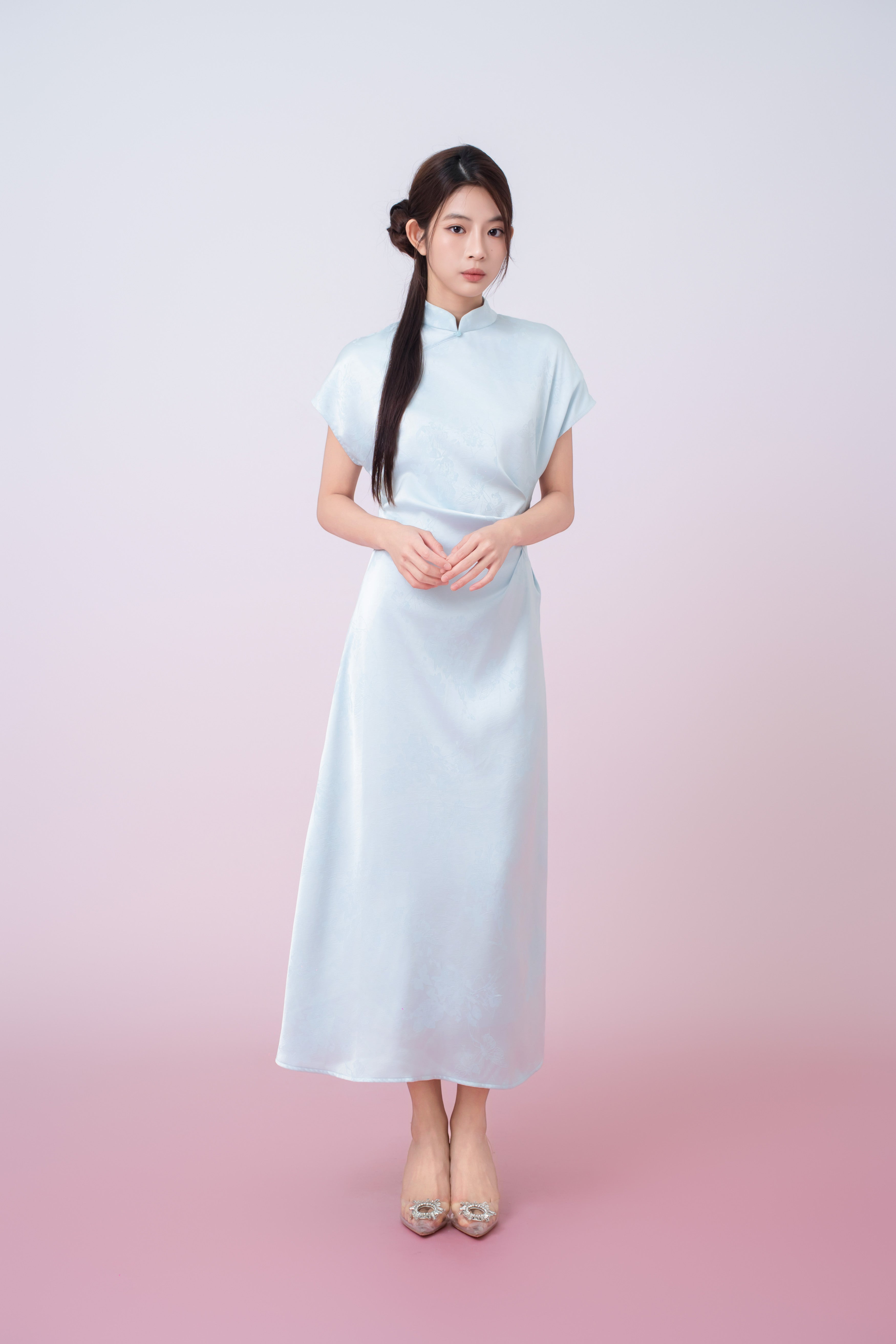 This refined Kaisley Light Blue Jacquard Mandarin Collar Dress showcases timeless elegance with a modern silhouette. Crafted from lustrous satin jacquard fabric, it features a subtle floral pattern that catches the light beautifully. The classic stand collar and asymmetric frog-button closure highlight traditional Chinese design elements, while the tailored fit and soft draping at the waist create a flattering, feminine shape.