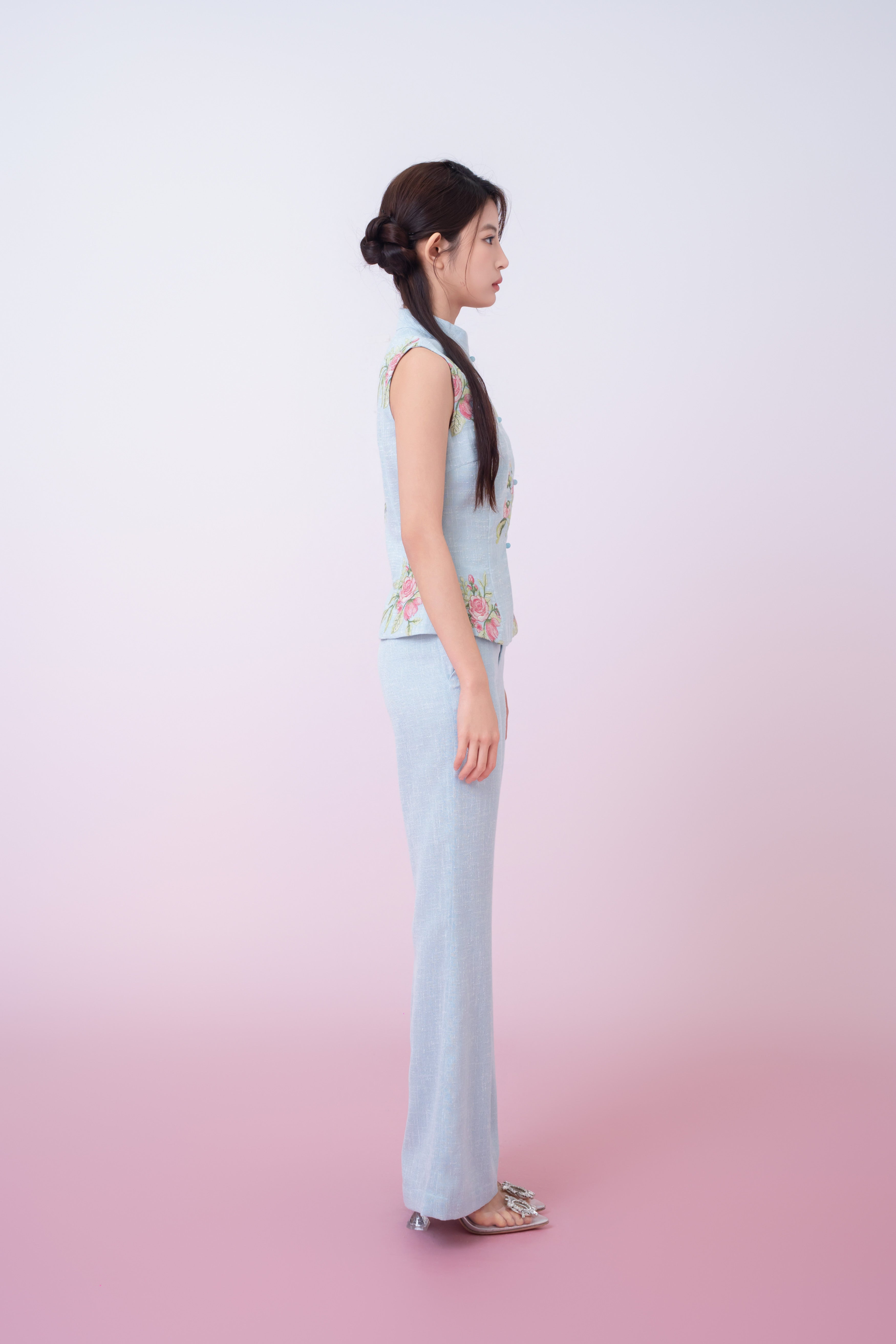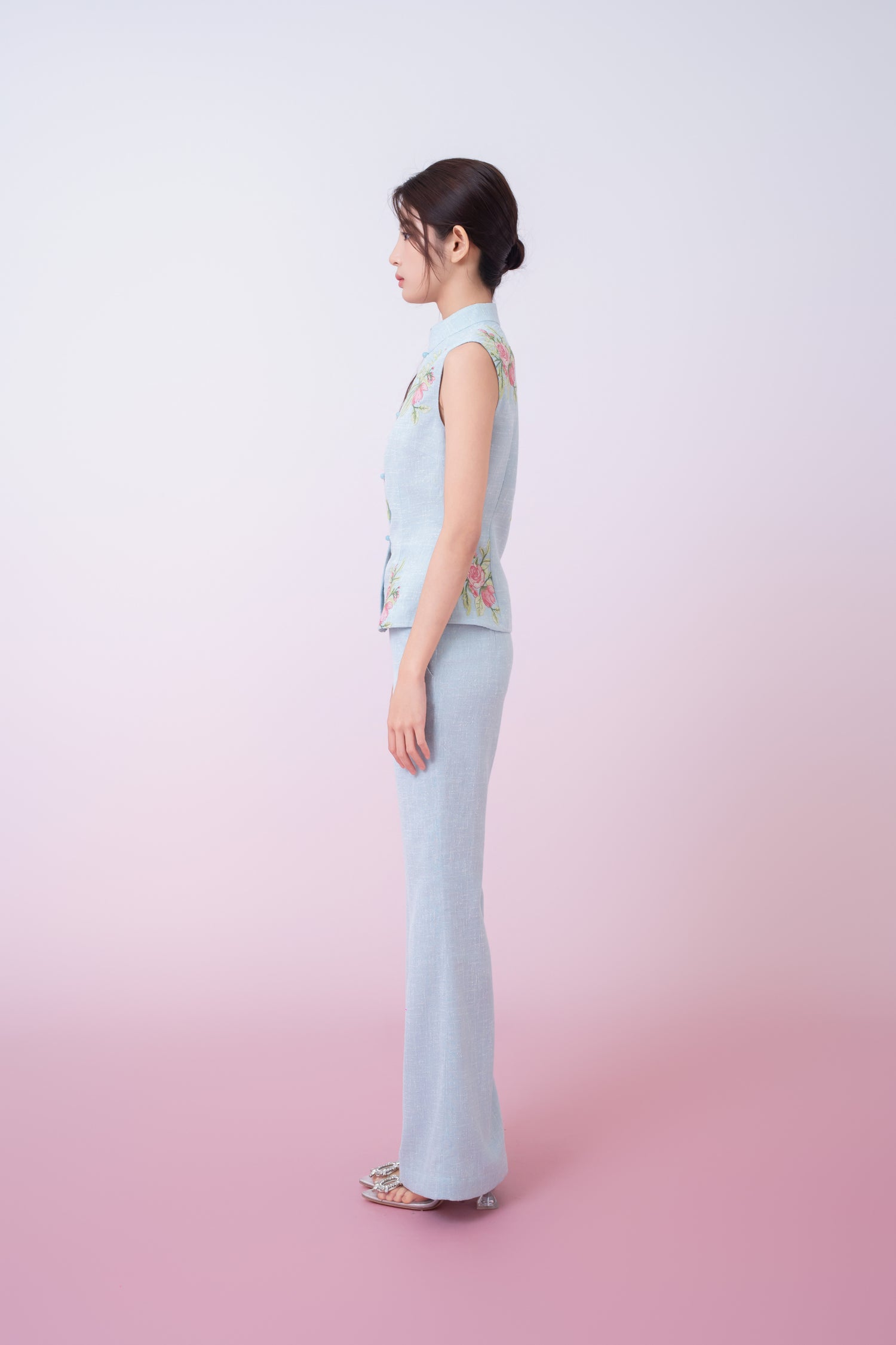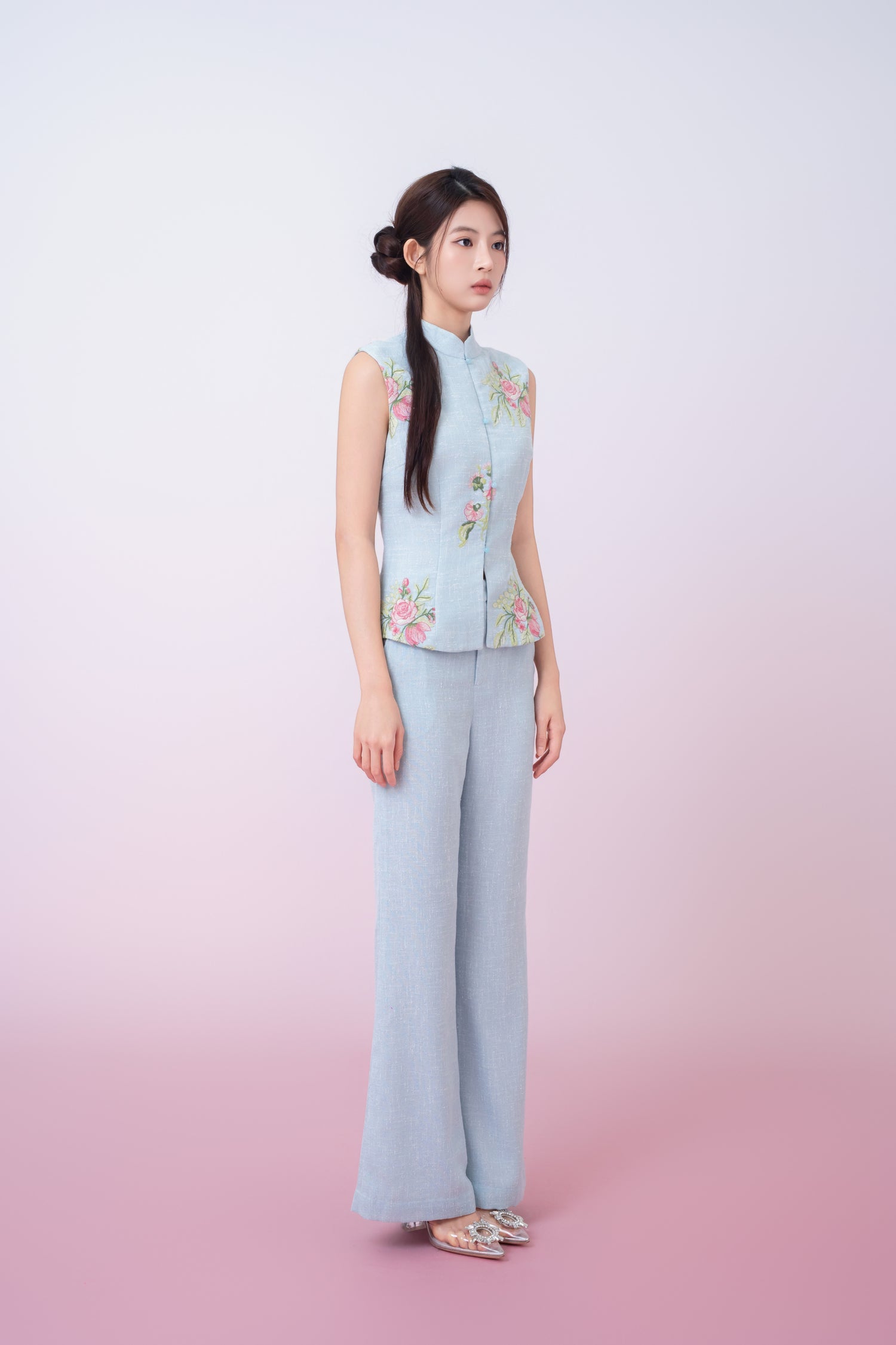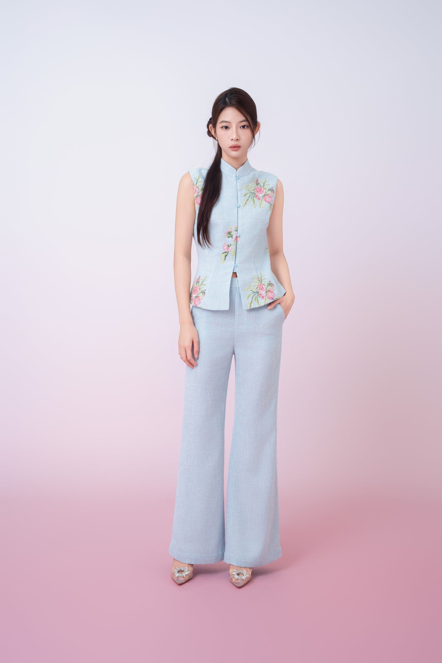 Kaleah Light Blue With Floral Embroidered Flare Pants