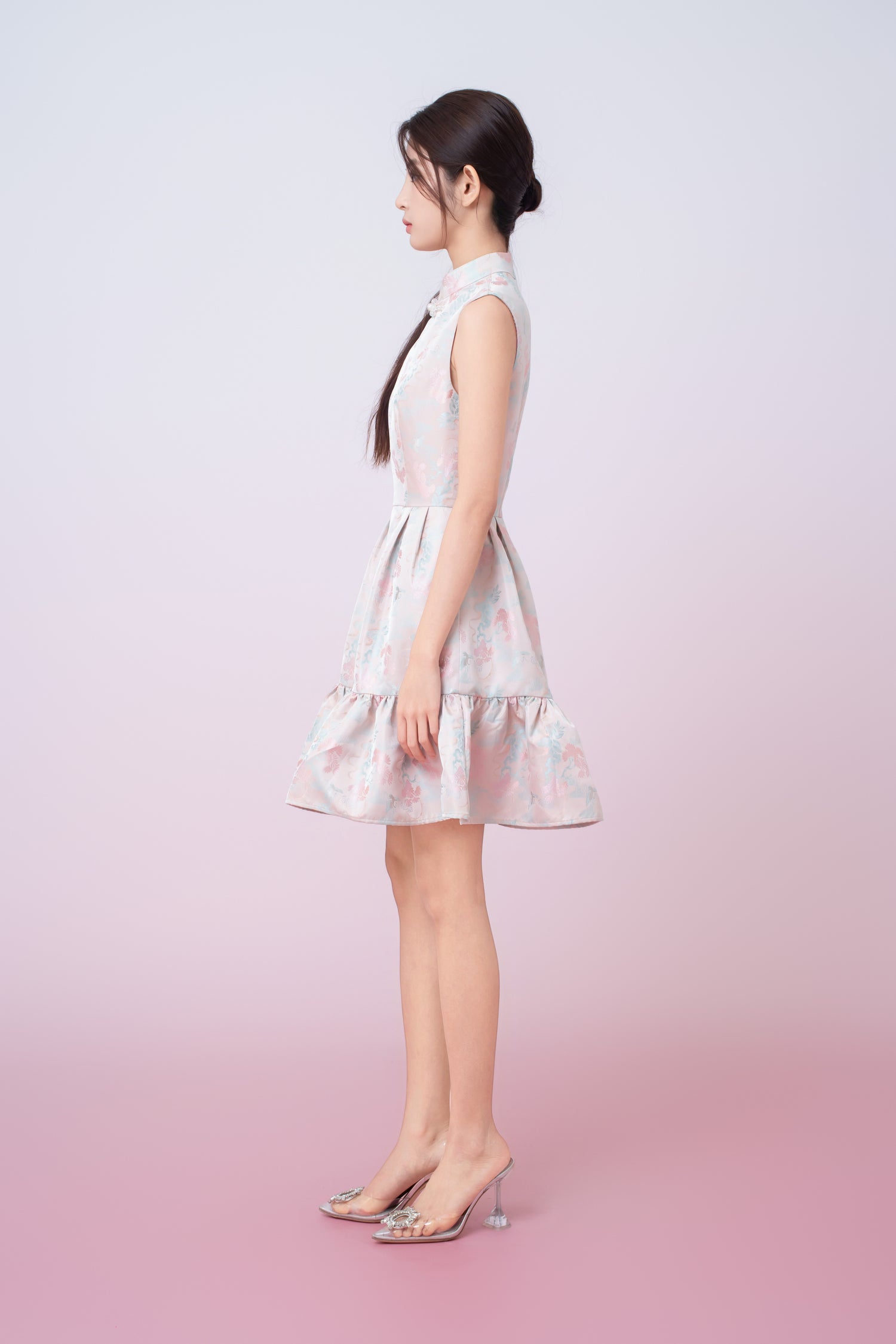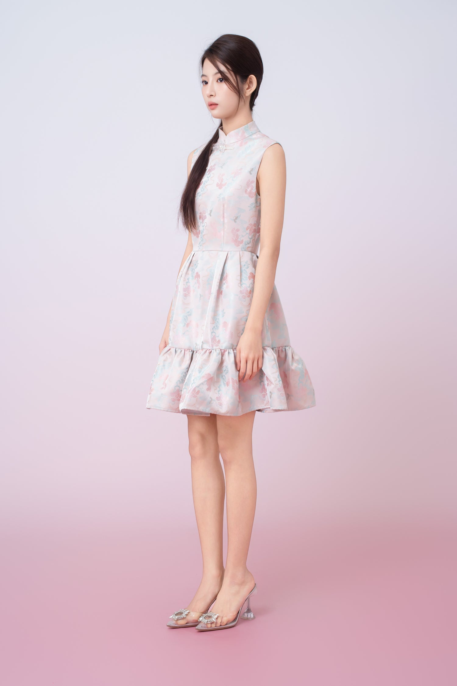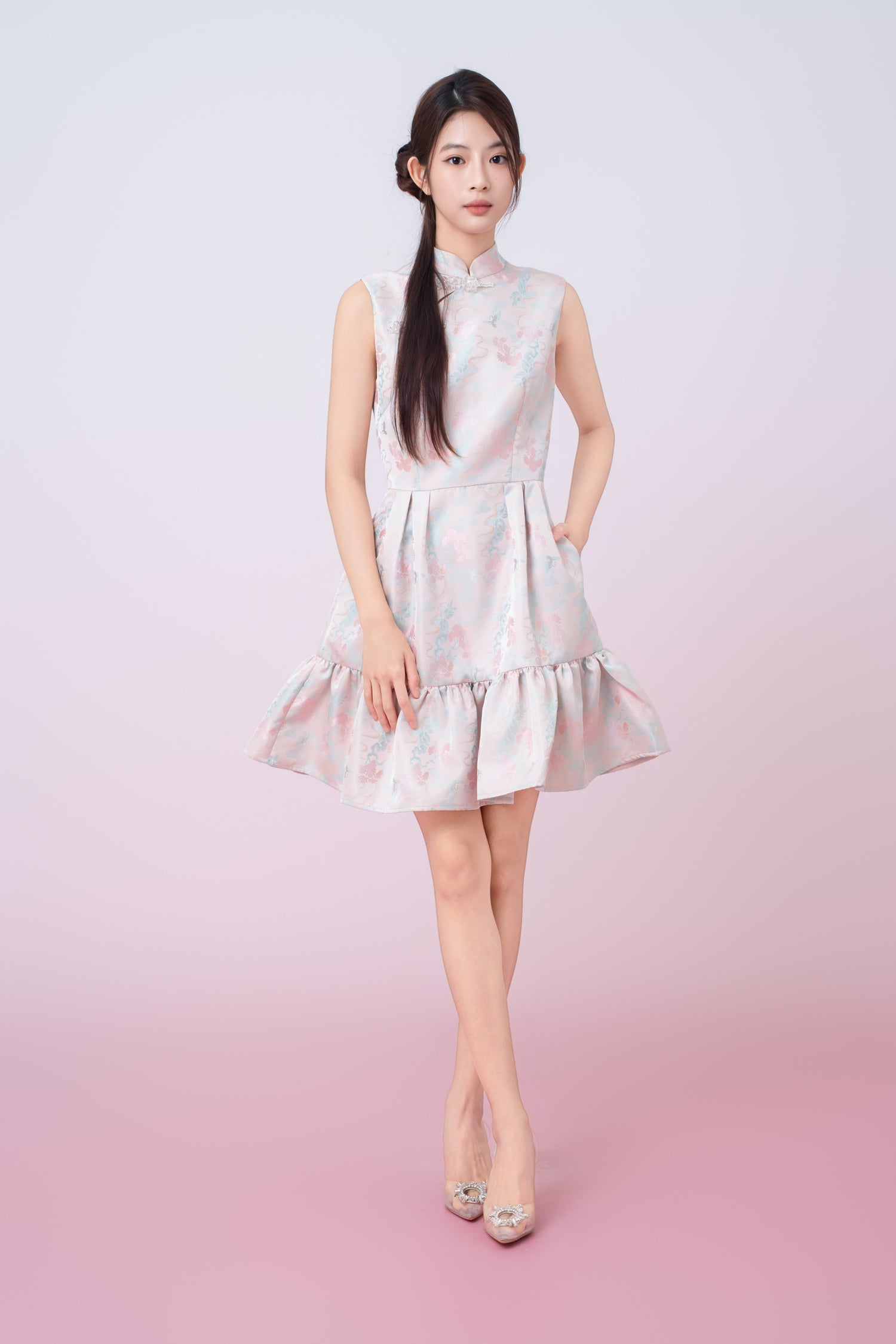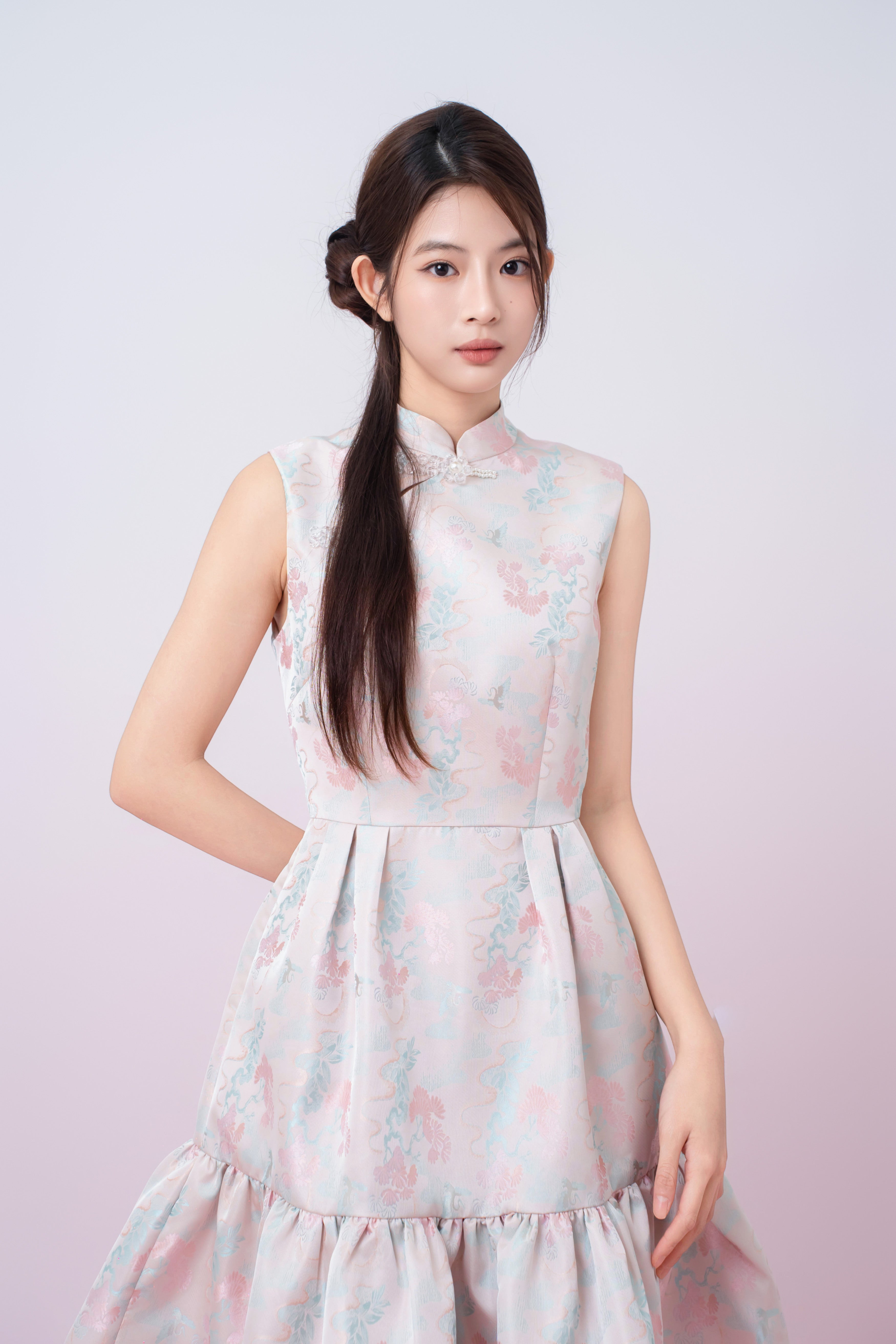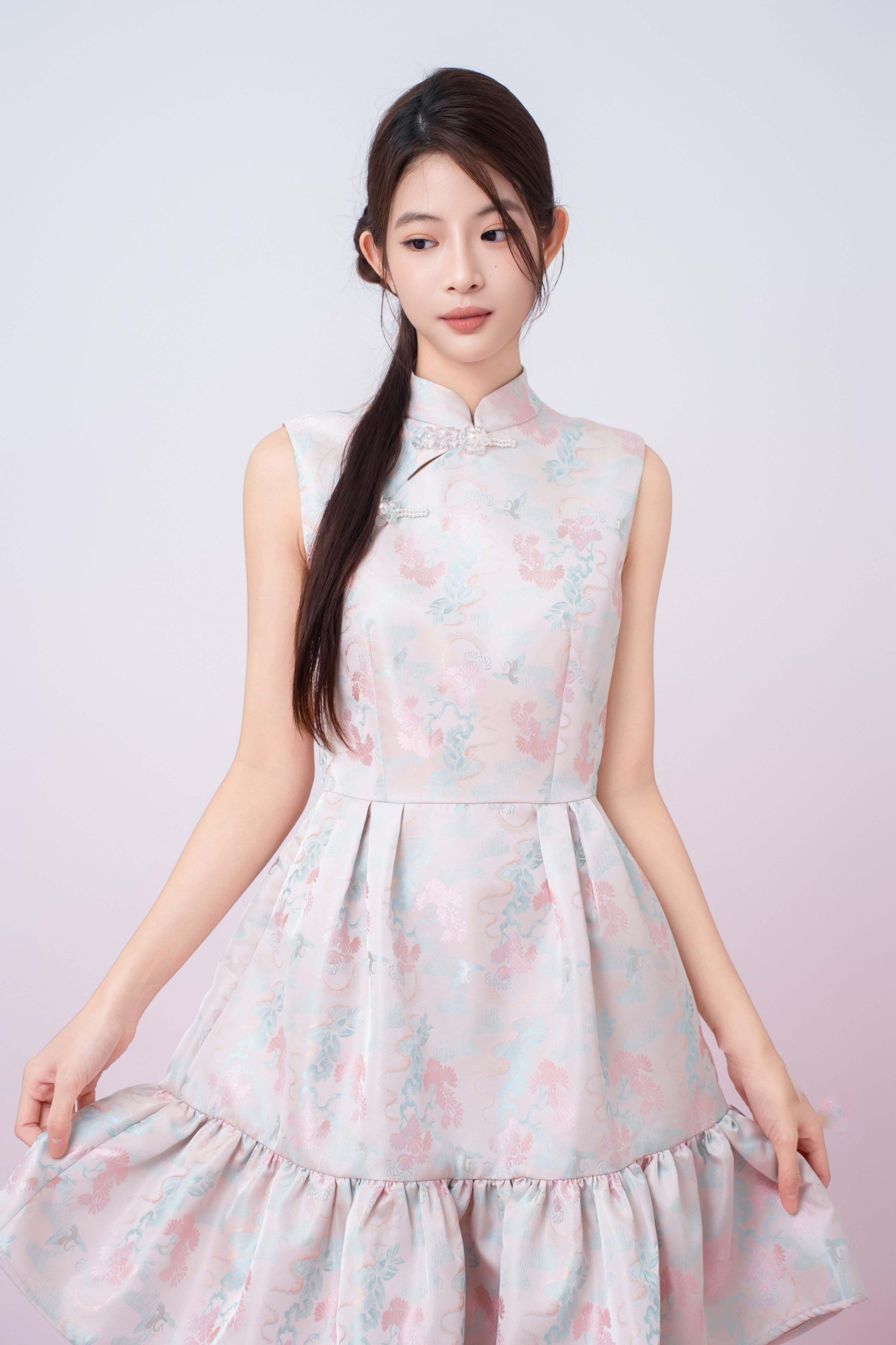 A modern take on oriental elegance,Karina Floral Print in Blush Pink Jacquard Cheongsam Dress is crafted from a soft satin fabric with delicate pastel floral prints. Designed with a refined mandarin collar and decorative pearl frog buttons, it adds a graceful touch to the overall look. The fitted bodice flows into a tiered ruffle hem, creating gentle movement and a flattering silhouette.