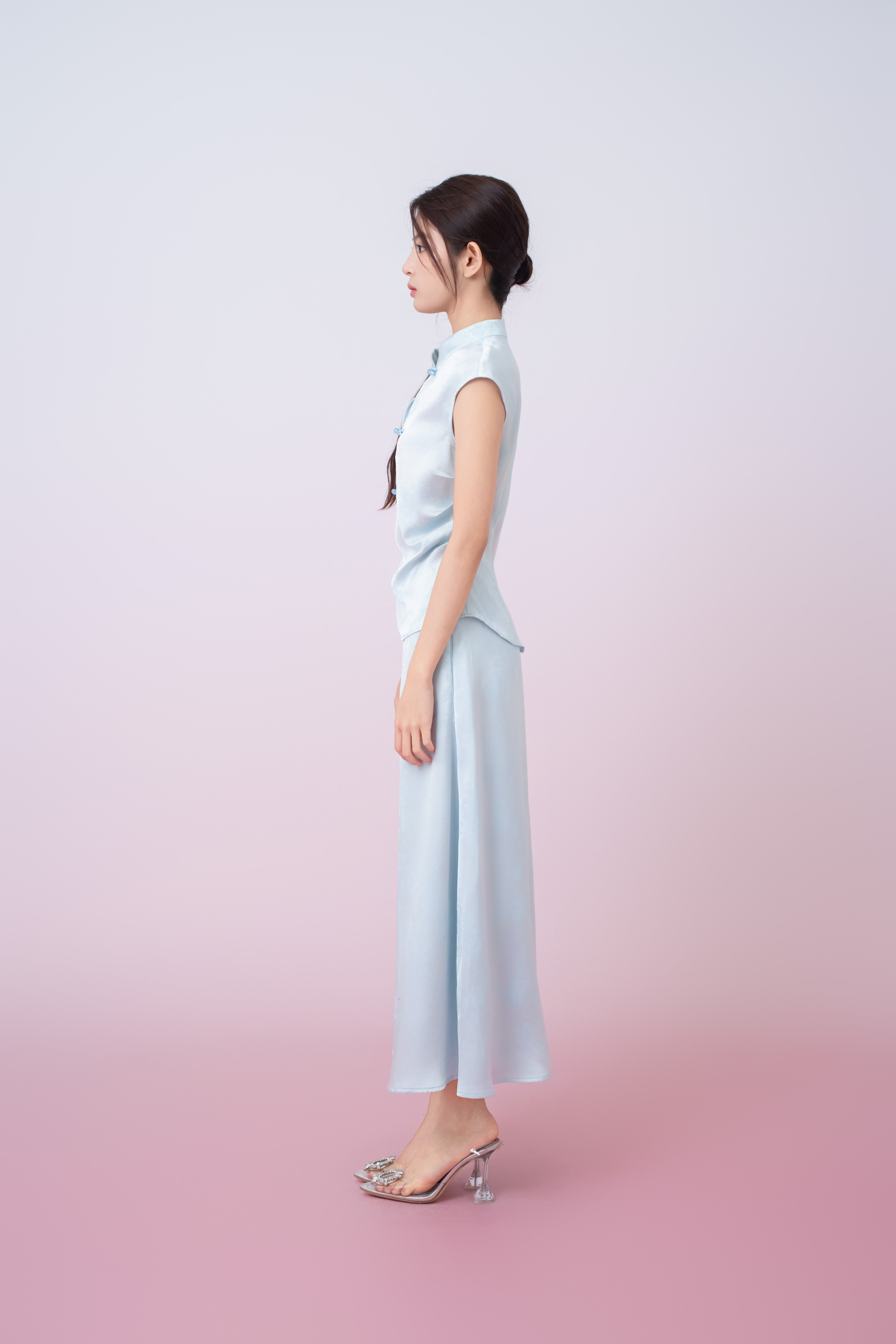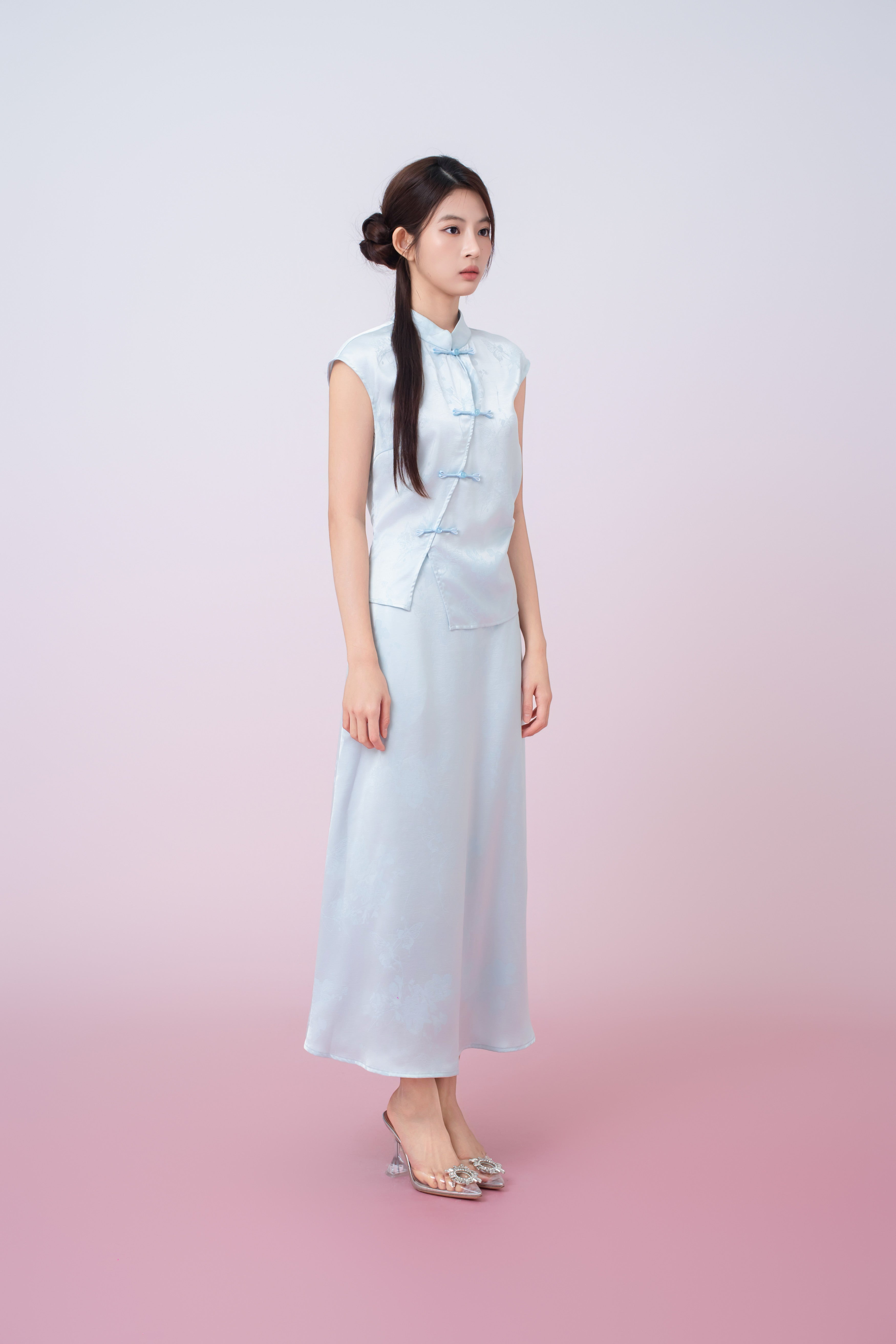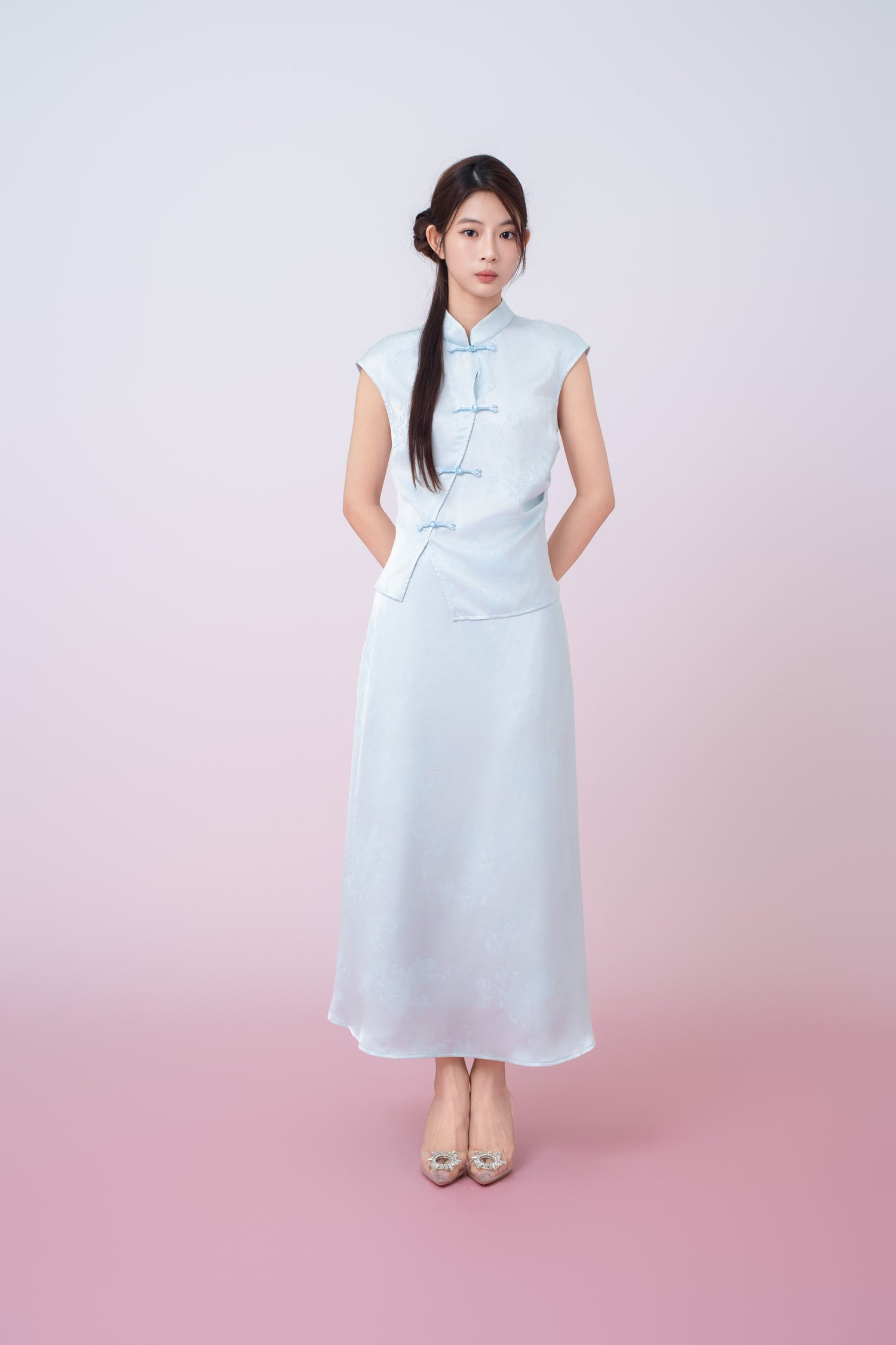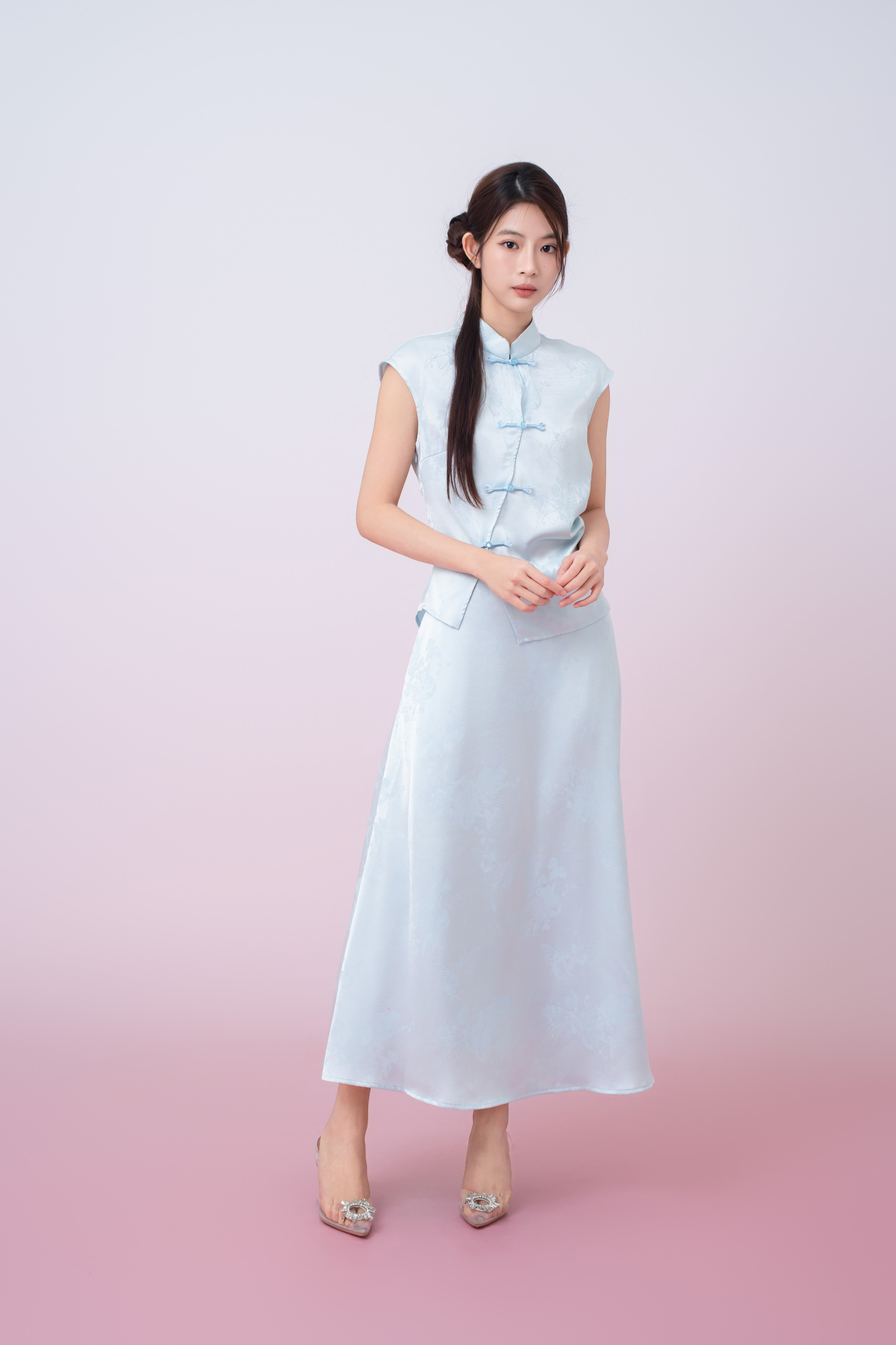Kaylie Light Blue Jacquard A-Line Midi Skirt is crafted from lustrous satin with a subtle woven floral and butterfly jacquard pattern that adds depth and refinement. Designed with a clean, streamlined silhouette, it drapes fluidly over the body for a flattering and feminine fit. The smooth waistband offers a minimalist finish, making it a versatile piece that transitions effortlessly from day to evening wear.