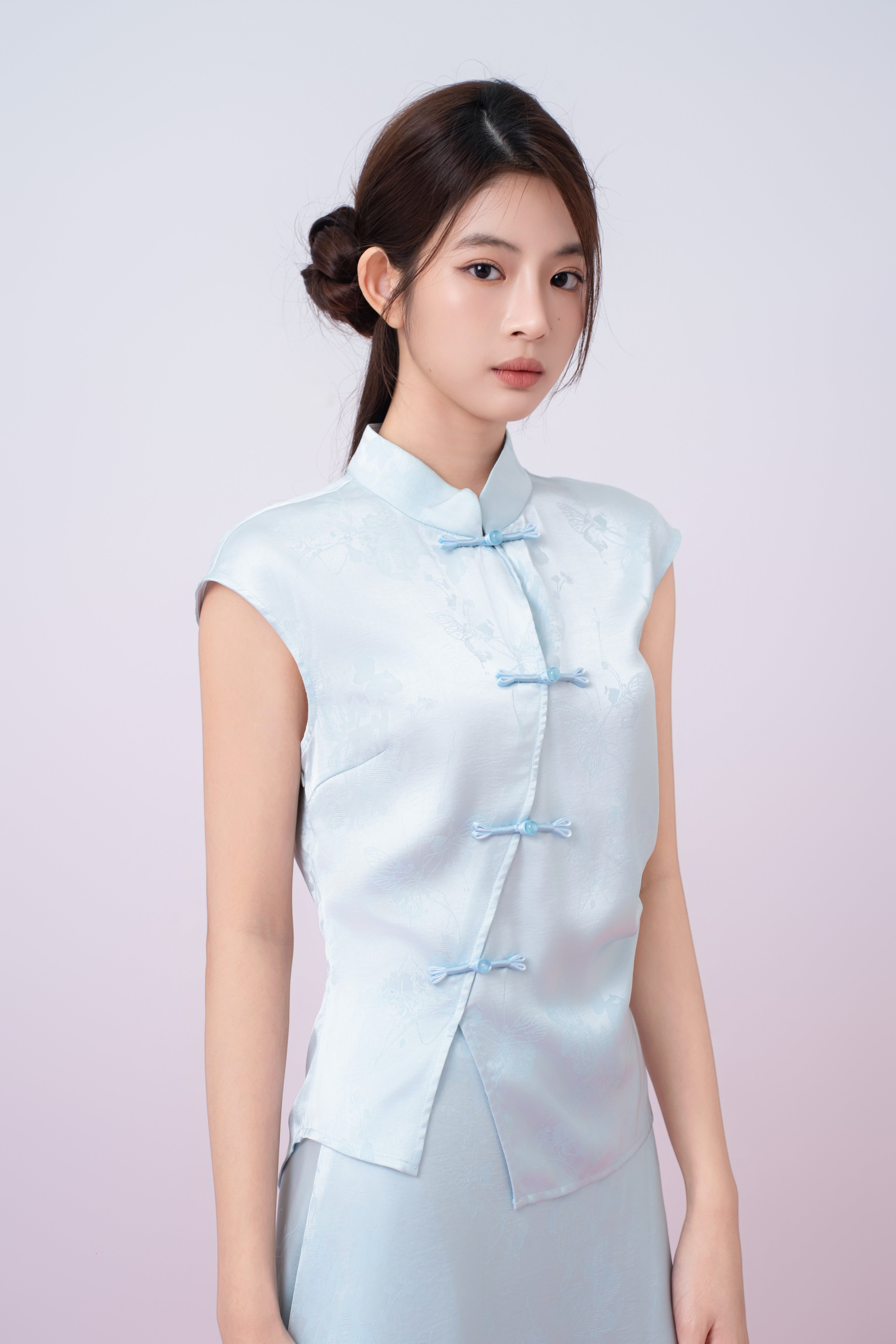 Kaylie Light Blue Jacquard Asymmetrical Cheongsam Top blends traditional Eastern design with modern elegance. Crafted from a silky jacqaurd fabric, it features a soft sheen and an all-over subtle jacquard floral and butterfly pattern that adds texture and sophistication. The classic mandarin collar and asymmetric side closure are accented with delicate frog button fastenings, creating a timeless cheongsam-inspired silhouette. A slightly flared hem with a small side slit enhances comfort and movement while maintaining a tailored look.