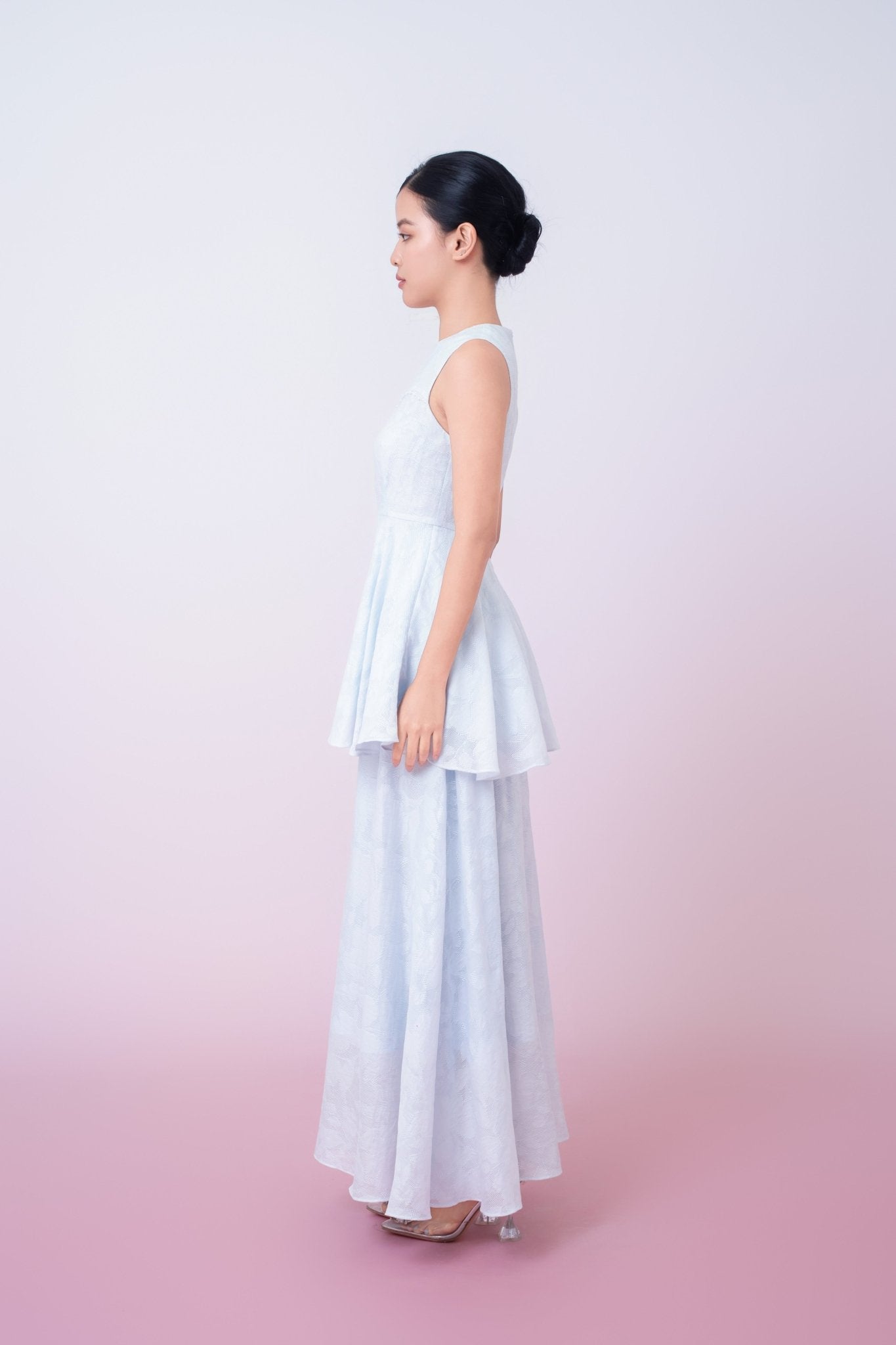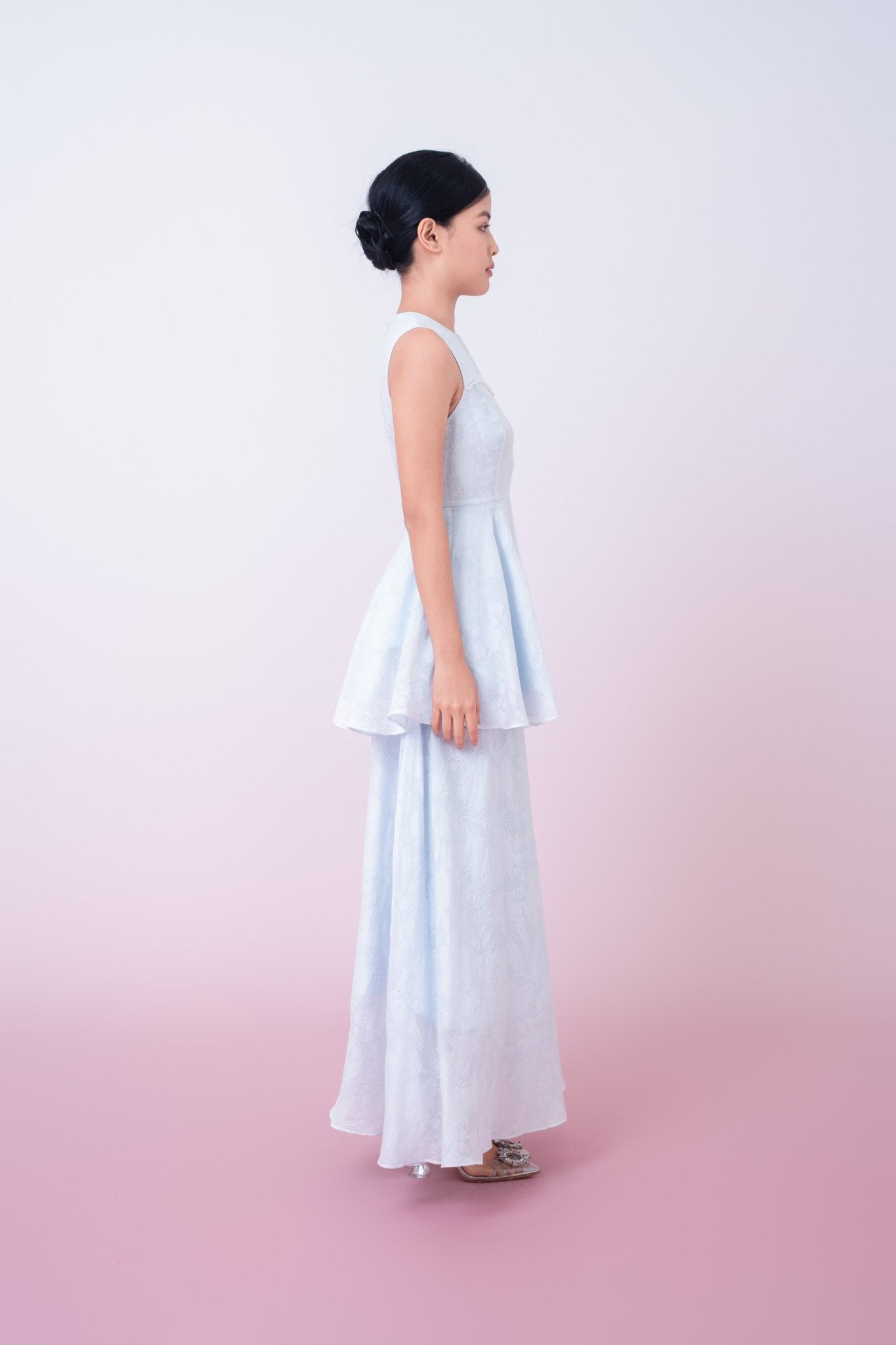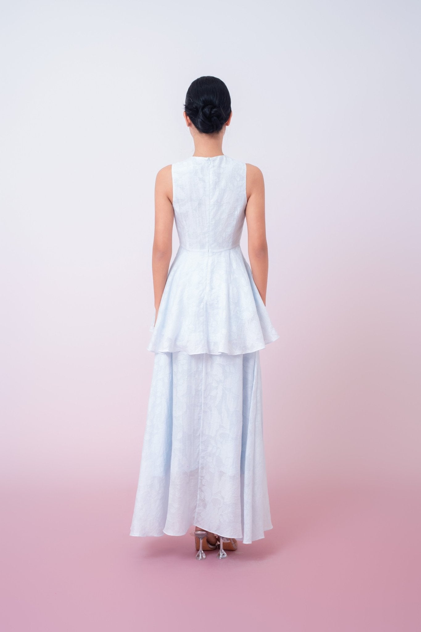 Khloe Blue Jacquard Long Skirt is crafted from textured floral jacquard fabric that offers a subtle sheen and refined depth. Designed with a clean high-waist silhouette, it gently flares into a flowing A-line shape, creating graceful movement and a flattering fit. The minimalist construction allows the delicate woven pattern to take center stage. Lightweight yet structured, this skirt transitions effortlessly from daytime sophistication to polished evening wear.