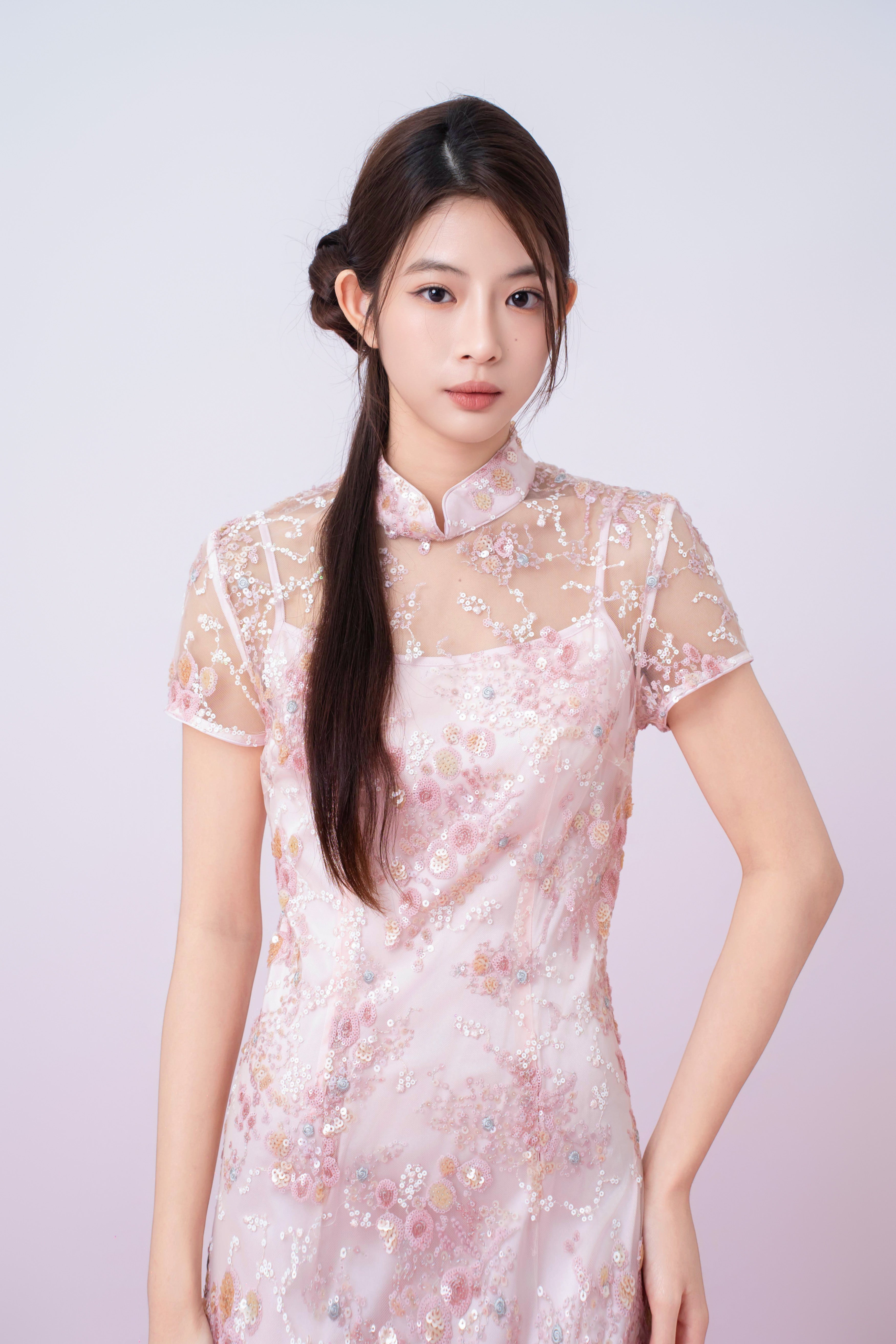 Kimber Light Pink Floral Sequins Cheongsam Dress is a celebration of elegance and intricate craftsmanship. Designed with a delicate sheer lace overlay, it features ornate floral embroidery embellished with subtle sequins that create a soft, luminous shimmer. The classic mandarin collar and traditional button detailing reflect timeless oriental aesthetics, while the fitted silhouette enhances a graceful, feminine profile. Short sleeves and a midi-to-maxi length balance sophistication with wearability, making this dress ideal for formal occasions, weddings, banquets, or evening events. The layered design adds depth and texture, offering a refined statement look.