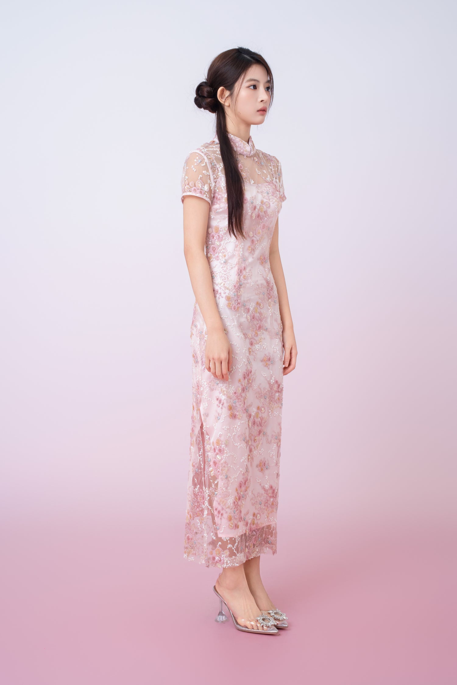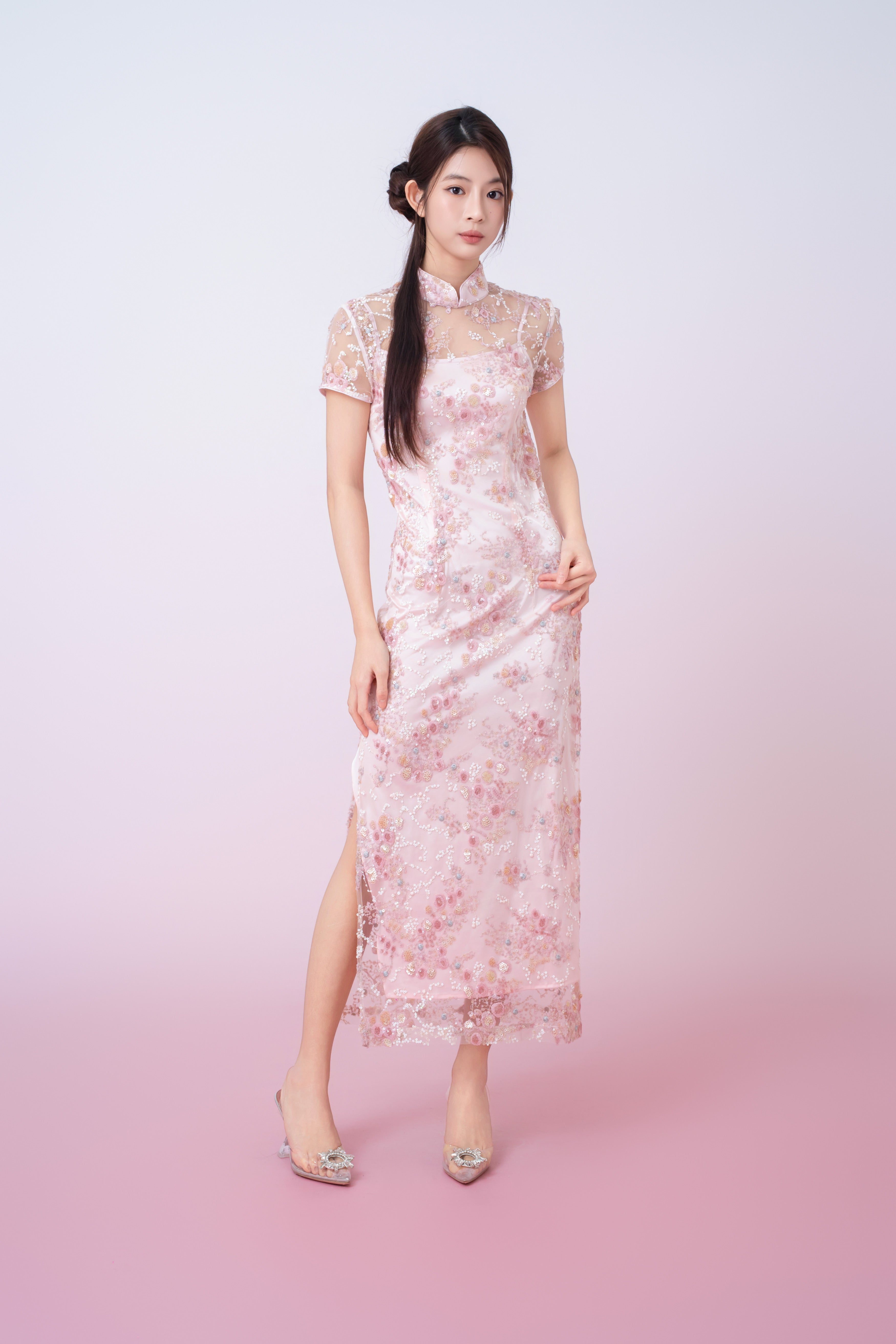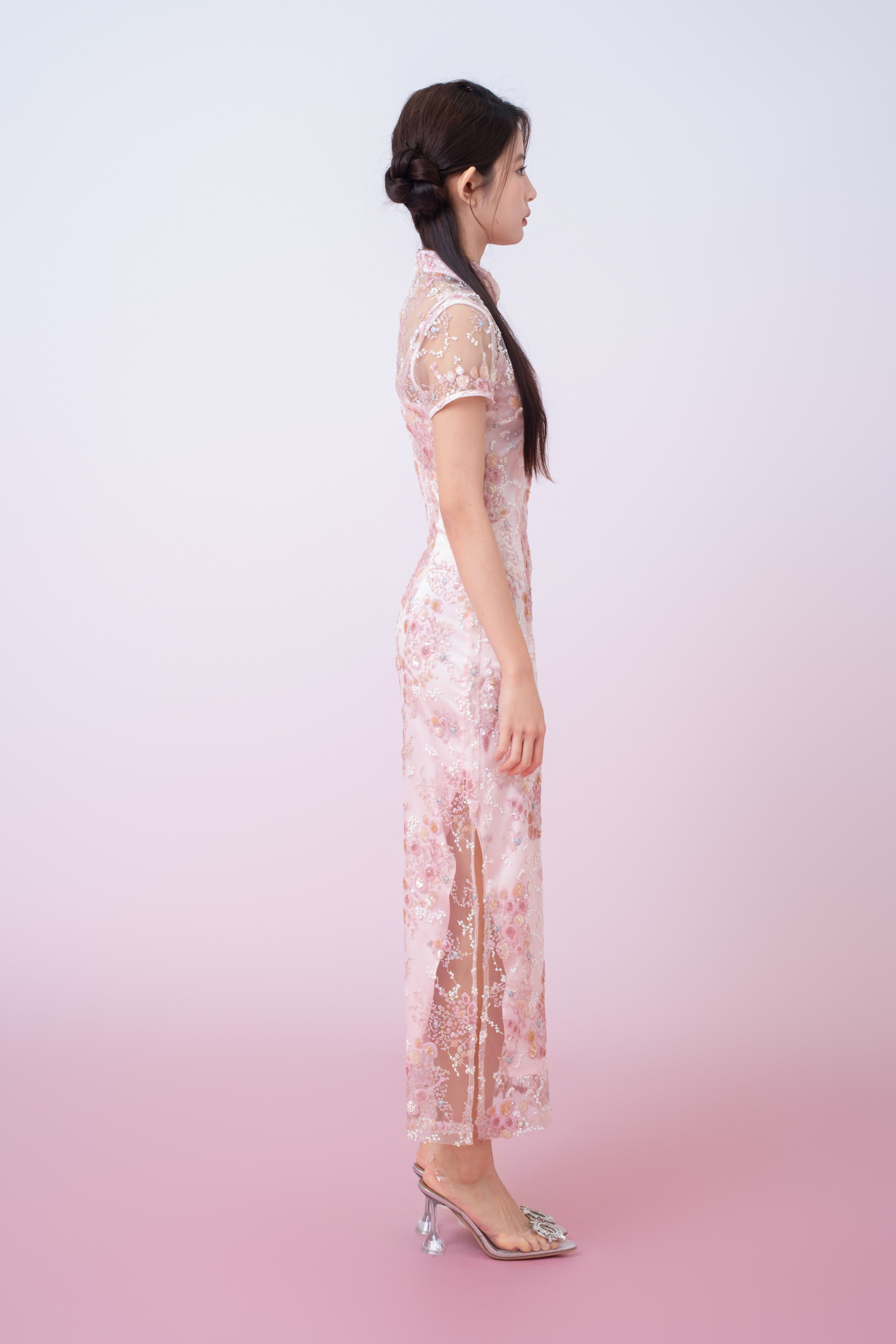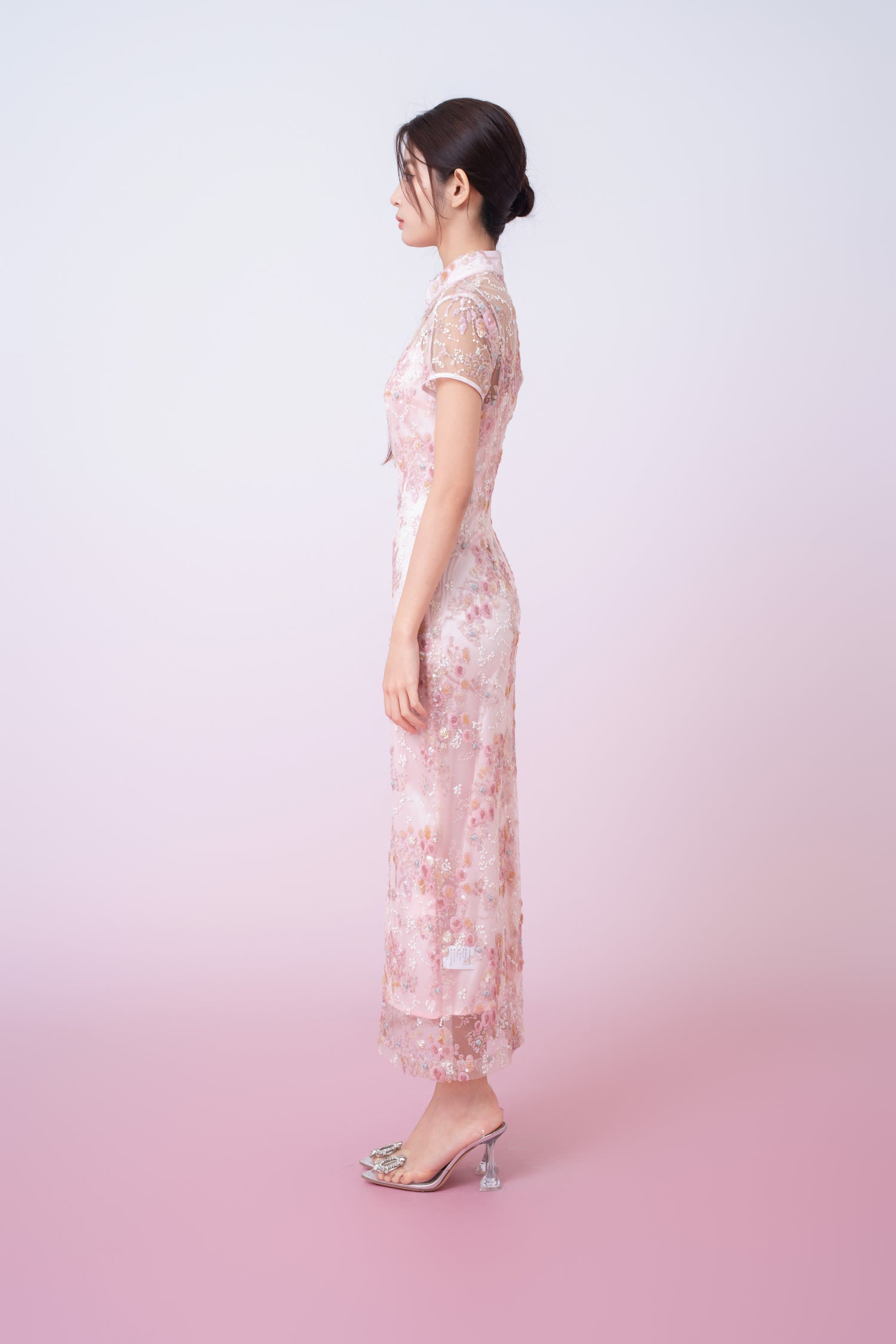 Kimber Light Pink Floral Sequins Cheongsam Dress