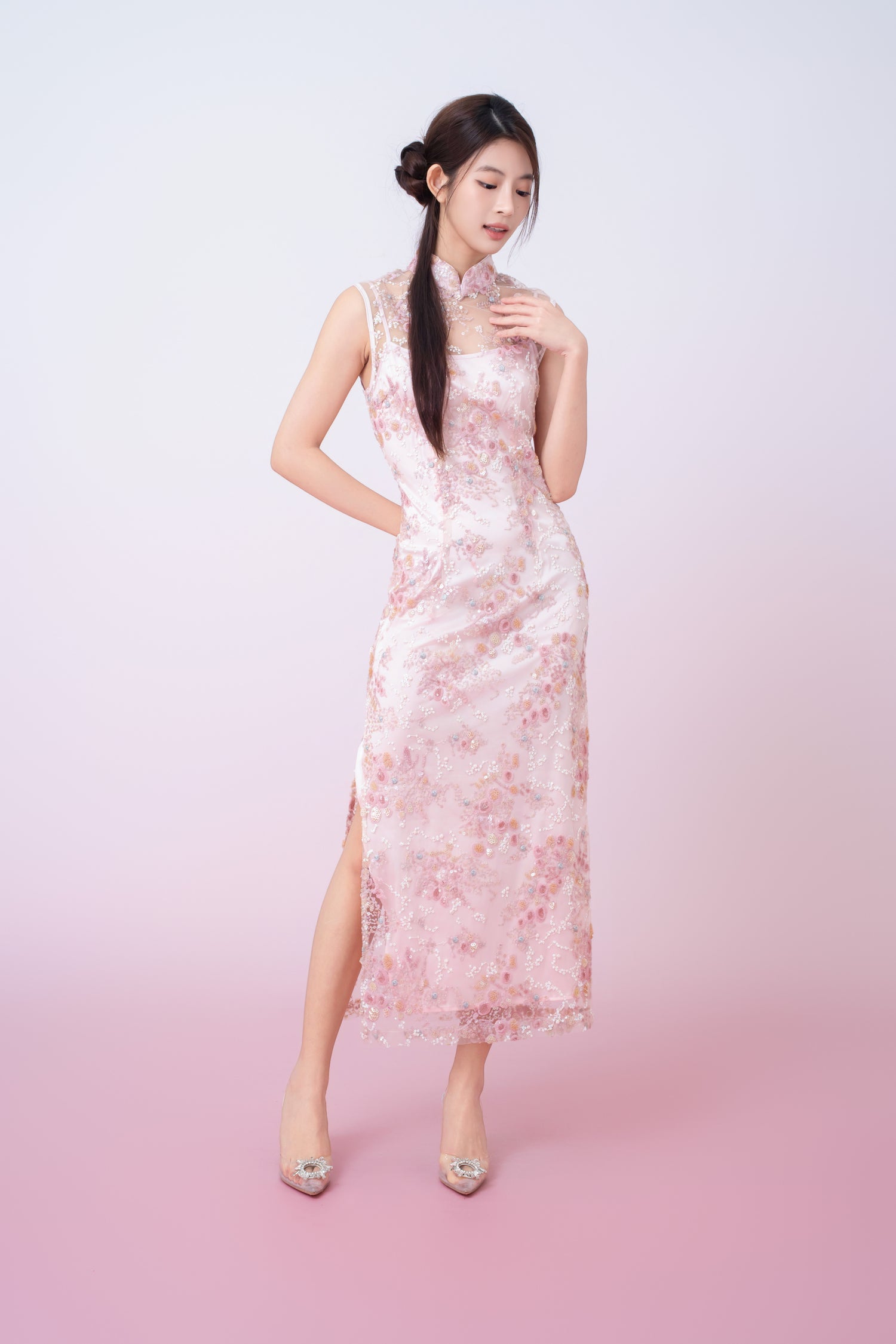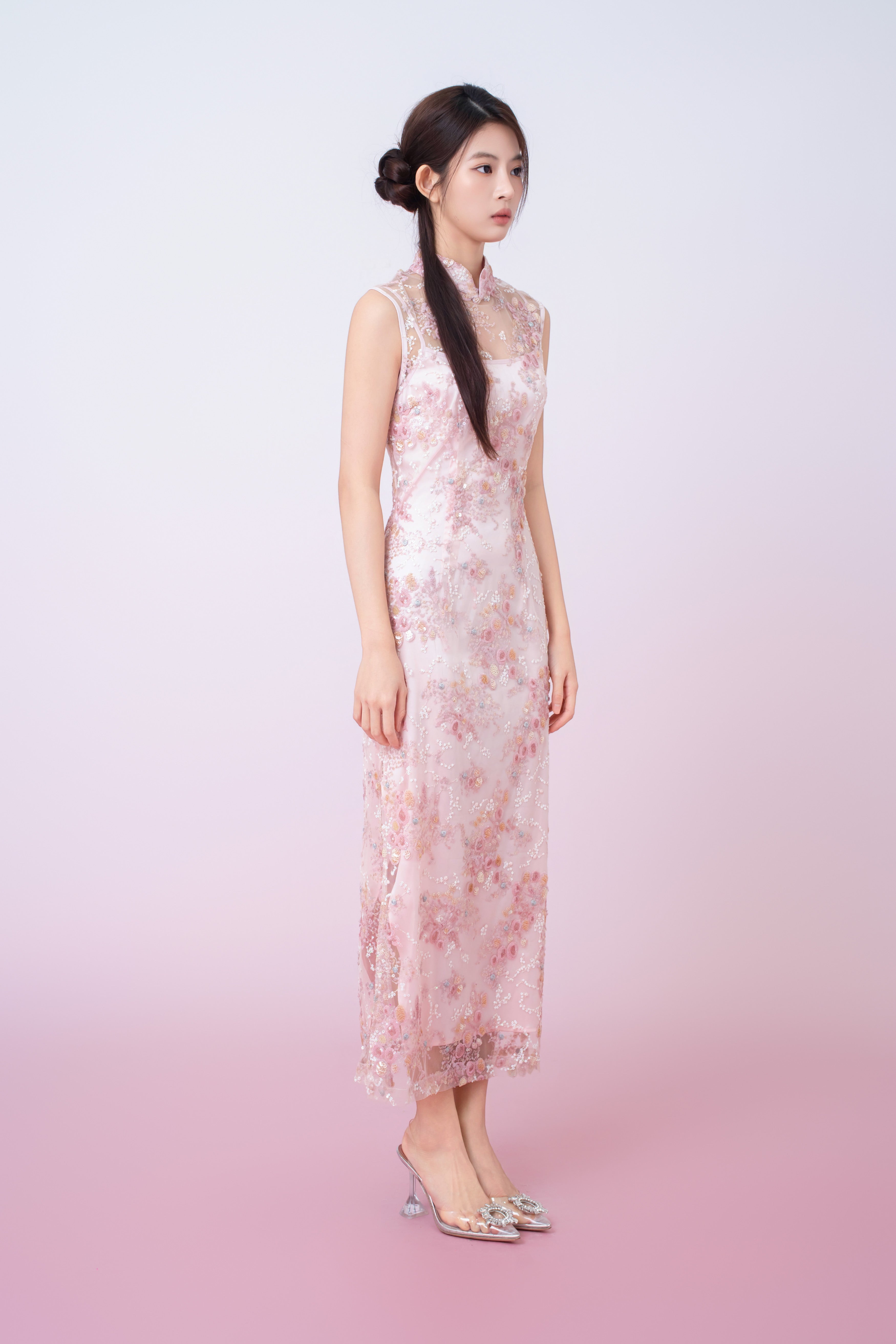 Kimber Light Pink Floral Sequins Sleeveless Cheongsam Dress blends traditional charm with refined modernity. Crafted with a delicate sheer lace overlay, it is adorned with intricate floral embroidery and subtle sequin detailing that adds a soft, radiant shimmer. The high mandarin collar and classic button accents celebrate timeless Chinese-inspired design, while the streamlined silhouette enhances a graceful, elongated look.