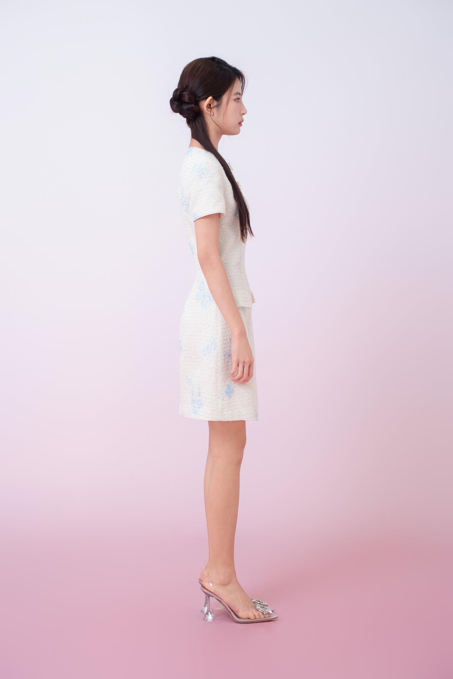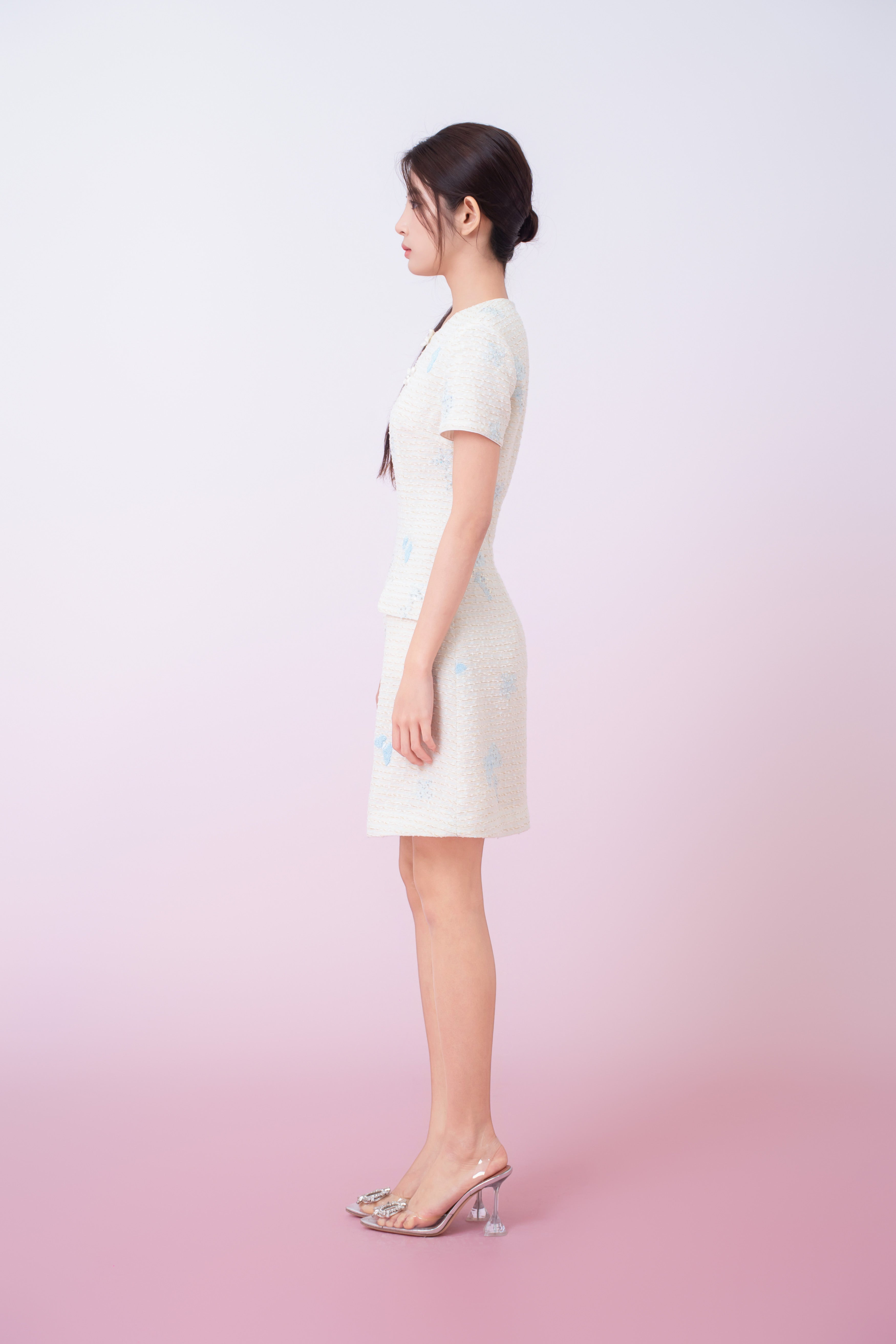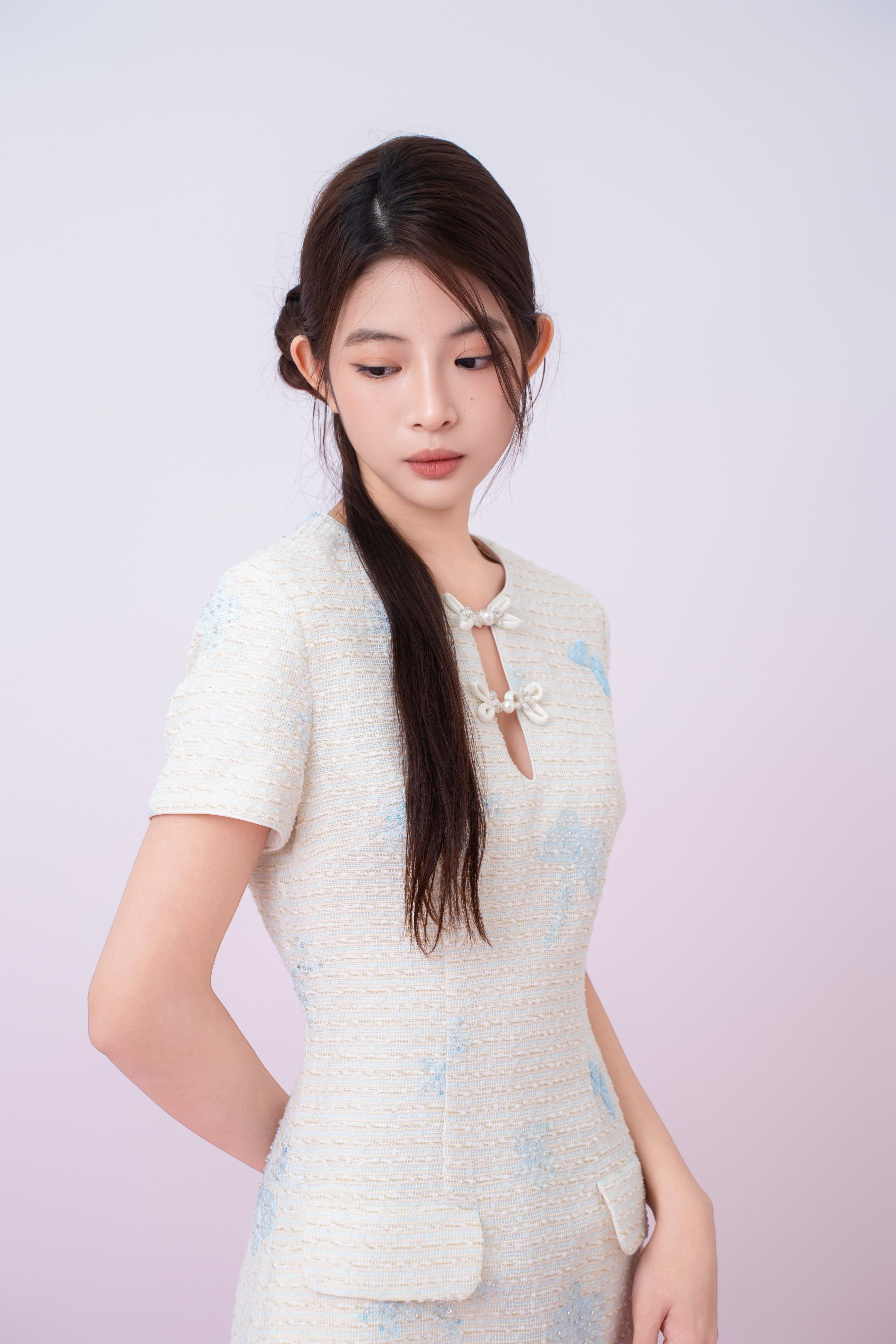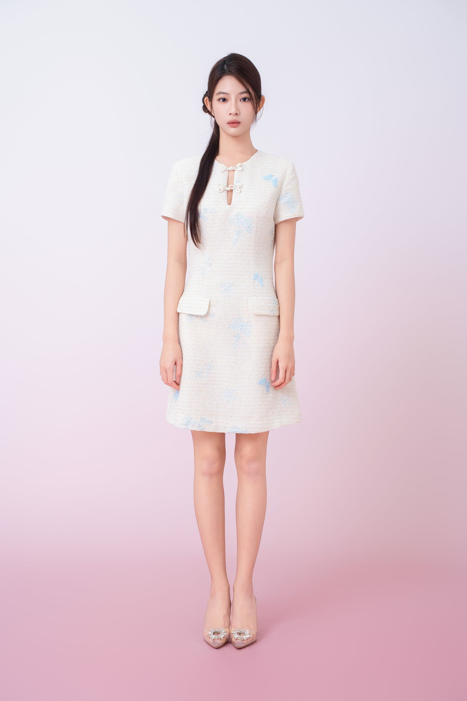 Exude timeless elegance with this beautifully Kori Cream Tweed with Buterfly Embroidery Mini Cheongsam Dress in a soft ivory tone. Made from a richly textured fabric, the design is accented with delicate butterfly motifs that add a subtle touch of charm and femininity. The round neckline is enhanced with decorative pearl-style knot buttons, lending a refined, classic appeal. Featuring a gently tailored silhouette with functional front pockets, this dress balances sophistication with everyday wearability, making it perfect for both daytime occasions and polished evening looks.