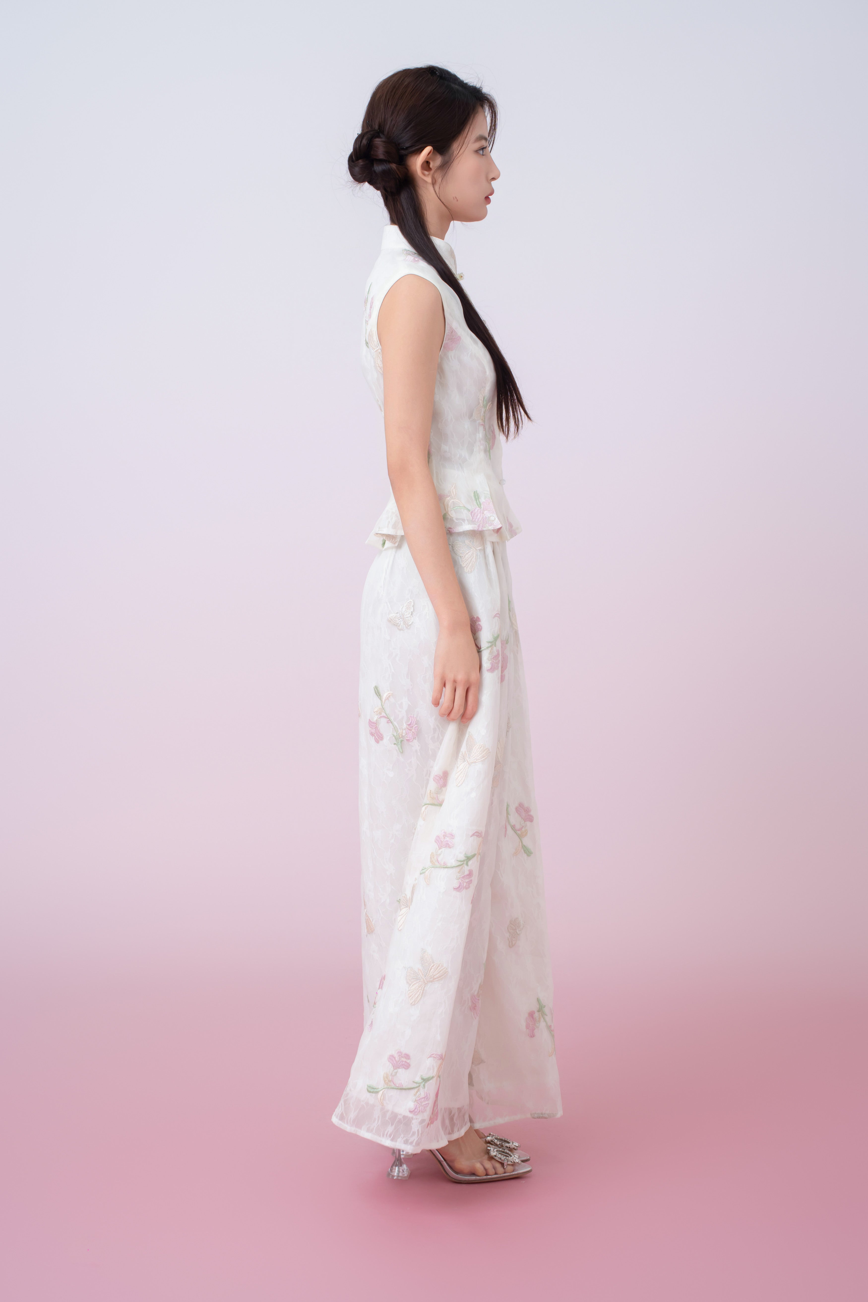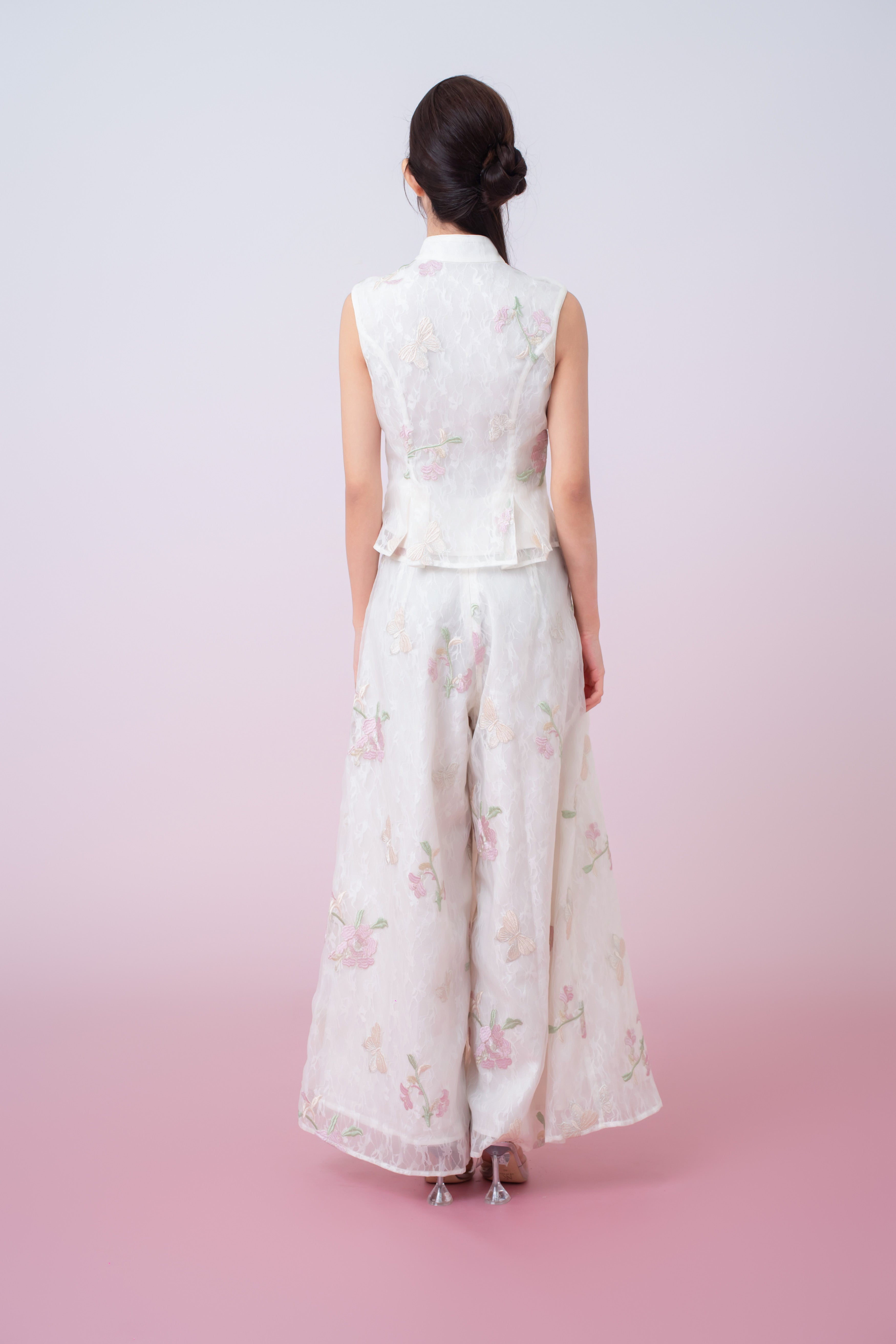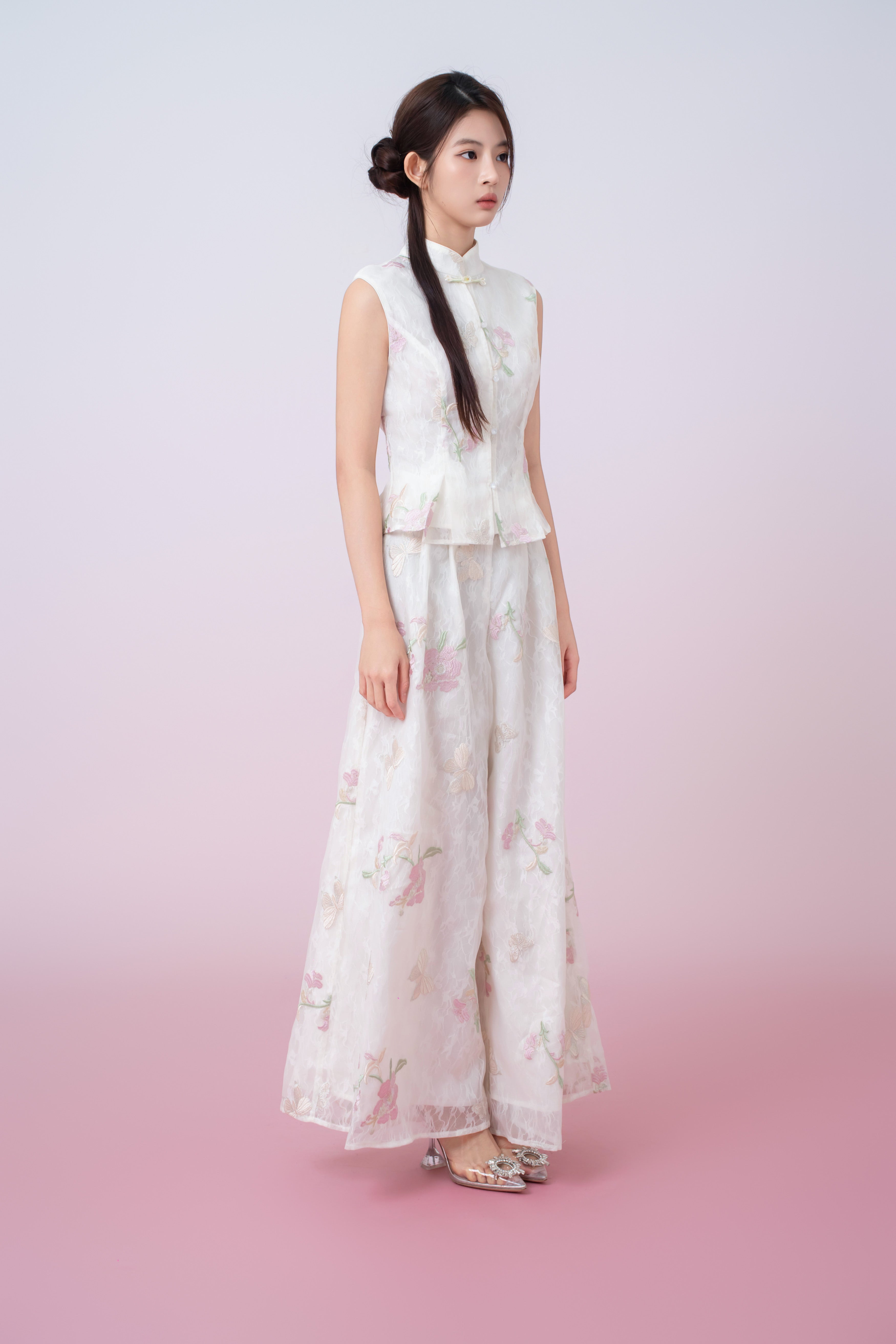 This graceful Kylee Ivory Floral Embroidery Peplum Top is crafted from a lightweight sheer fabric with a soft, cloud-like texture that drapes beautifully on the body. Delicate floral embroidery in pastel tones is scattered throughout, creating an airy, romantic aesthetic. The mandarin collar and decorative frog-button detail at the neckline nod to classic Eastern design, while the clean button-front closure keeps the look refined and modern.