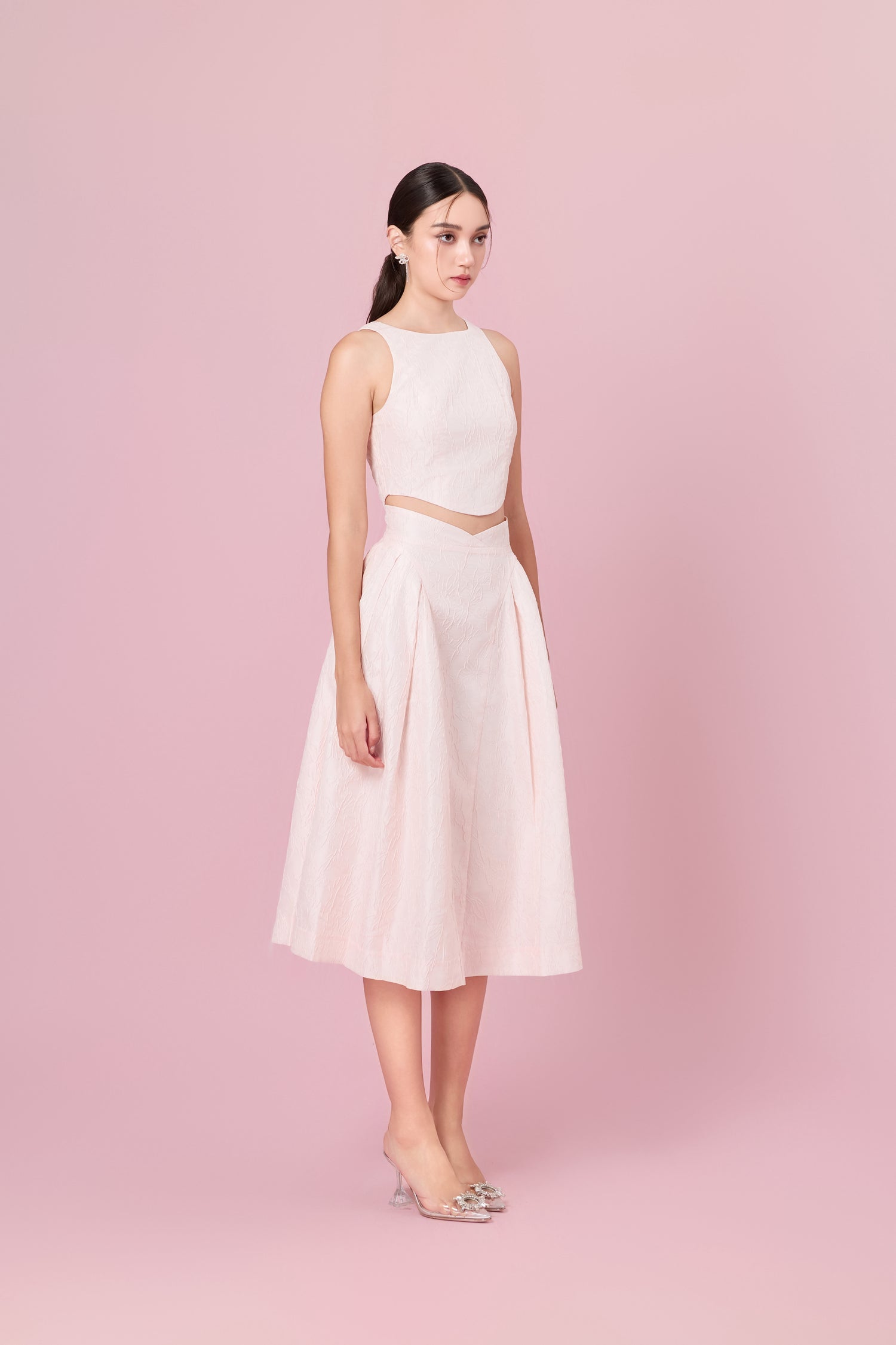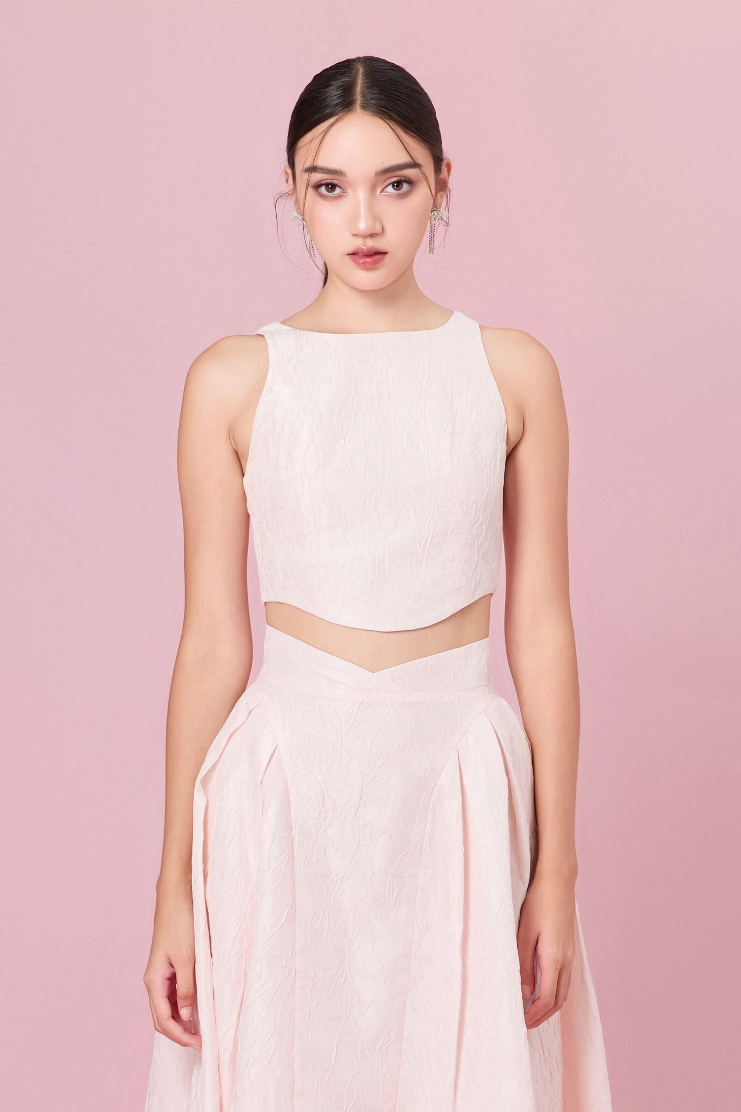 Introducing our Lizea Pink Jacquard Sleeveless Top from luxurious Jacquard fabric, featuring a stylish curved hemline. This cropped top is designed to add a touch of elegance and sophistication to your wardrobe. The Jacquard fabric offers a rich texture and visual interest, while the cropped length and curved hemline create a modern and flattering silhouette.