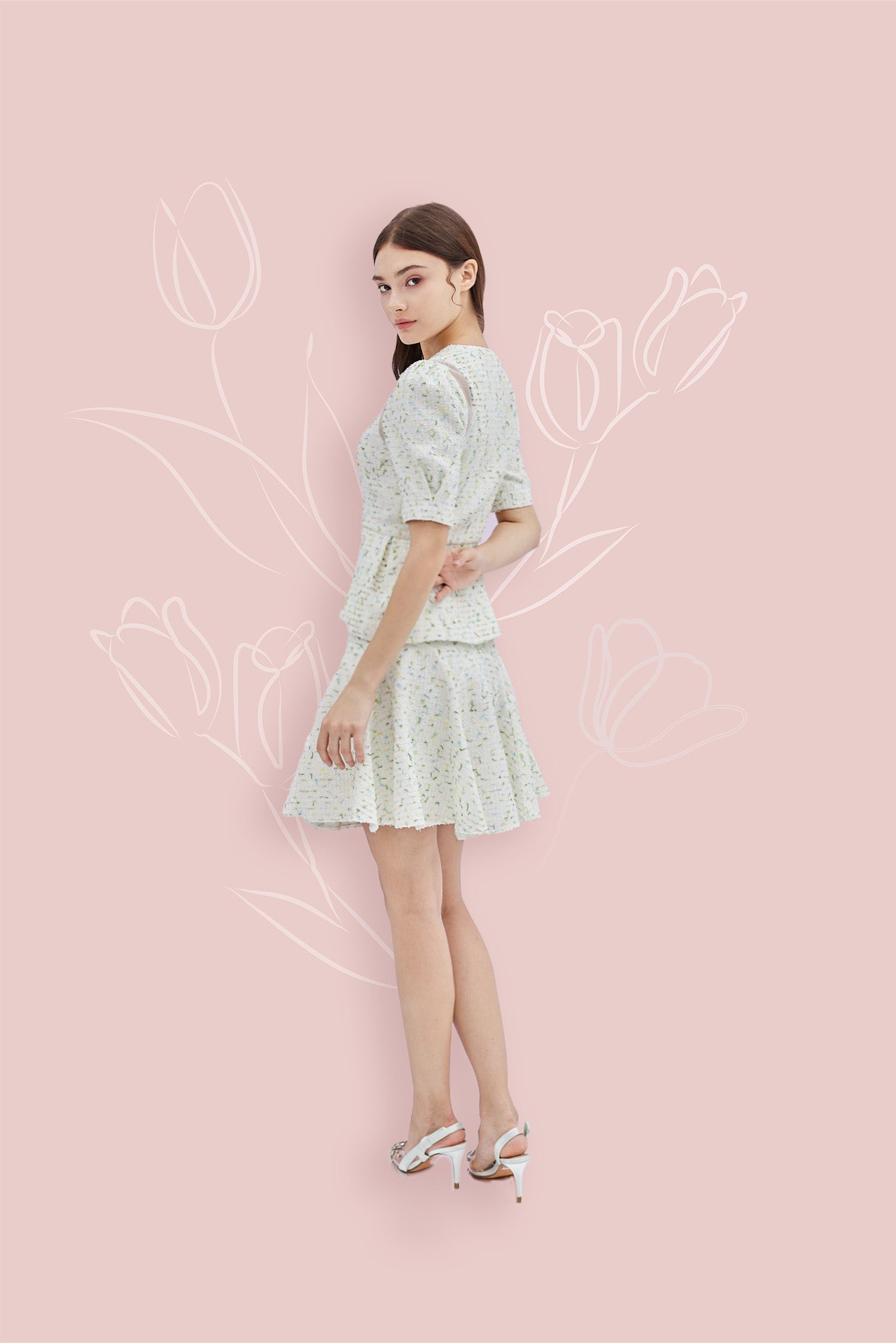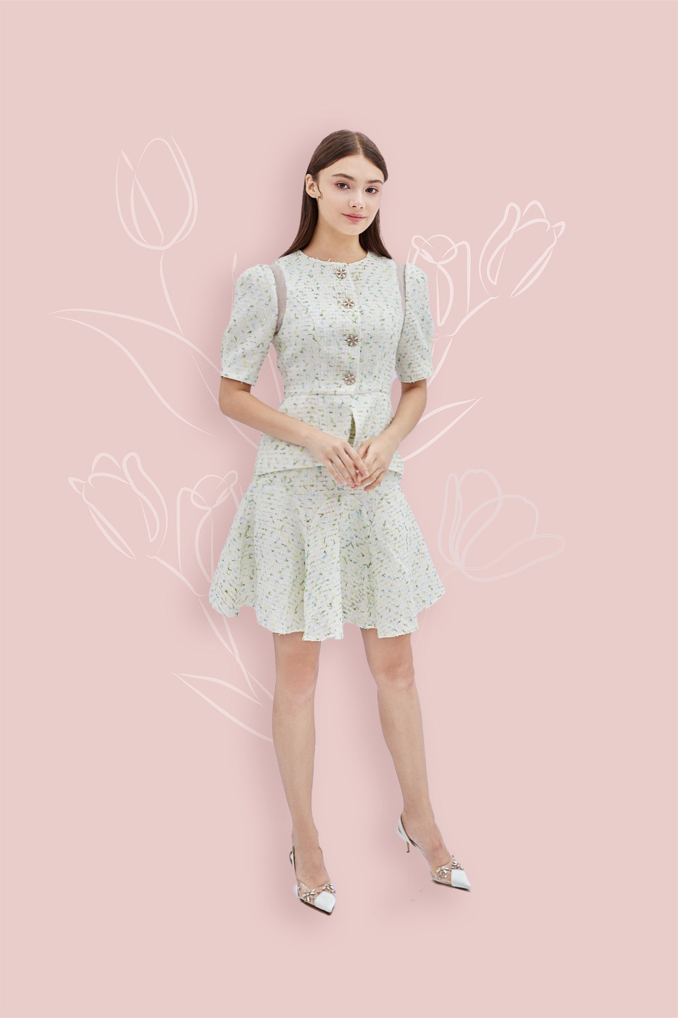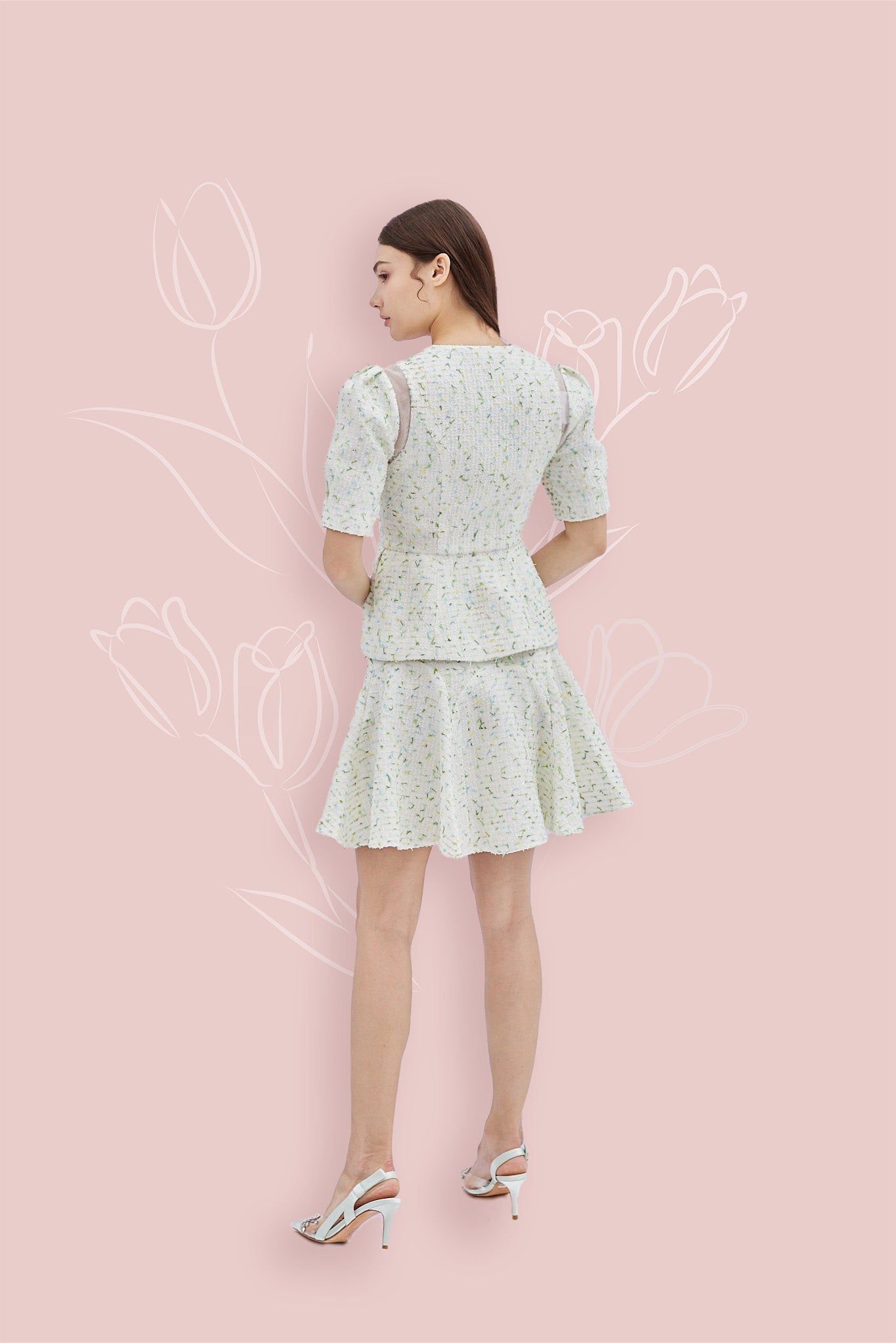 This top is designed to add a touch of elegance and glamour to your wardrobe. The tweed fabric offers a classic and timeless appeal, while the puff sleeves add a playful and feminine touch. The design buttons add a polished and chic accent, and the mesh mix media detail adds a modern and unique flair.