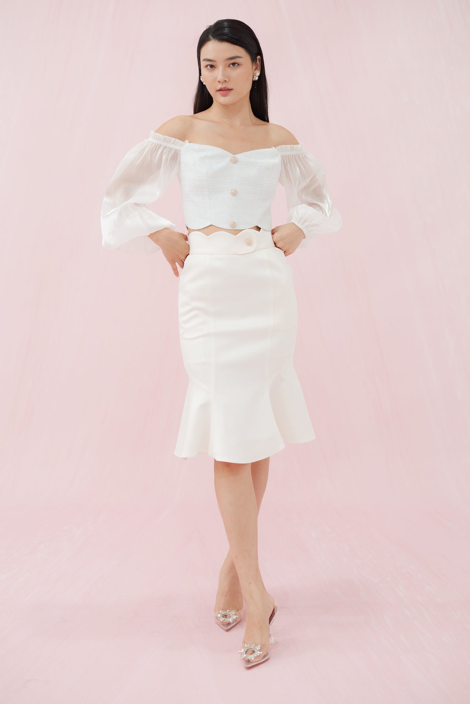 Knee length satin skirt with flattering mermaid silhouette. The skirt is made of luxurious crepe satin material, the perfect weight (does not see through). Designed with faux flower diamond buttoned waistband at the front as details only. Super versatile for any occasion.